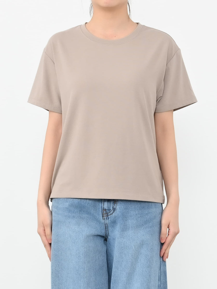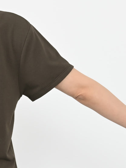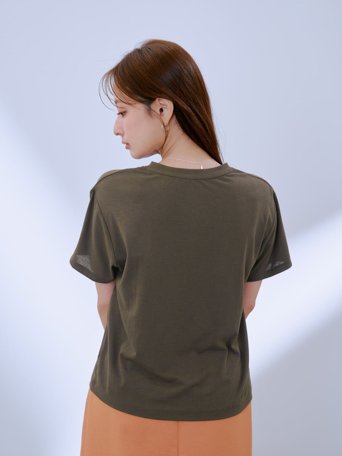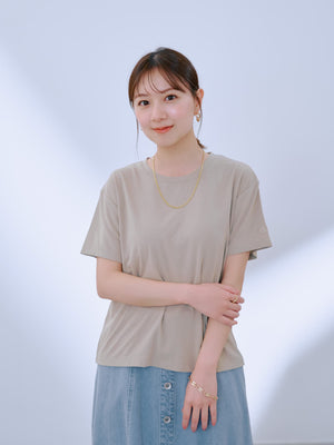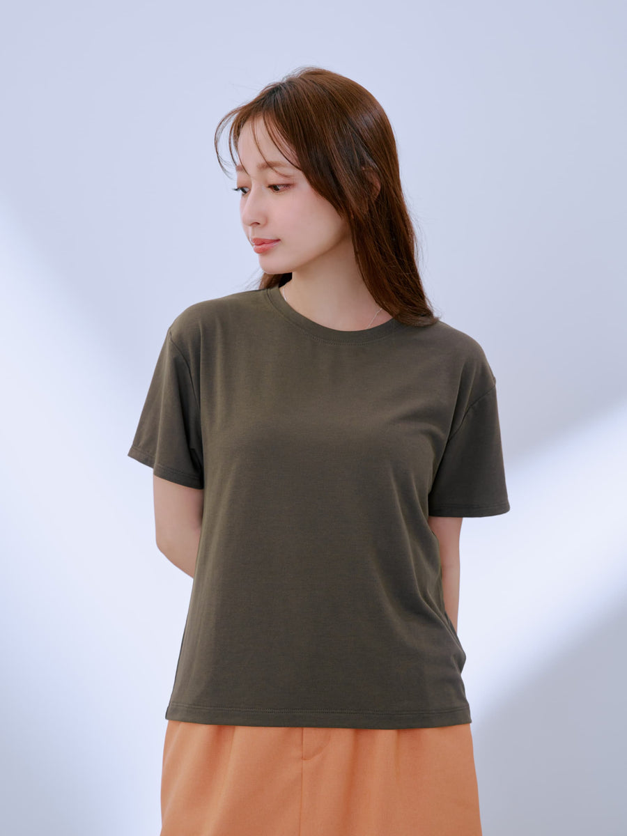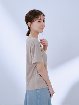 特殊テンセル™繊維と再生ポリエステルを特殊技術で加工。紫外線対策・接触冷感機能・吸水速乾機能を備えています。ほんのりシアー感のあるベア天竺生地は、見た目も着心地も軽やか。柔らかなタッチで肌触りの良さも抜群です。