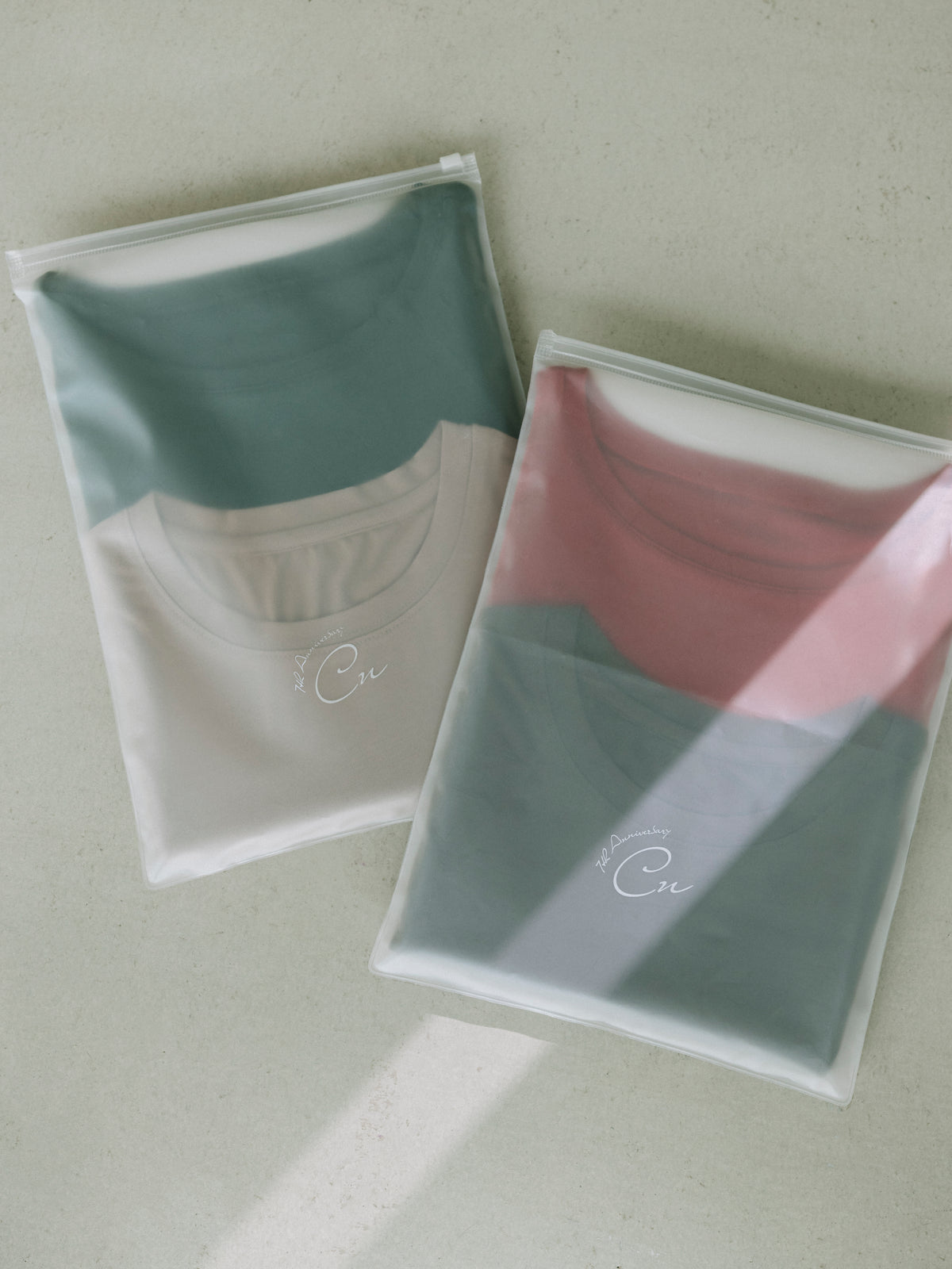 柔らかい素材が心地の良いカットソーです!さりげないお袖のワンポイントがCOHINAらしいTシャツに仕上がっています♡ノースリーブとのセット商品なのでかなり万能に使える予感!この商品ならではのジップ付き袋は旅行などにも持っていけそうで重宝すること間違いなしです!