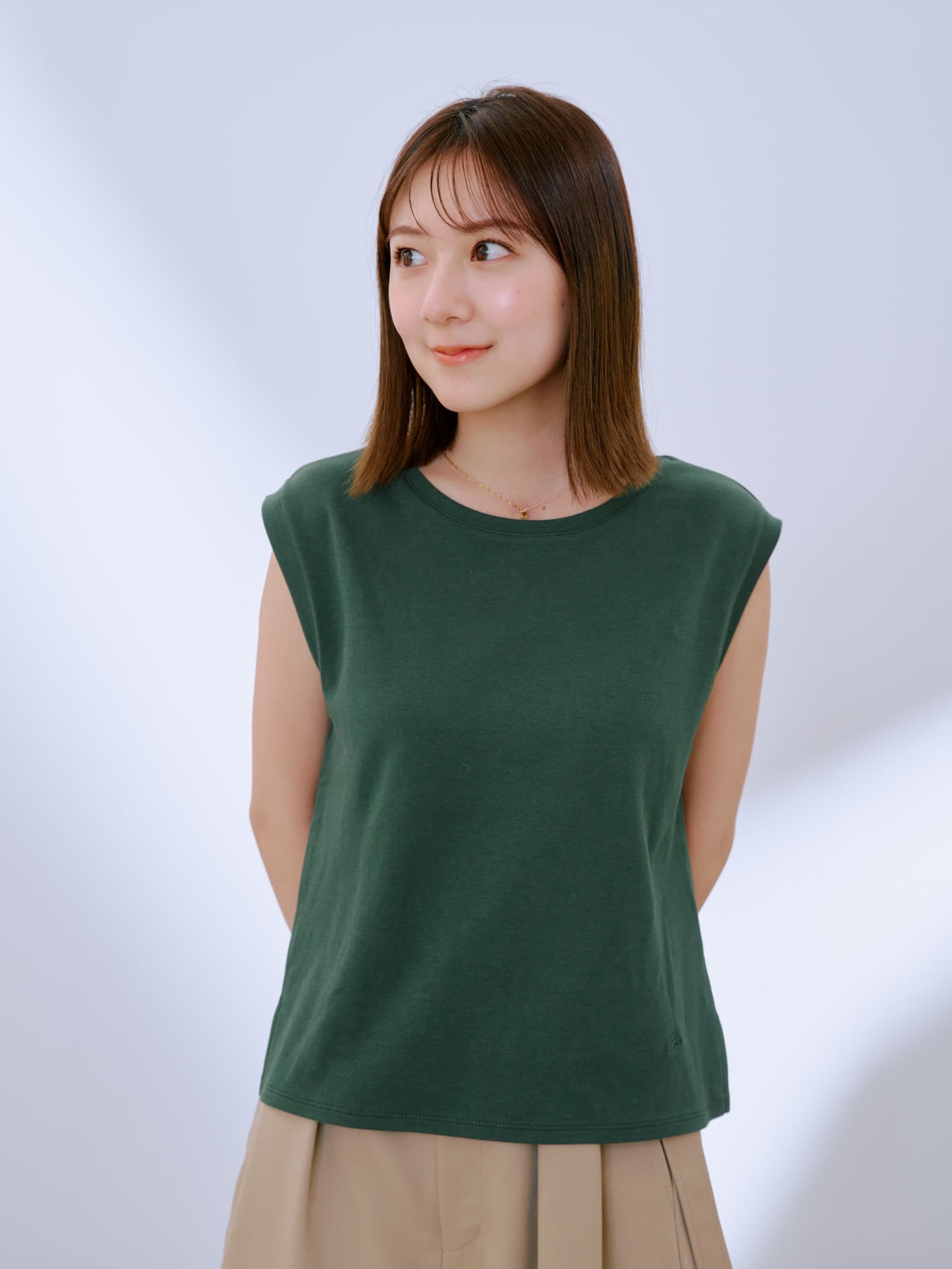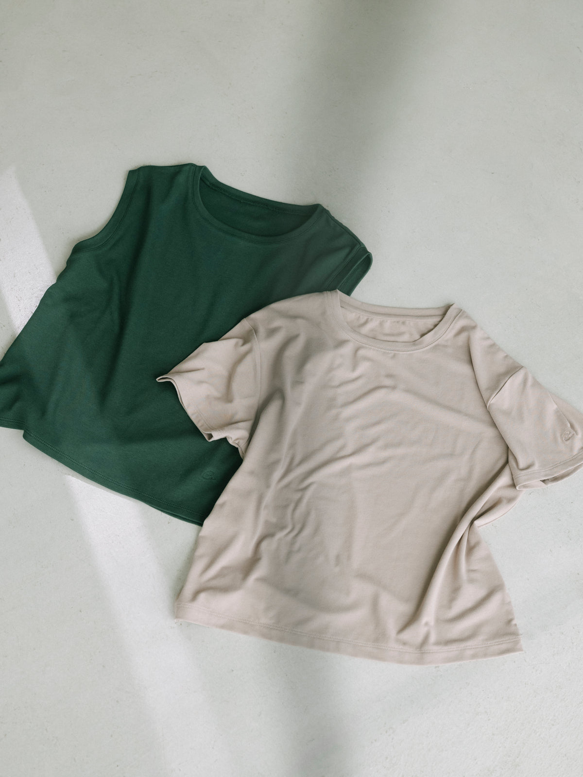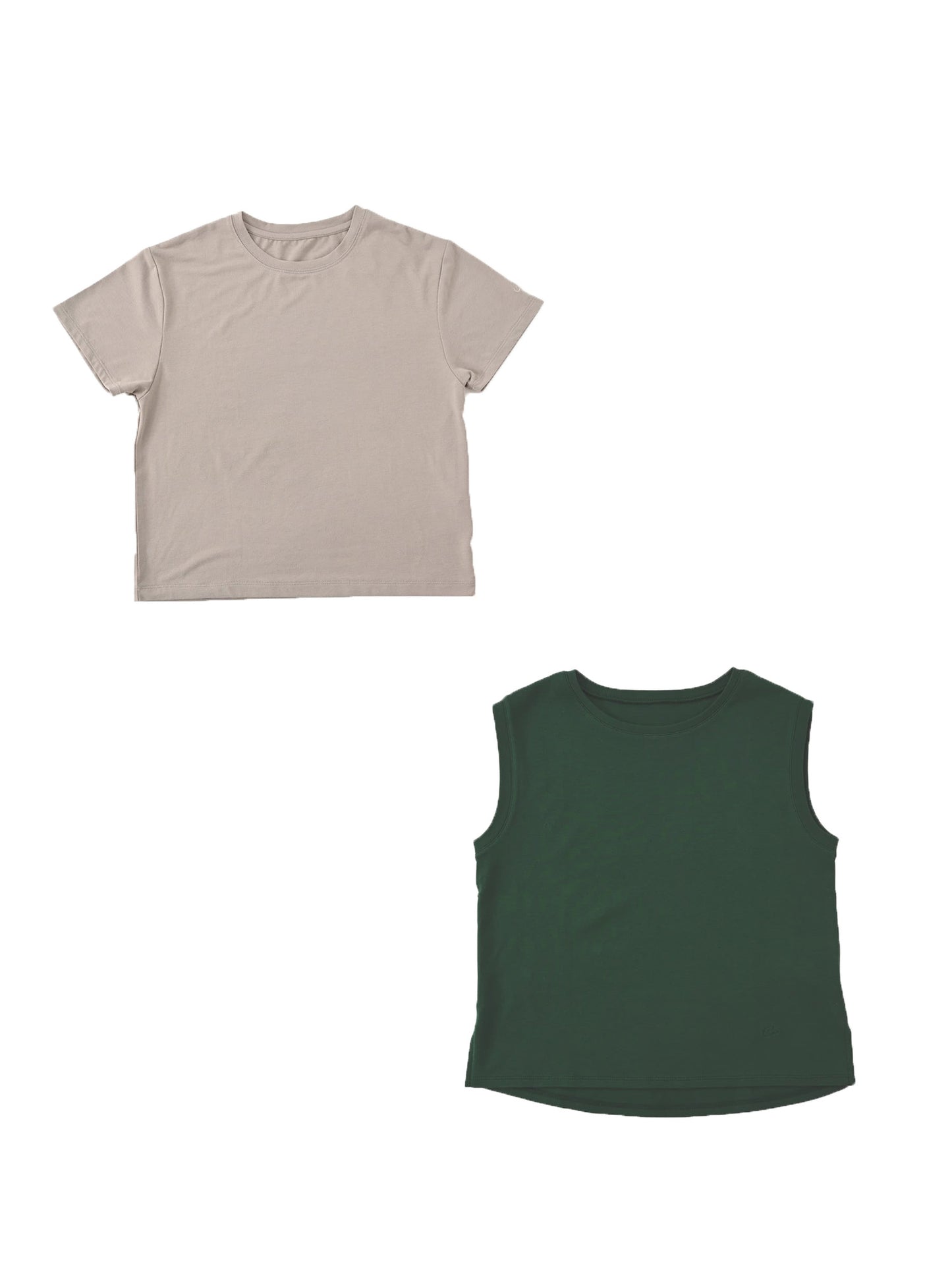 ほんのりボートネックで抜け感があり、肩周りもカバーしてくれる1枚使いしやすいシンプルなノースリーブ、優しいタッチが魅力のゆるっと着られるTシャツが1つのセットに。ベーシックなアイテムだからこそ、サイズ感や襟ぐりのラインにこだわり、絶妙なサイジングに仕上げました。どちらも夏に嬉しい機能性素材を使用した着回しに優れた万能アイテム。
