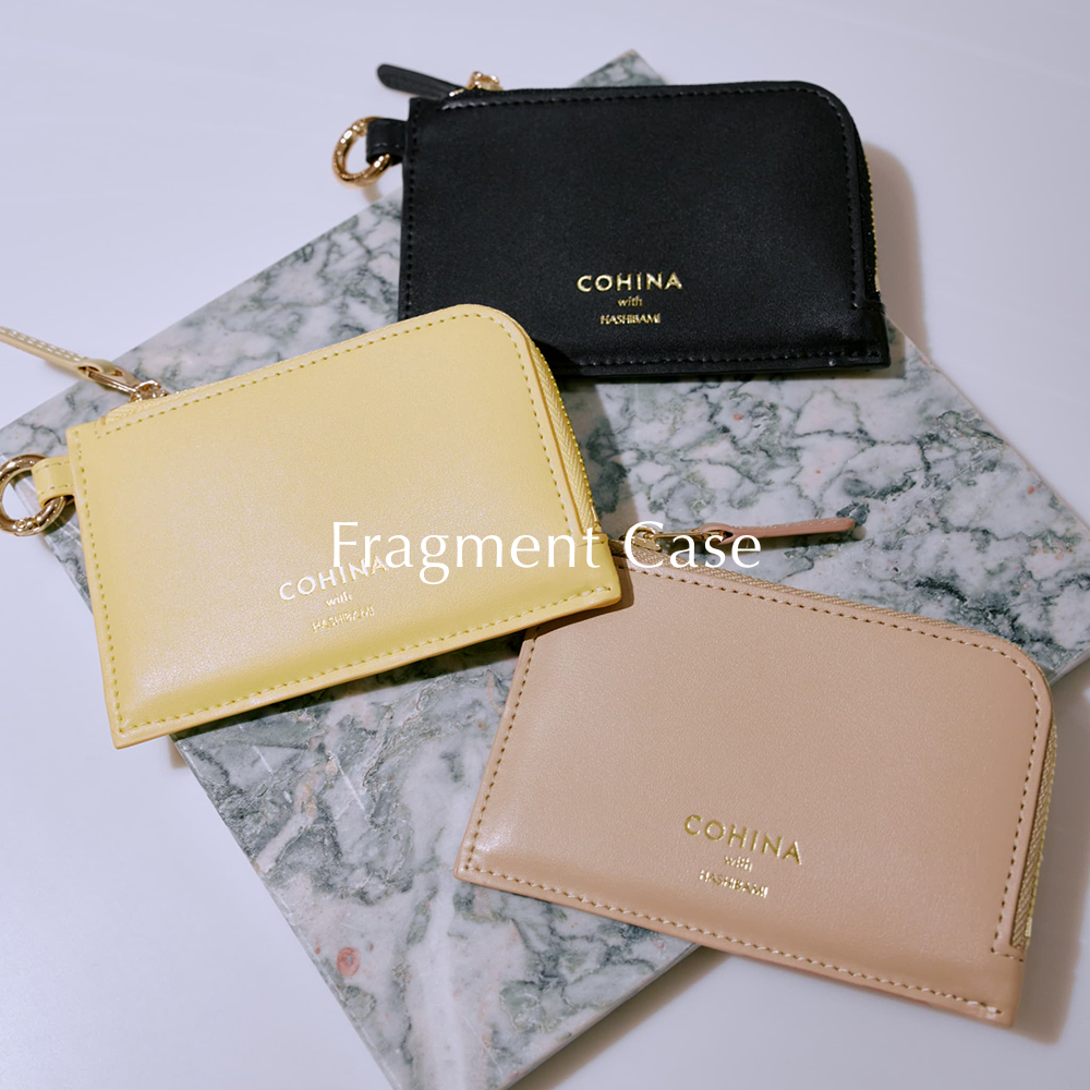 キャッシュレス時代に便利な薄型フラグメントケース。ミニマルなデザインで、「COHINA meets HASHIBAMI」の箔ロゴ入りの別注アイテムです。カードポケットと小銭入れがあり、パスケースや薄型ウォレットとして使えます。素材にはお手入れしやすい牛床革を使用。カラーはブラック、グレージュ、春らしいイエローの3色。バッグチャームとして使える金具も付いており、スマホショルダーにも取り付け可能です。