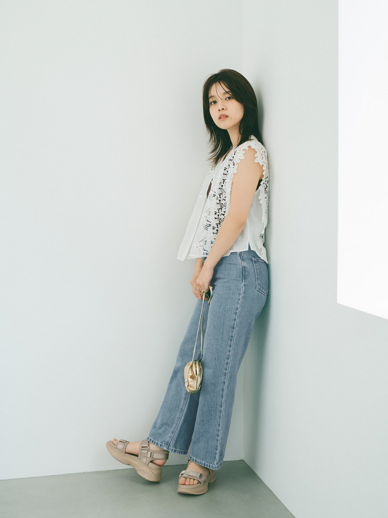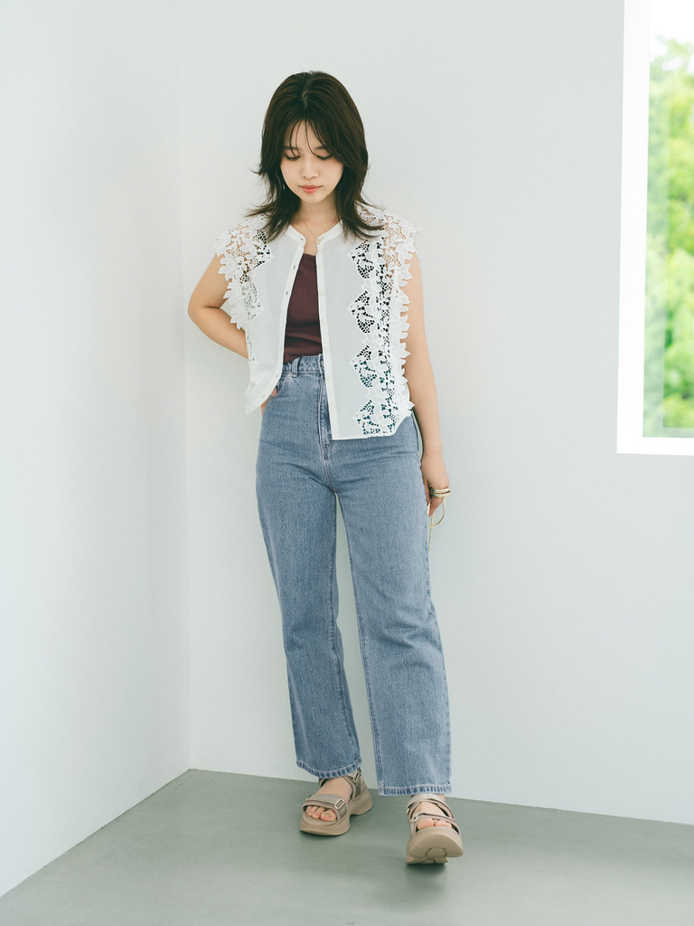 きれいめジレと合わせて大人デニムコーデの完成!インナーをタックインして全体のシルエットをスッキリ見せて