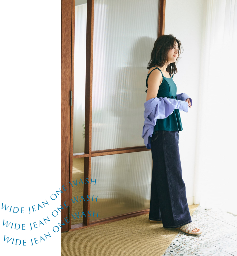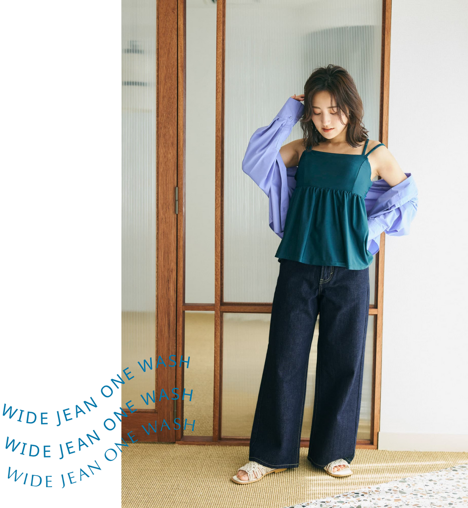 水着と合わせたリラックスコーデ。クールさも持ち合わせているWIDE JEANのおかげで感度高めな大人のデニムコーデに仕上がります。