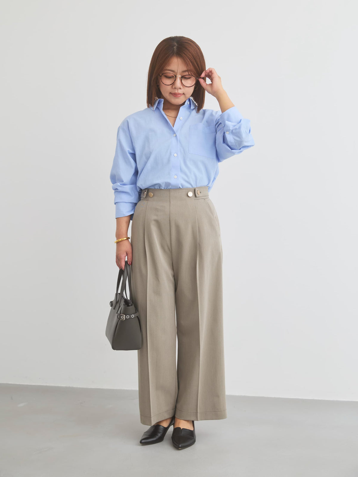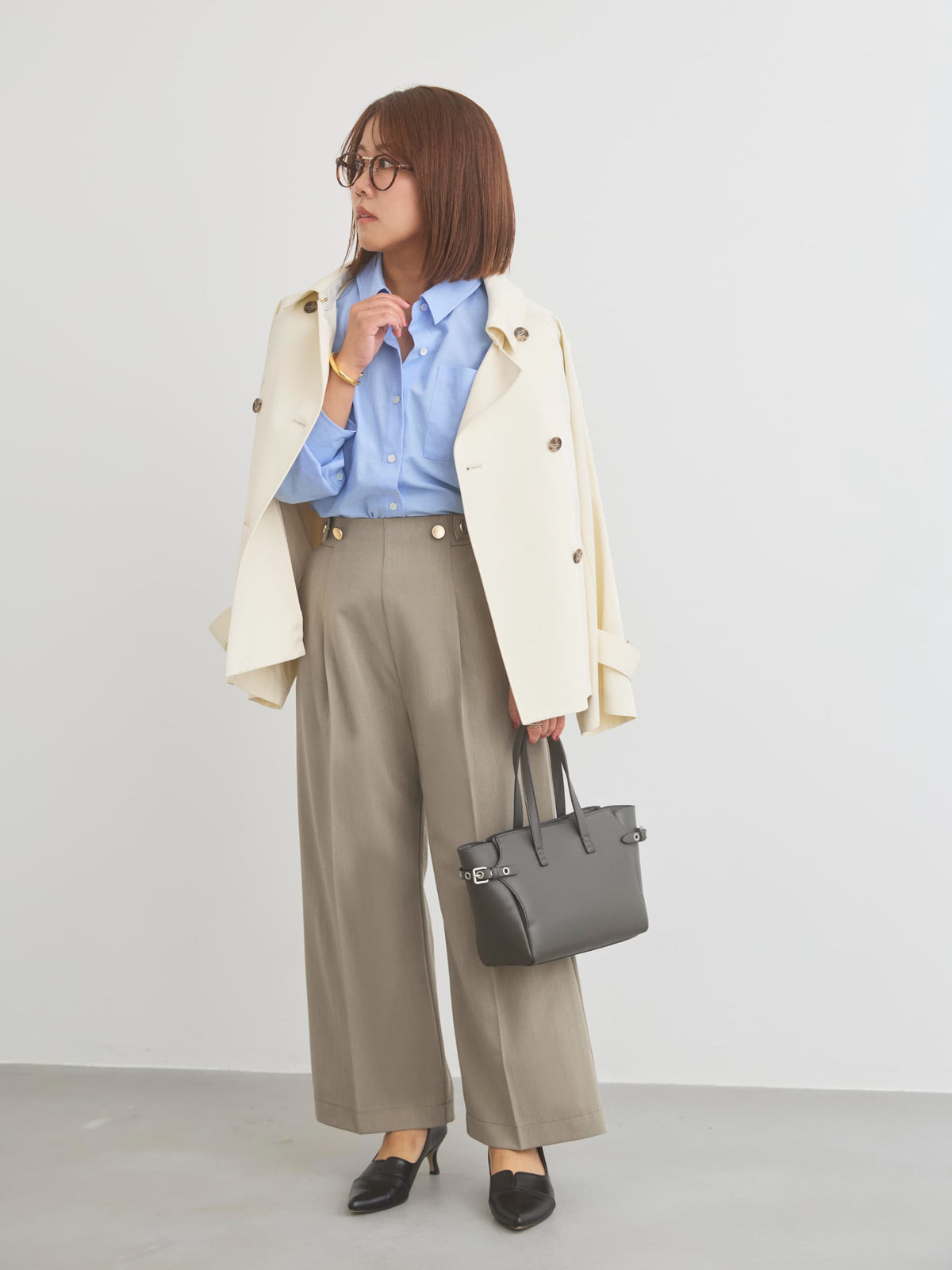 定番の色味はもちろん、カーキグレージュのやわらかい色味も合わせやすく、きれいめにもカジュアルにも馴染みやすいのがポイント。程よくハリのある素材で、履いたときのシルエットがきれいに決まるのがお気に入りです。(short-XS着用)