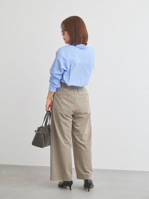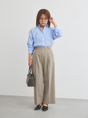 サイドファスナー仕様で、ウエストまわりをすっきりと見せてくれるデザインです。ストンと落ちるIラインシルエットとセンタープレスの縦ラインですらりとした印象の綺麗めパンツに仕上げました。