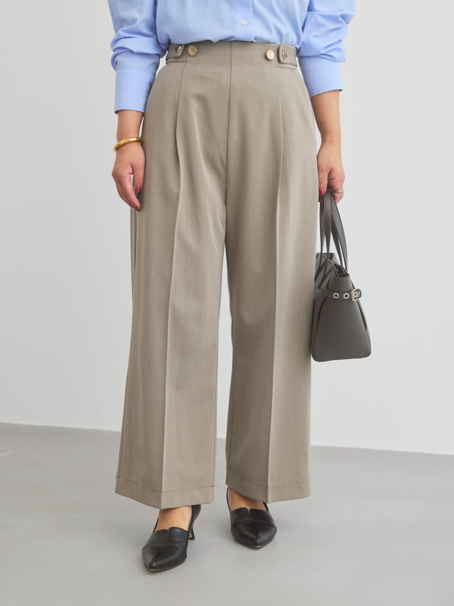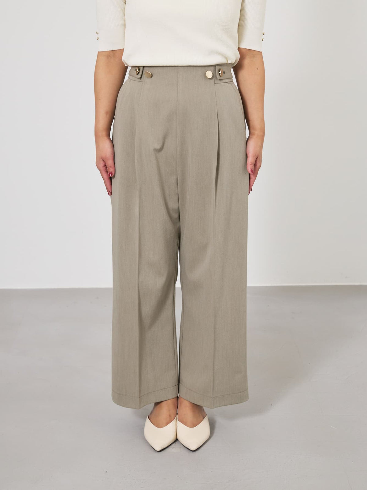 フロントのゴールドボタンがさりげなく、ハイウエストなので自然と腰位置が高く見え、スタイルアップ効果抜群のパンツ。