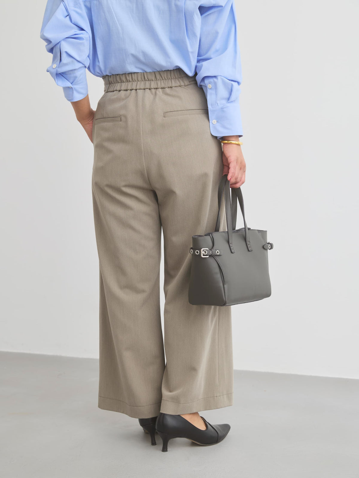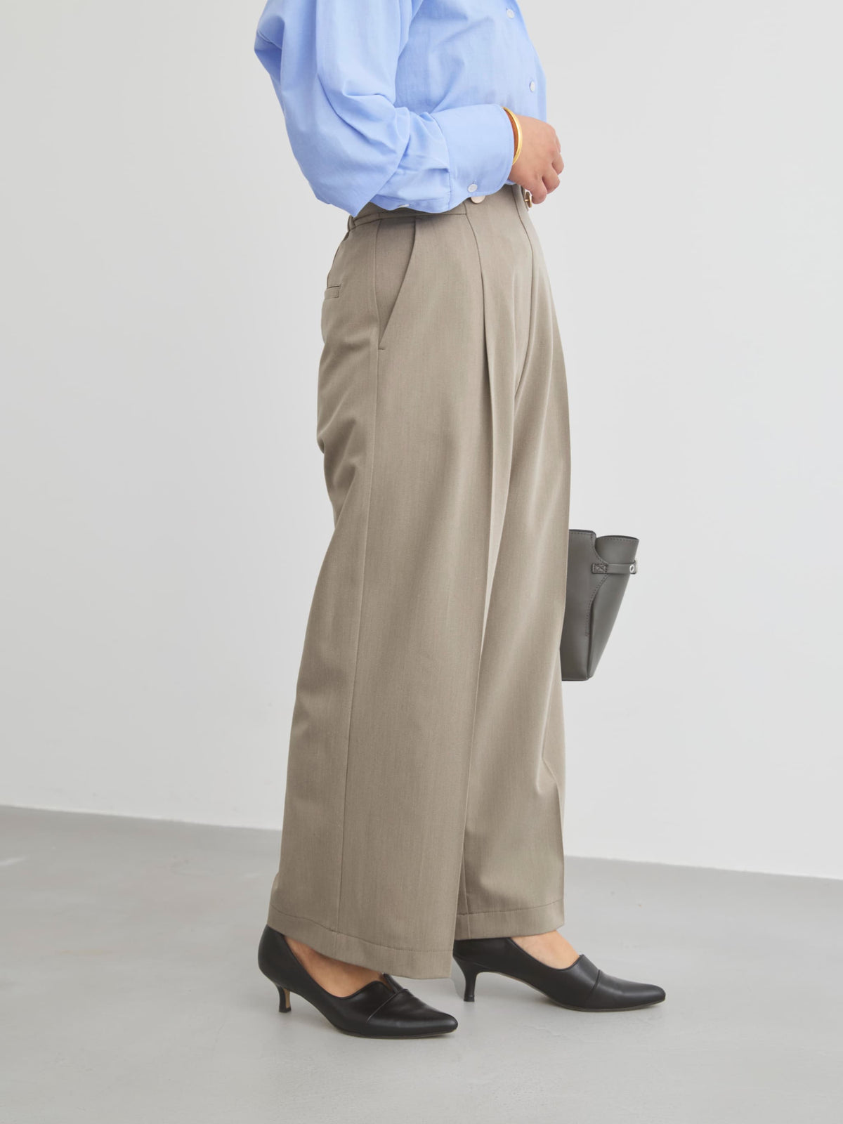 綺麗めな表情の綾目の合繊素材を使用。微ストレッチが効いており、きちんと感と履き心地の良さを両立。落ち感のある生地がストレートシルエットを強調し、脚をまっすぐ綺麗に演出してくれます。