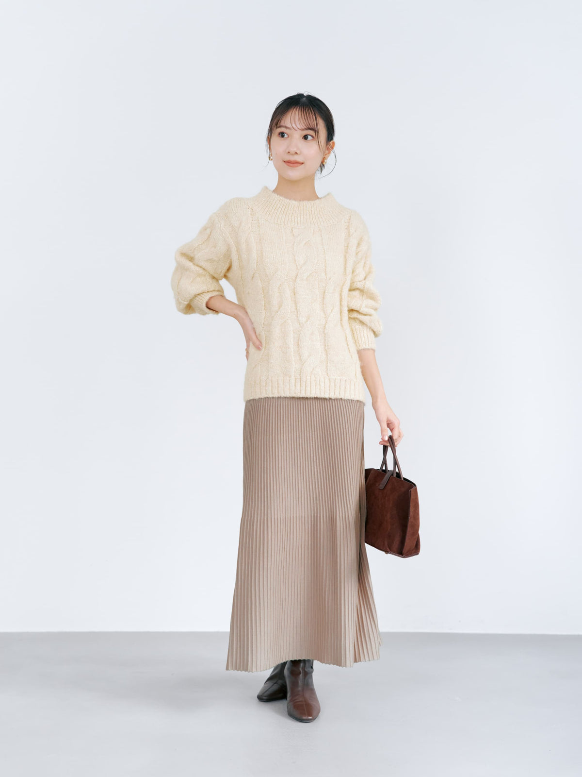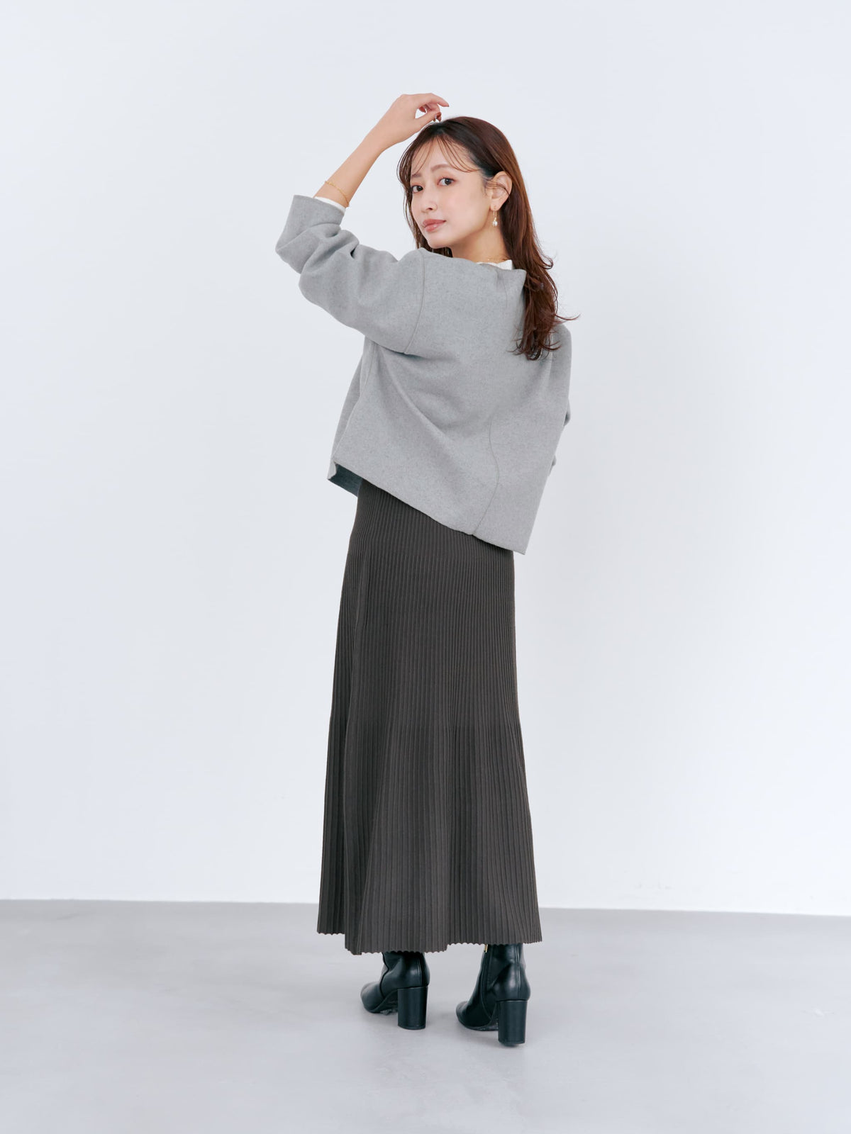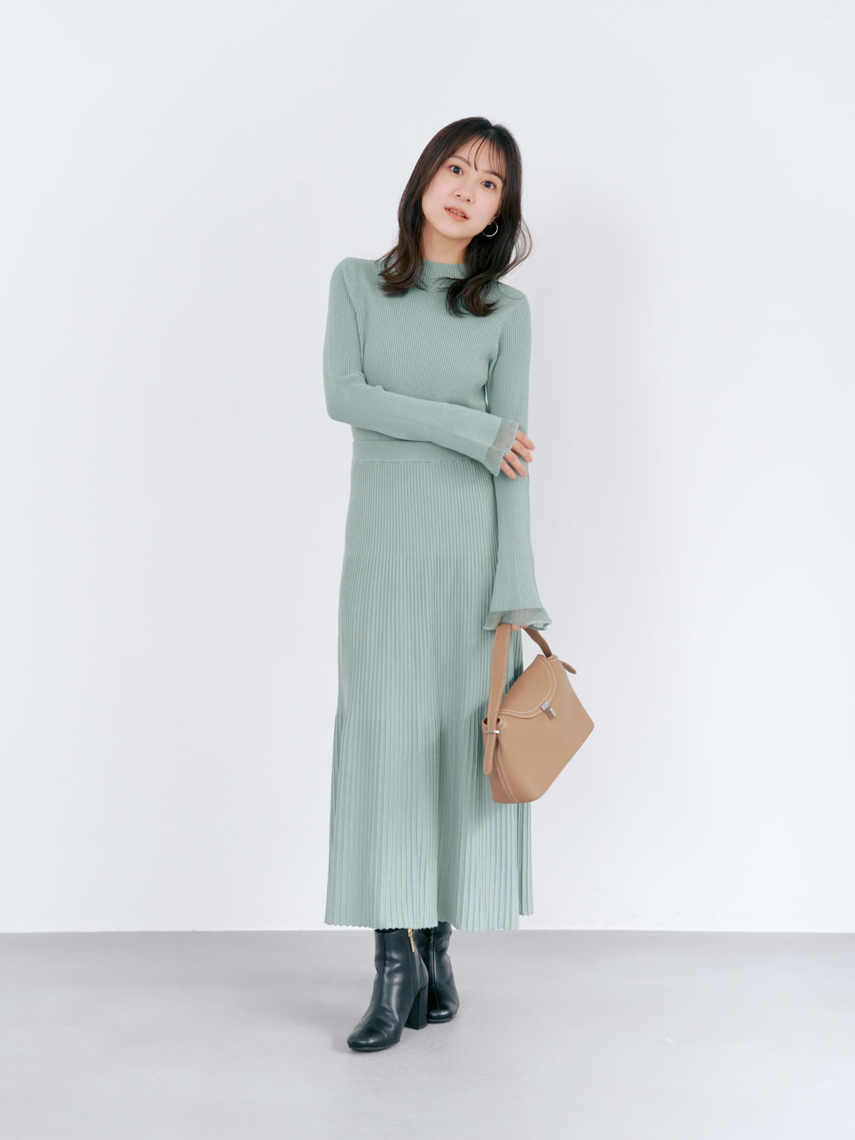 リブの幅が調整されているので、重たくなりすぎず、自然と広がるシルエットがとても綺麗で、スタイルアップして見えます♡身長148cmでくるぶしあたりの丈で、フルレングスで着られるので、大人っぽくそして暖かく着られるのが嬉しいポイントです!