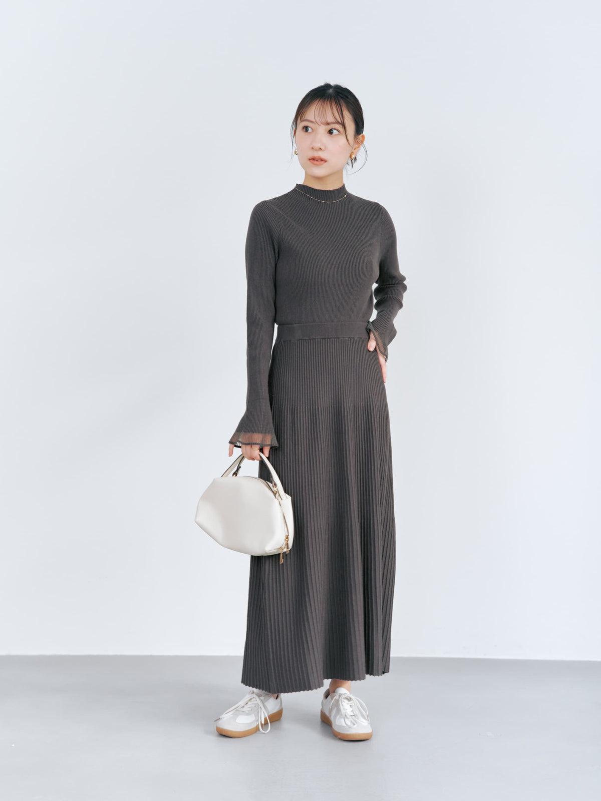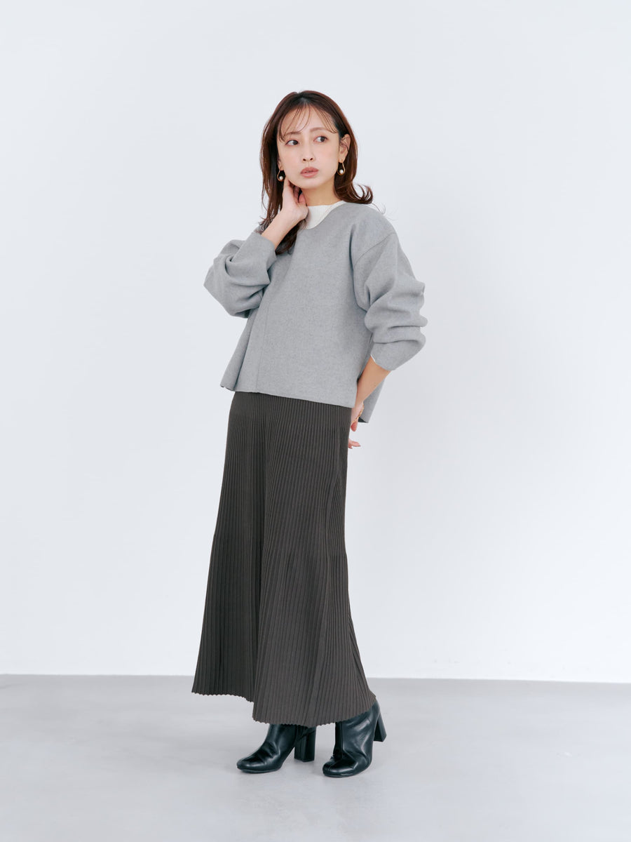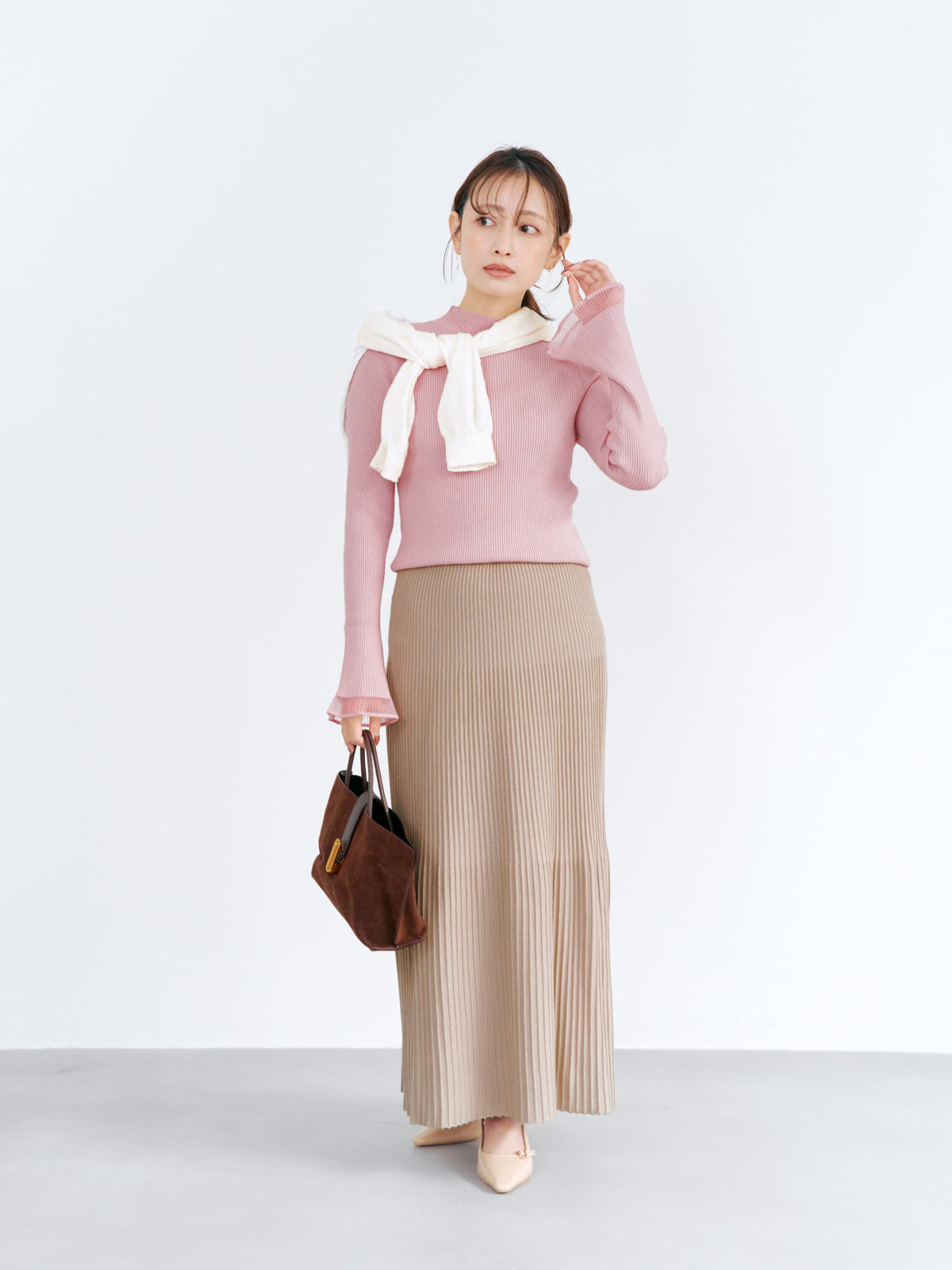 同素材のシアーフレアスリーブニットとセットで合わせていただくことで、ワンピース見えのフェミニンな着こなしが完成します。