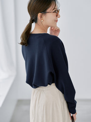 襟のリブやラグランスリーブ、袖口に施したミシンステッチなど、さりげなくカジュアルディテールを活かしたデザイン。