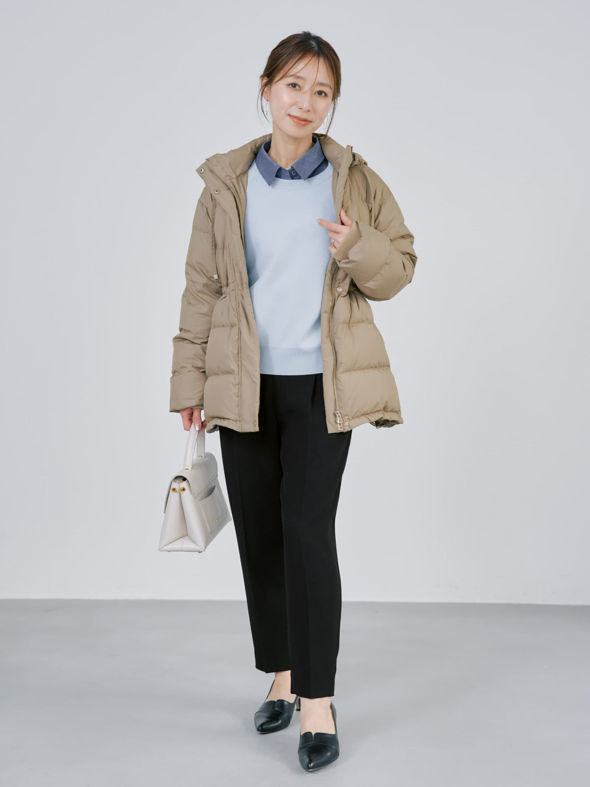 身長148cmで骨盤あたりの丈感なので、ウエストをインしても、アウトで着てもバランスよく着ることができるのも嬉しいポイント!綺麗めパンツとあわせれば、オフィスカジュアルにも。スカートやデニムなどに合わせればカジュアルに着こなせます◎