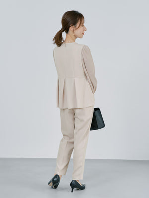 同素材で展開しているやトリアセジョーゼットテーパードパンツトリアセジョーゼットストレートパンツとセットアップとしても着用可能です。袖はシフォン素材なのでトリアセジョーゼットノーカラージャケットを上に羽織っても◎