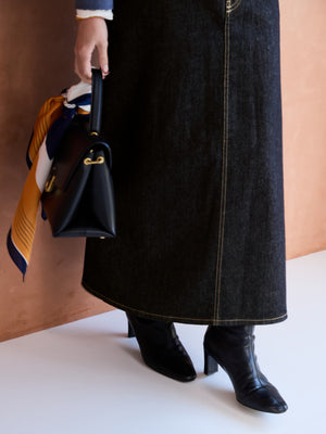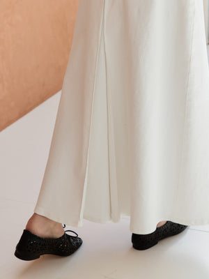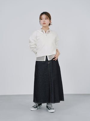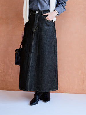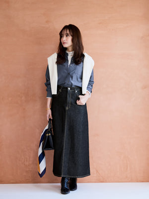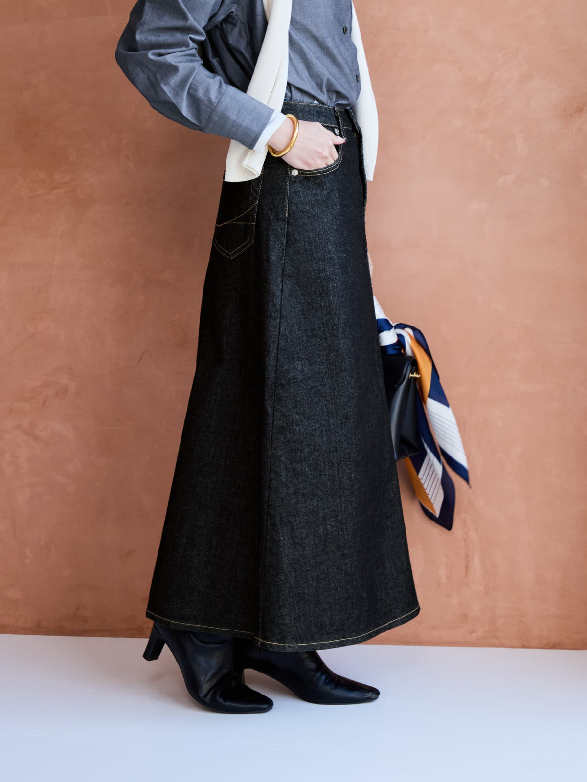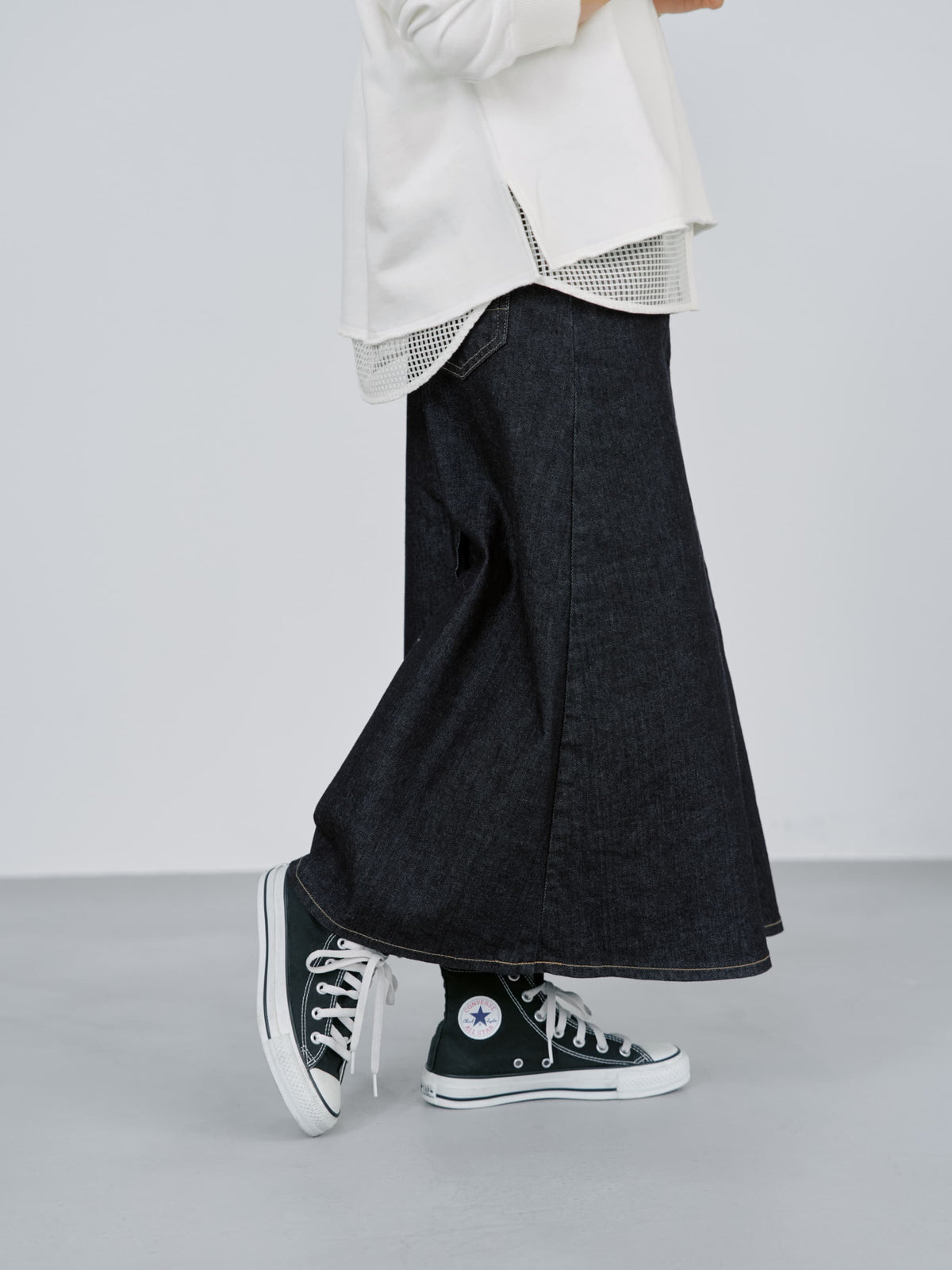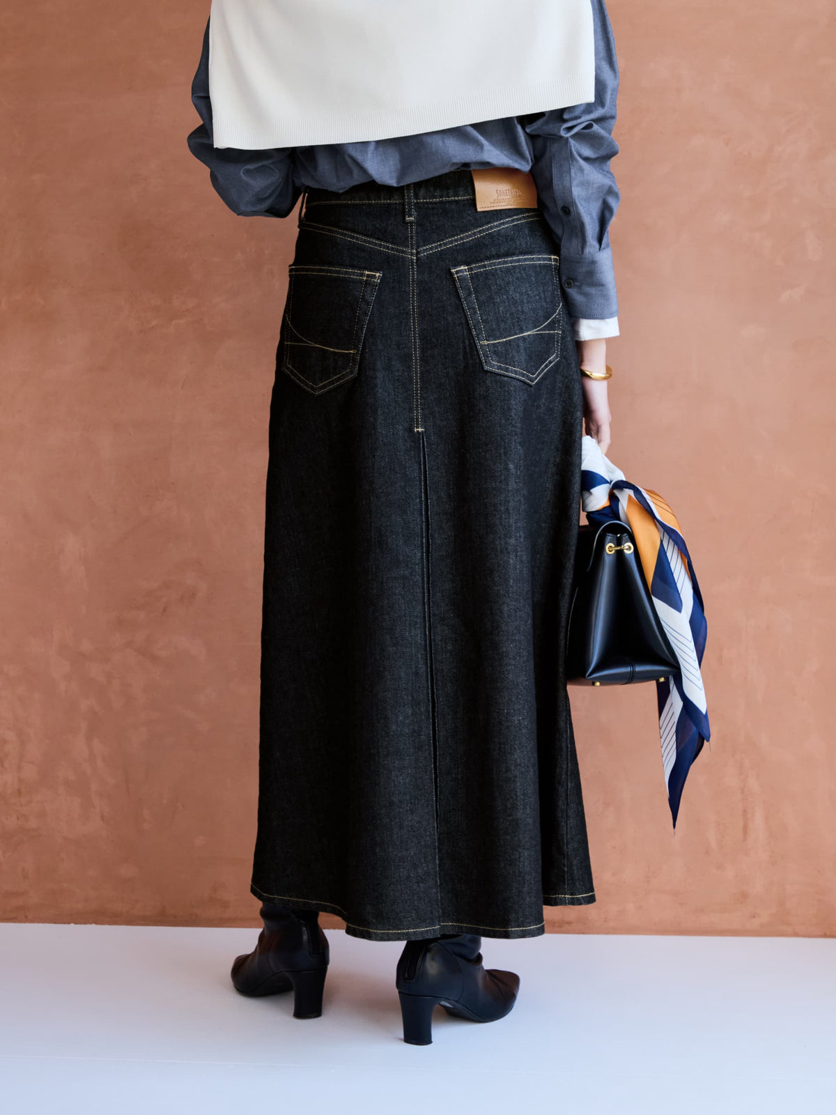 昨年ご好評をいただいたSOMETHINGとのコラボレーションが、待望の第2弾として登場!すっきりとしたAラインと足捌きで広がるバックタックのデザインで、シルエットにコントラストのあるデニムスカート。