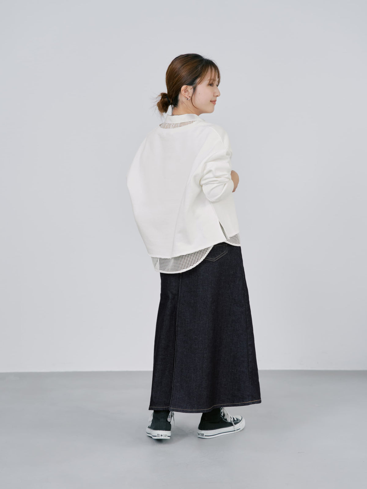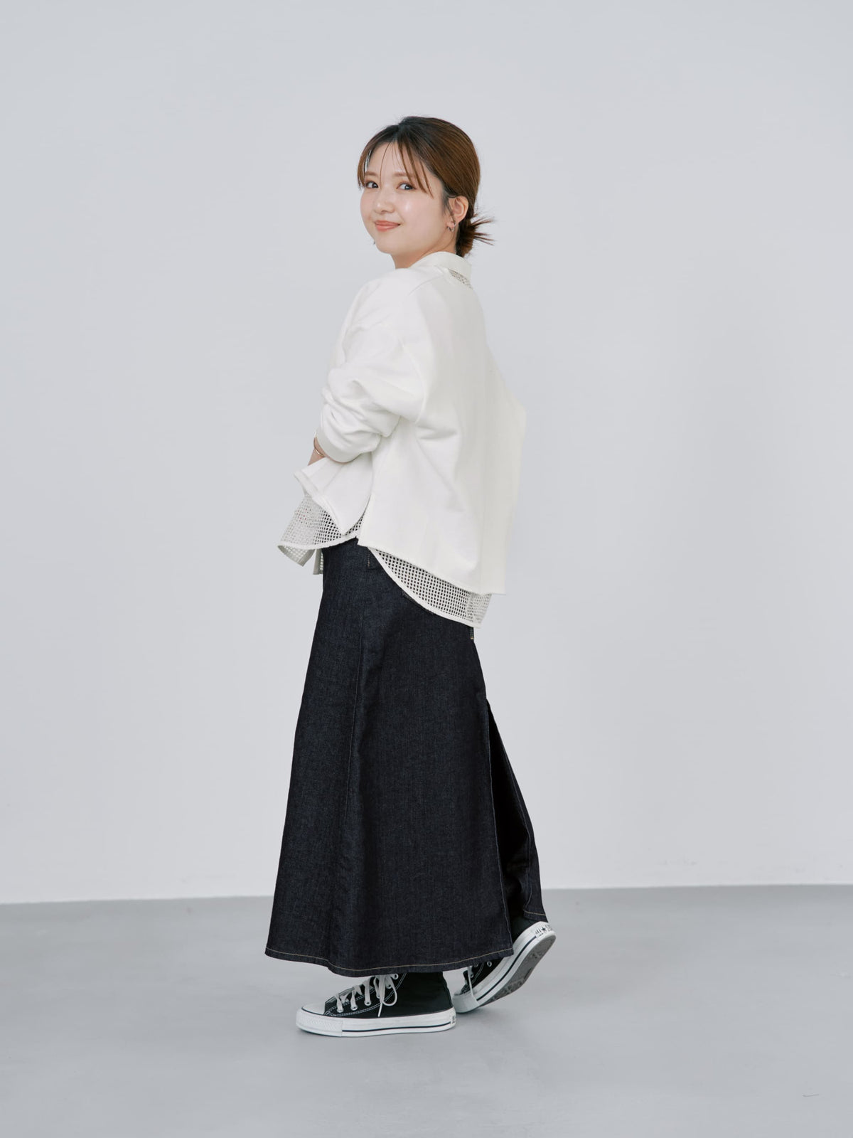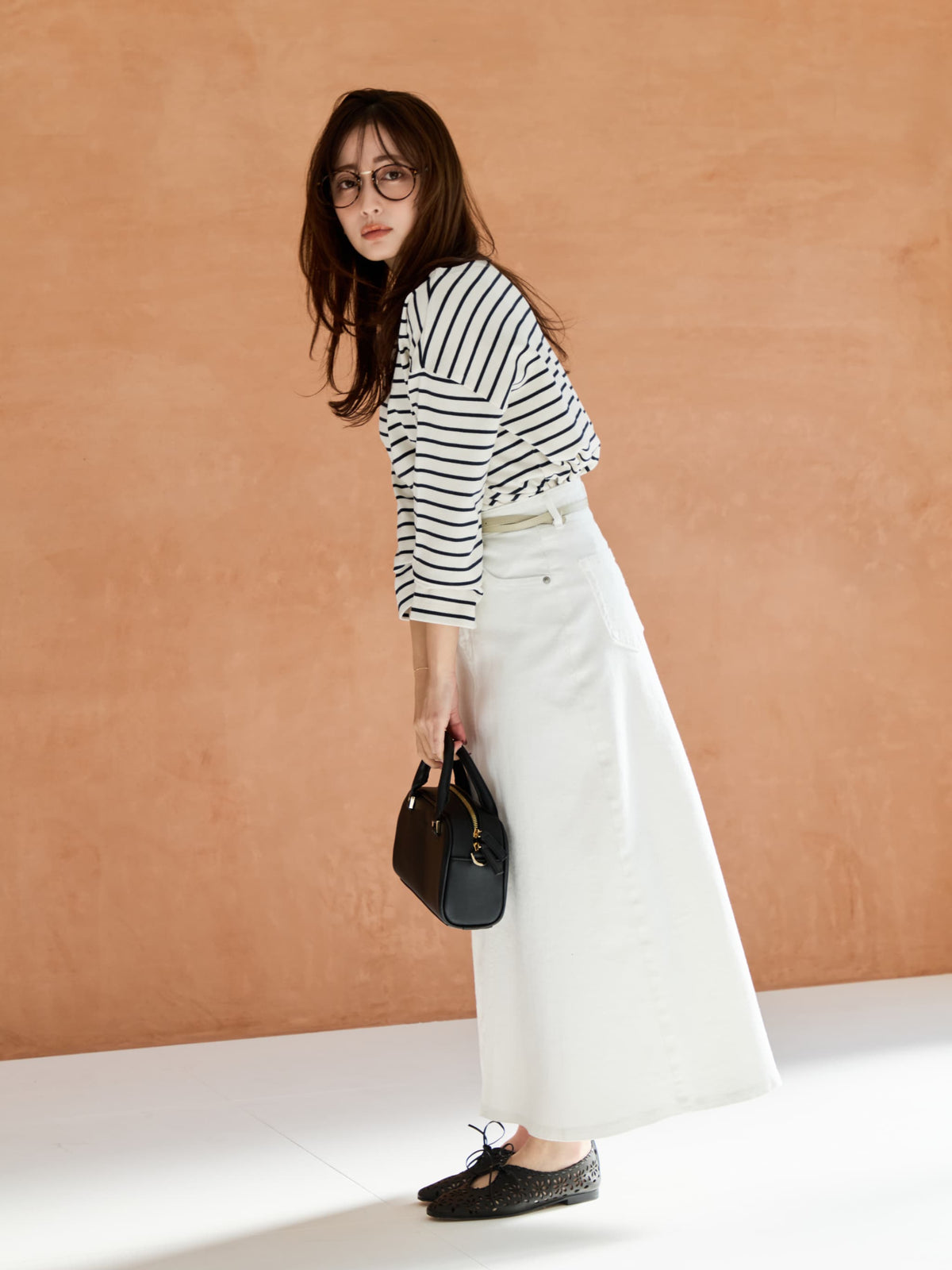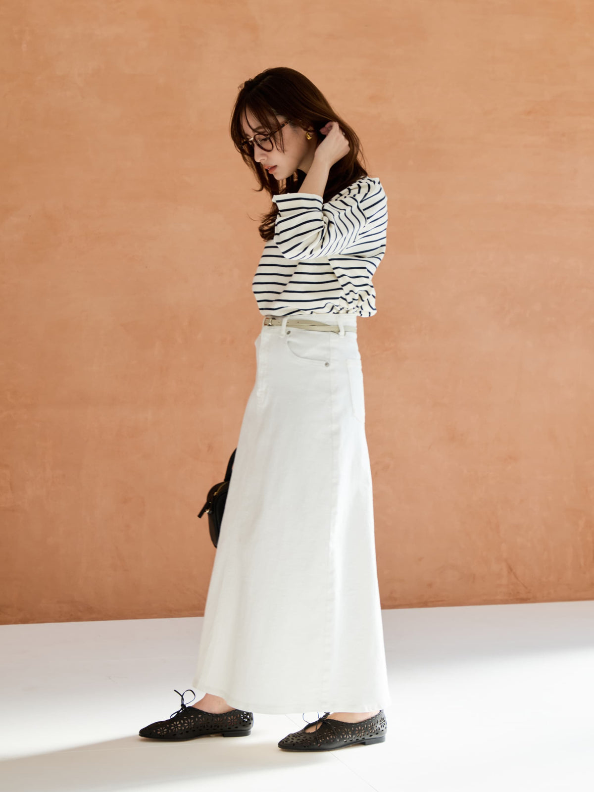 インディゴは、軽やかなカラーもののトップスなどにも合わせてきゅっと引き締めコーデに仕上げたり、オフホワイトは透けにくい加工だからこそ、ショート丈のトップスなどと合わせてシルエットをお楽しみください!