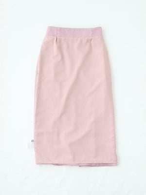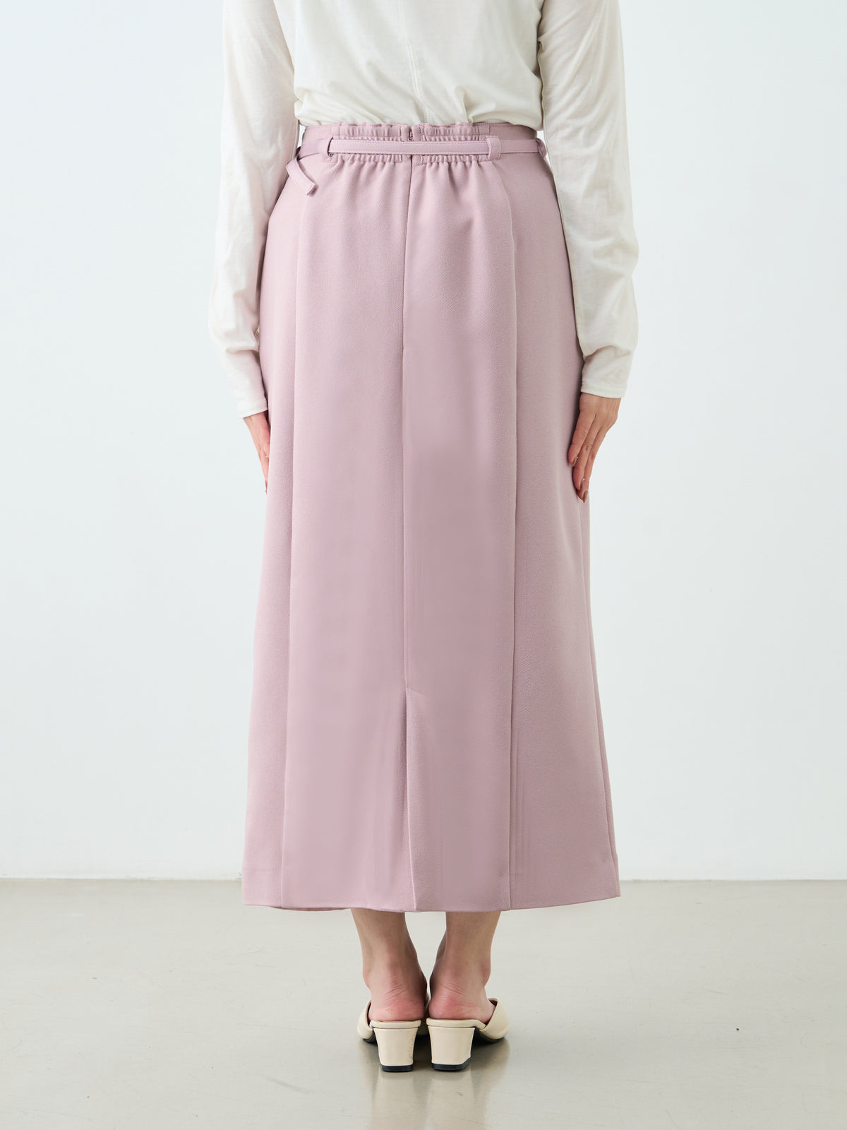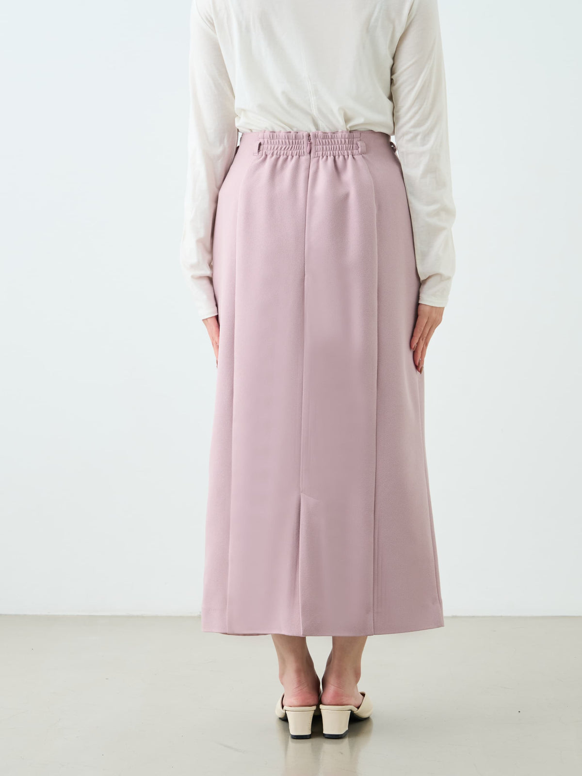 ウエストは後ろのみゴム仕様になっており、フロントはきれい見えしつつ着心地の良さも両立。