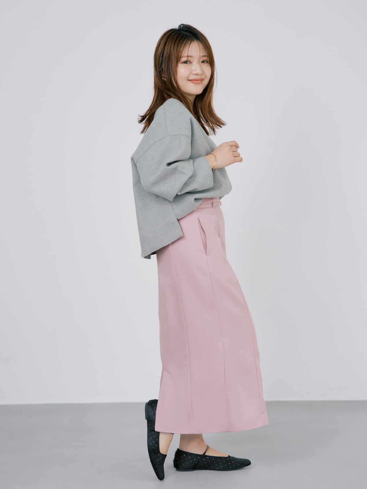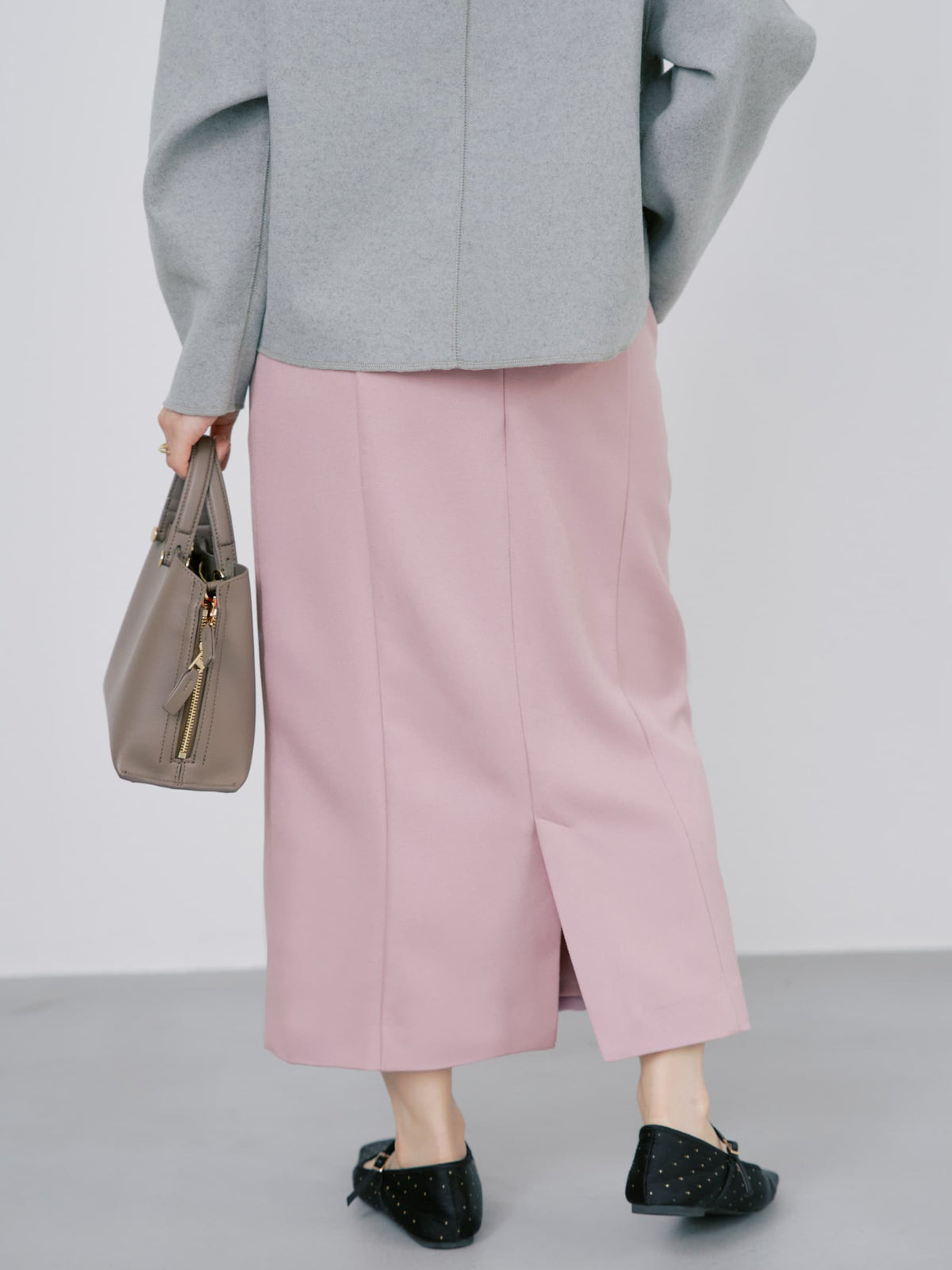 Iラインシルエットですが、パネルデザインのおかげで、着心地も見た目もタイトすぎないのが嬉しいです。身長148cmで足首あたりの丈感なので、フラットシューズでもヒールでもバッチリ◎