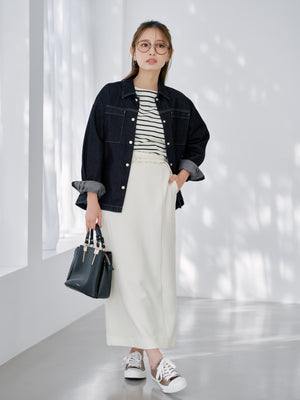 シンプルで着回し力の高いIラインスカートは、きれいめスタイルはもちろん、カジュアルなアイテムと合わせても品良く大人な雰囲気に仕上がります。