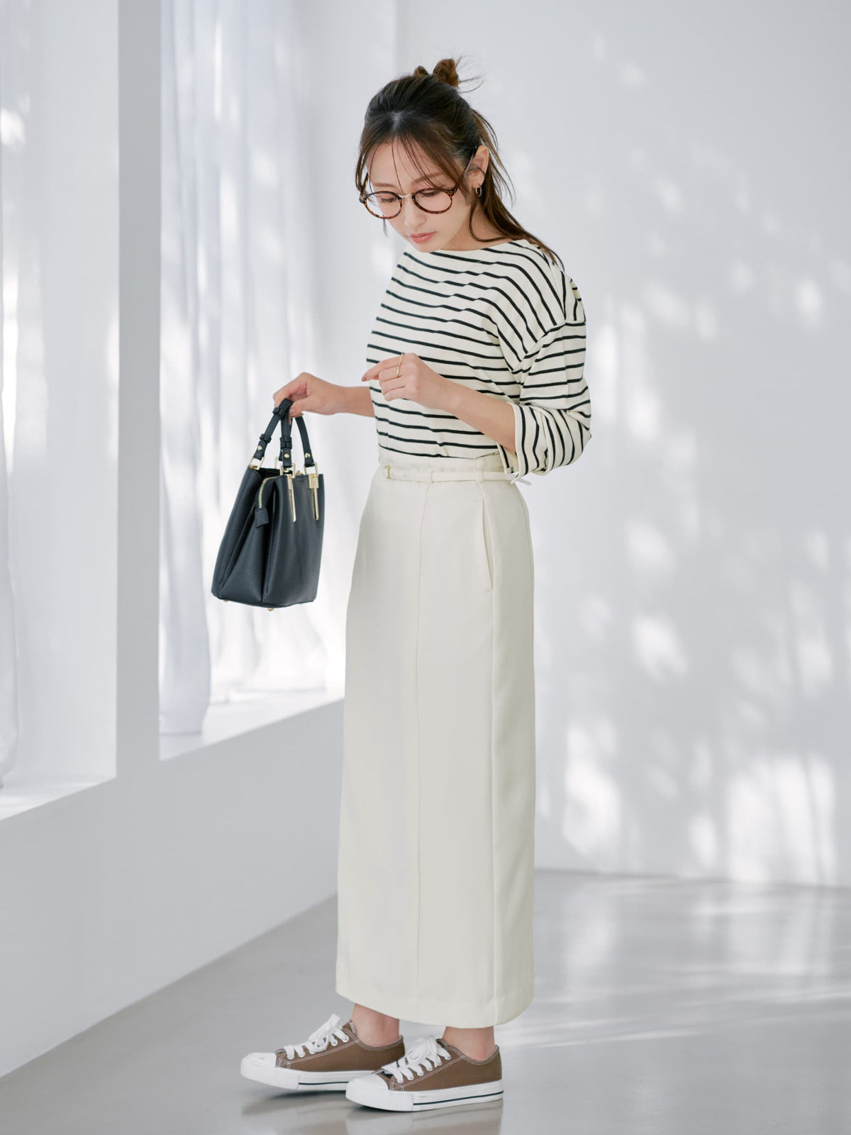 ウエストもゆとりがあるので、まだ寒さのある時期はニットなどのトップスをインするのもよさそうです。