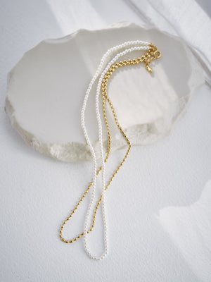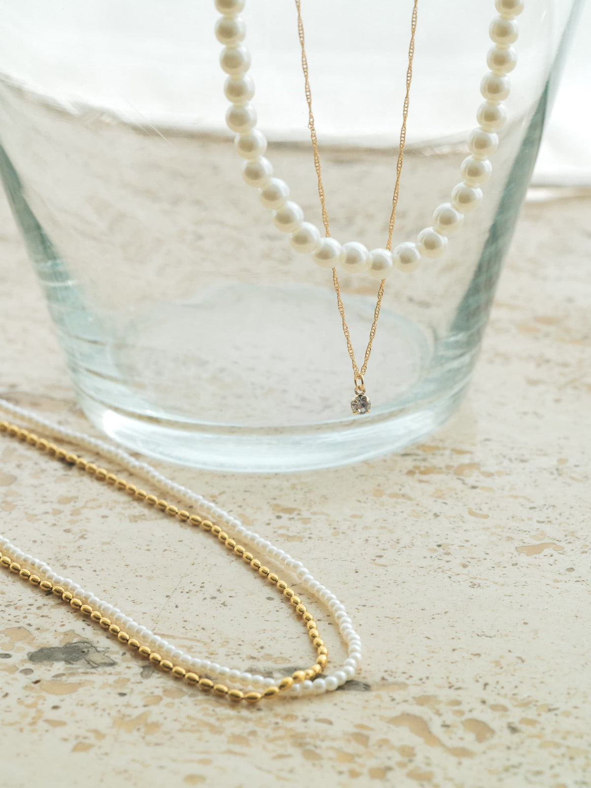 小ぶりなパールとオーバル型のボールチェーンが上品で女性らしい首元を演出。ちょうど良い長さなので、華やかさがありながらもすっきりとしたバランスに仕上がっています。