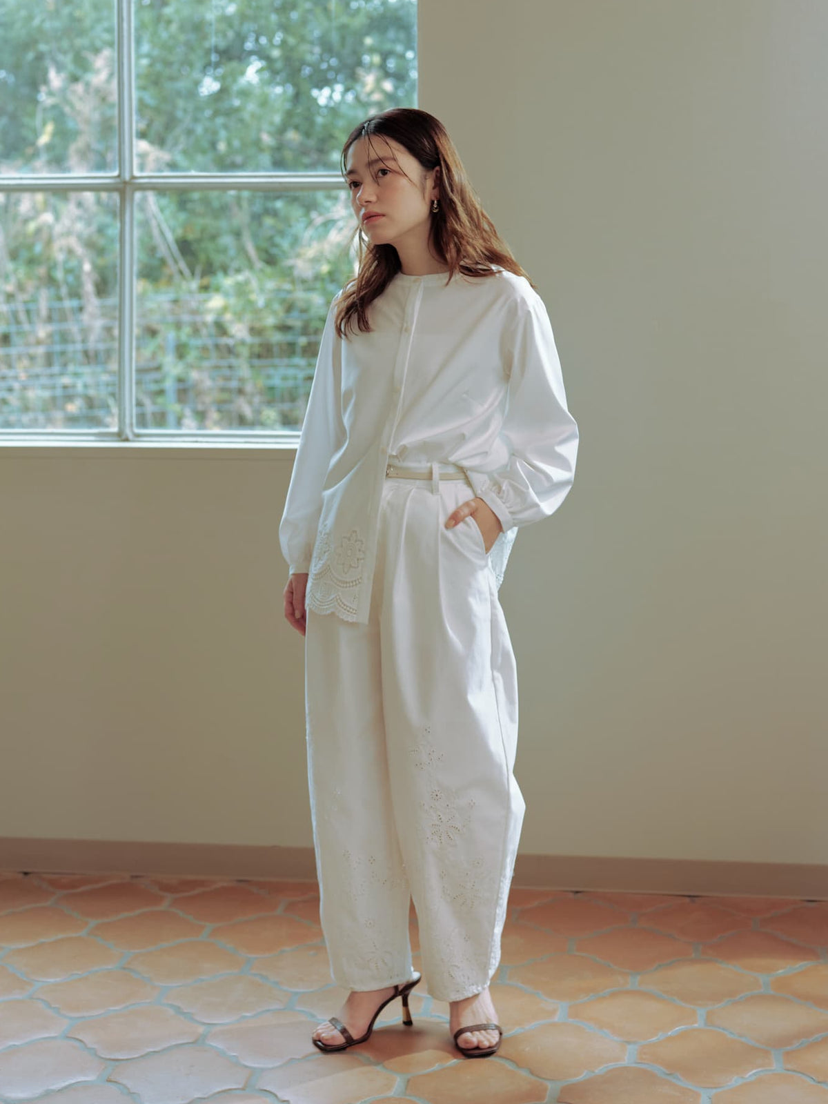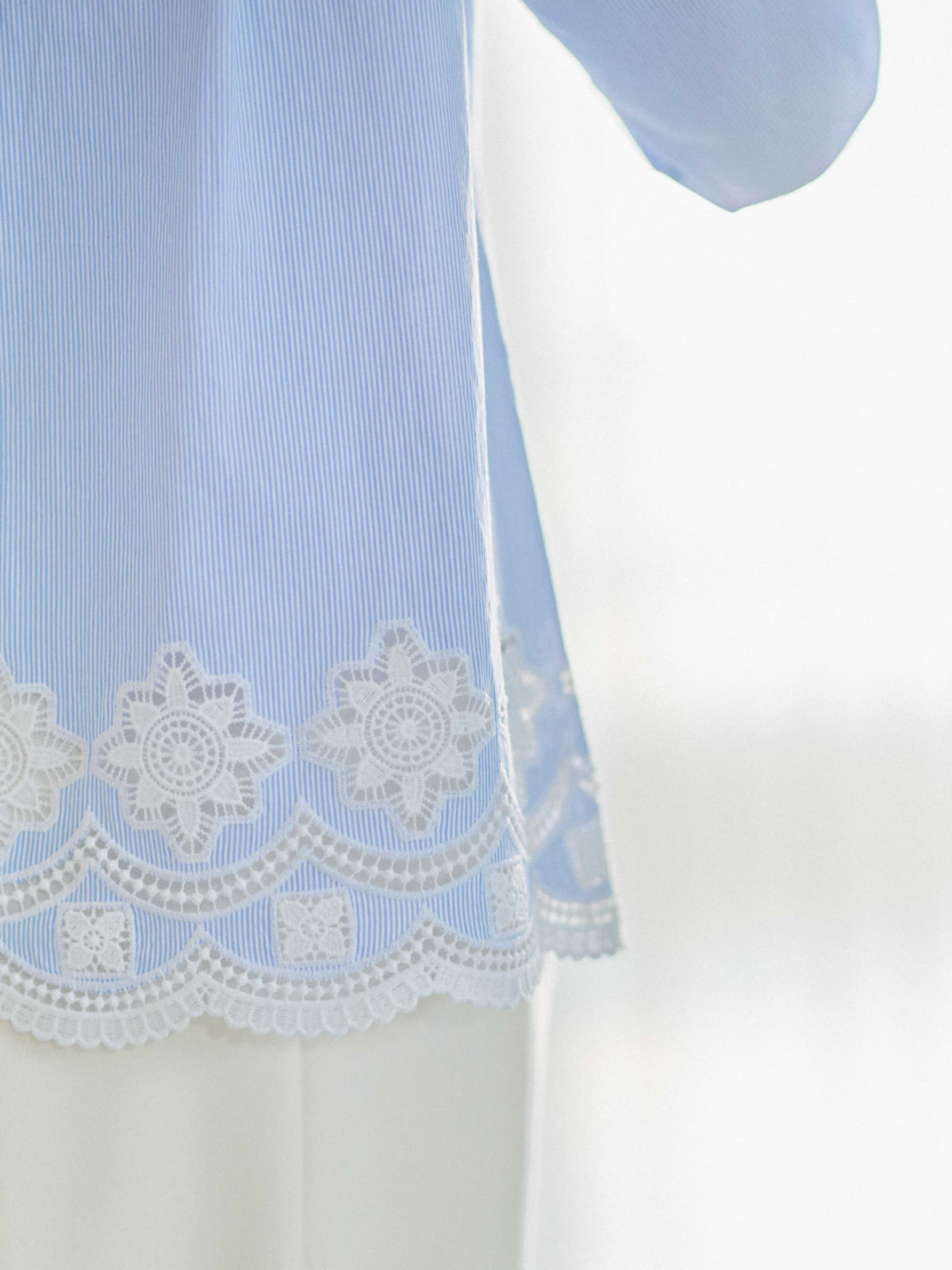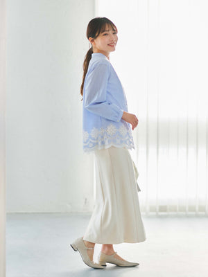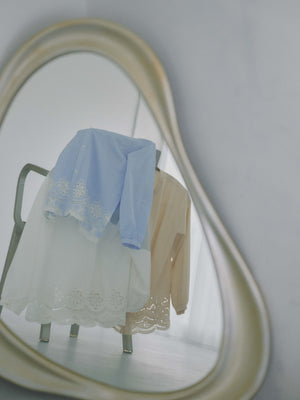 裾のスカラップや刺繍モチーフも大きくなりすぎないようにし、小柄な方でも着やすい絶妙な着丈にこだわりました。ゆったりとしたシルエットで、リラックスした着心地を叶えつつ、カットワークが女性らしさを演出。