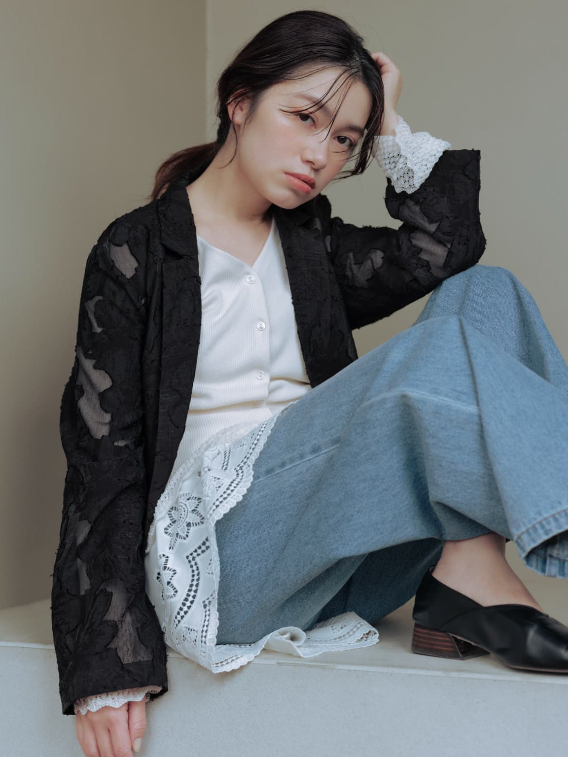 アウターやカーデの裾からカットワークがチラリと覗く着こなしもおすすめです。