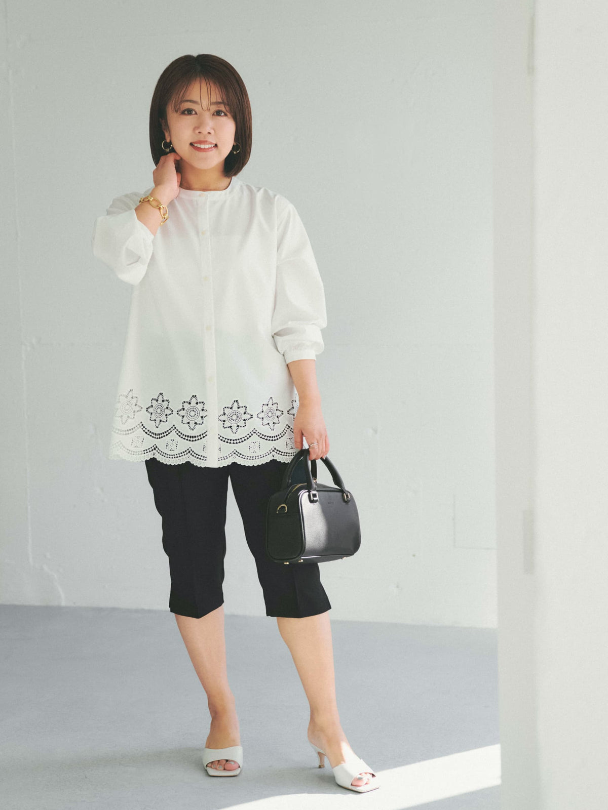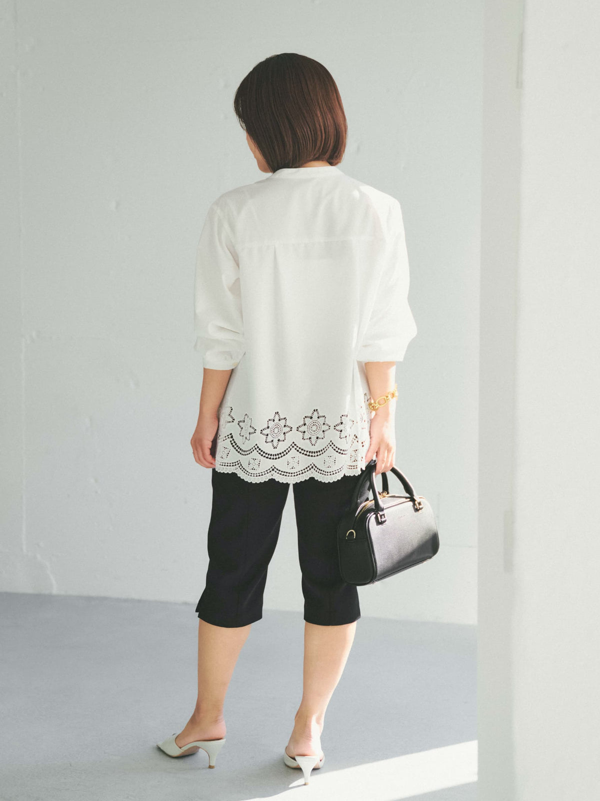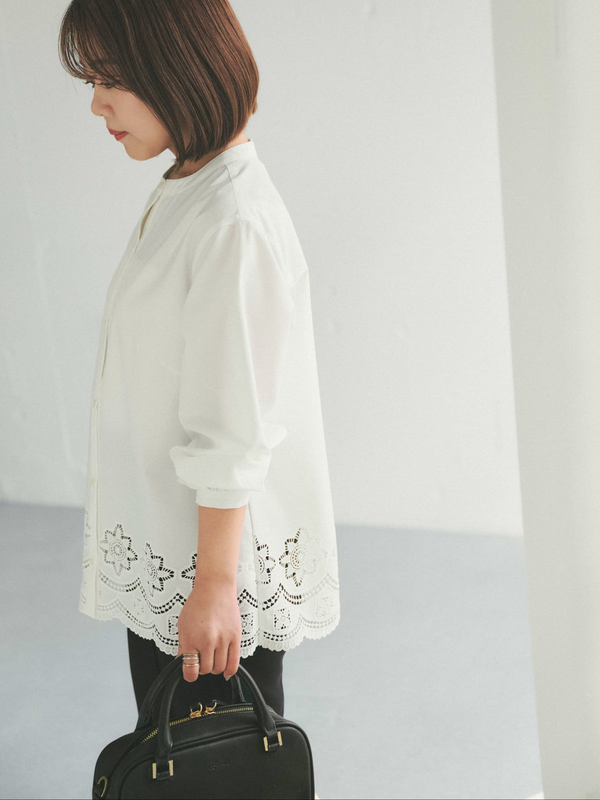 カットワークヘムブラウスは、春らしい繊細なカットワークと裾デザインが目を引く1枚。