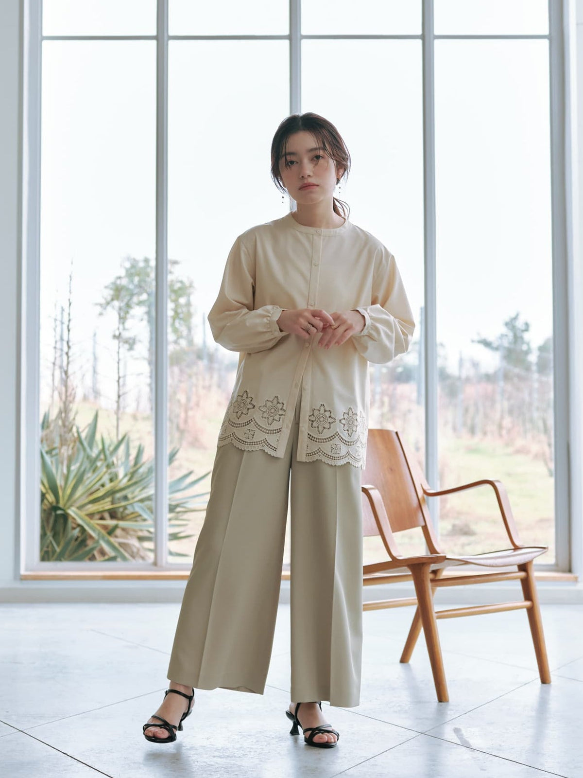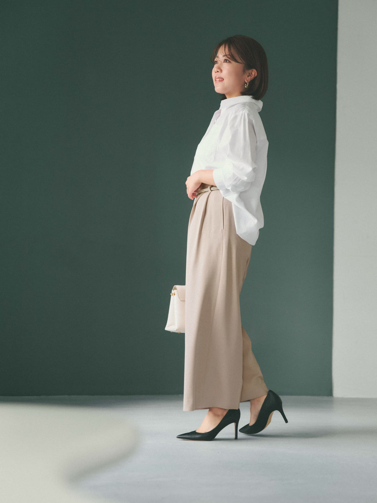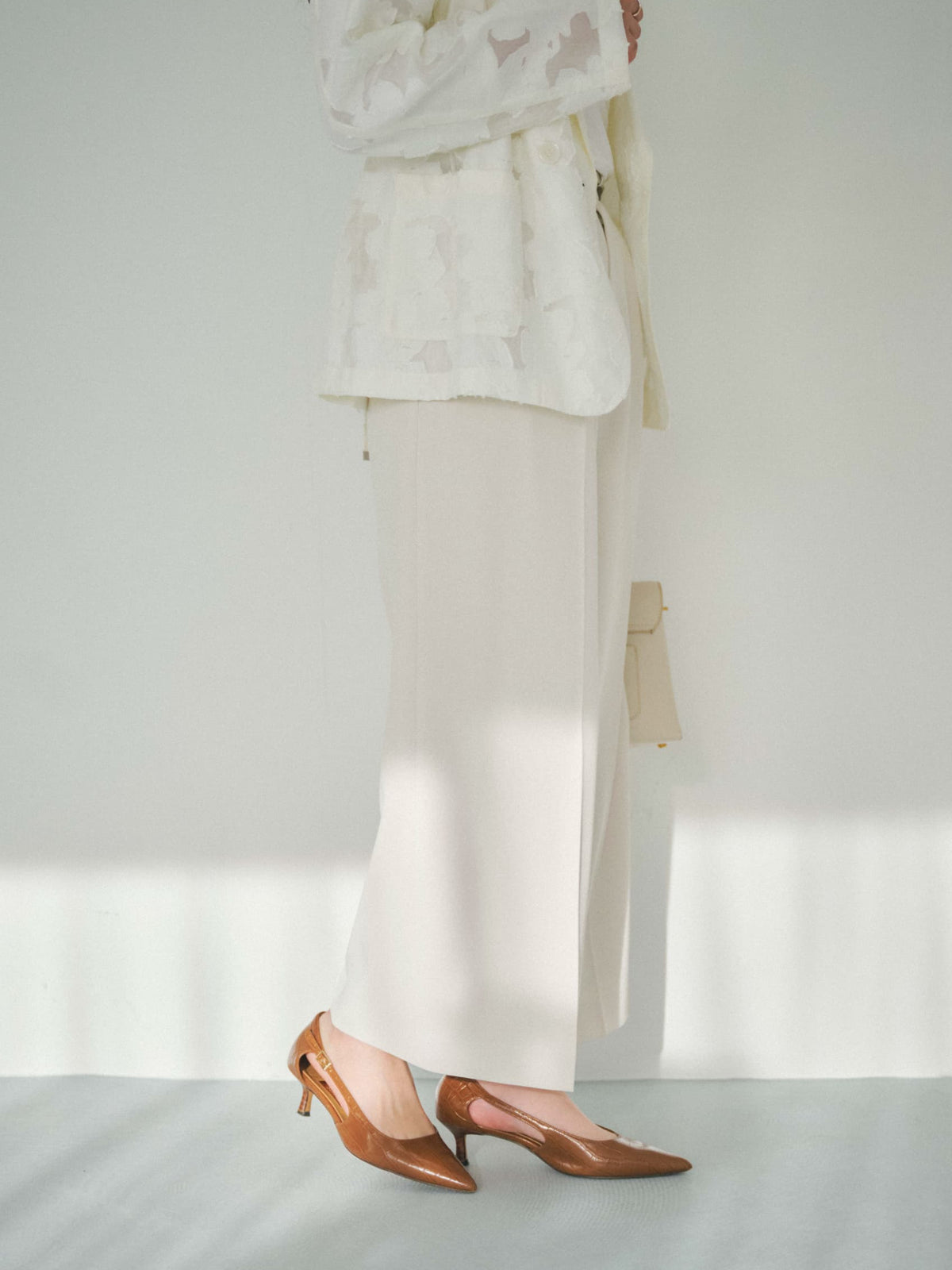 シーズンレスで履き回せる素材感でありながら、落ち感のある素材で女性らしさを感じさせます。