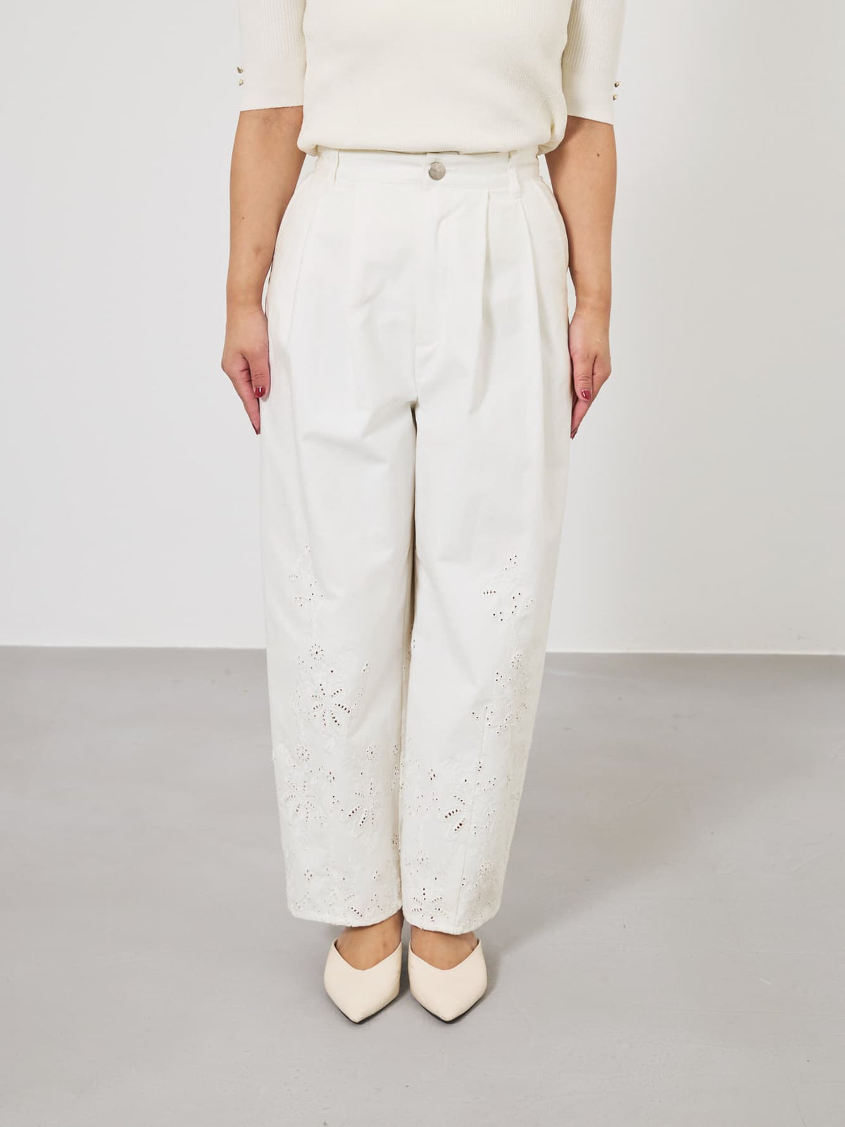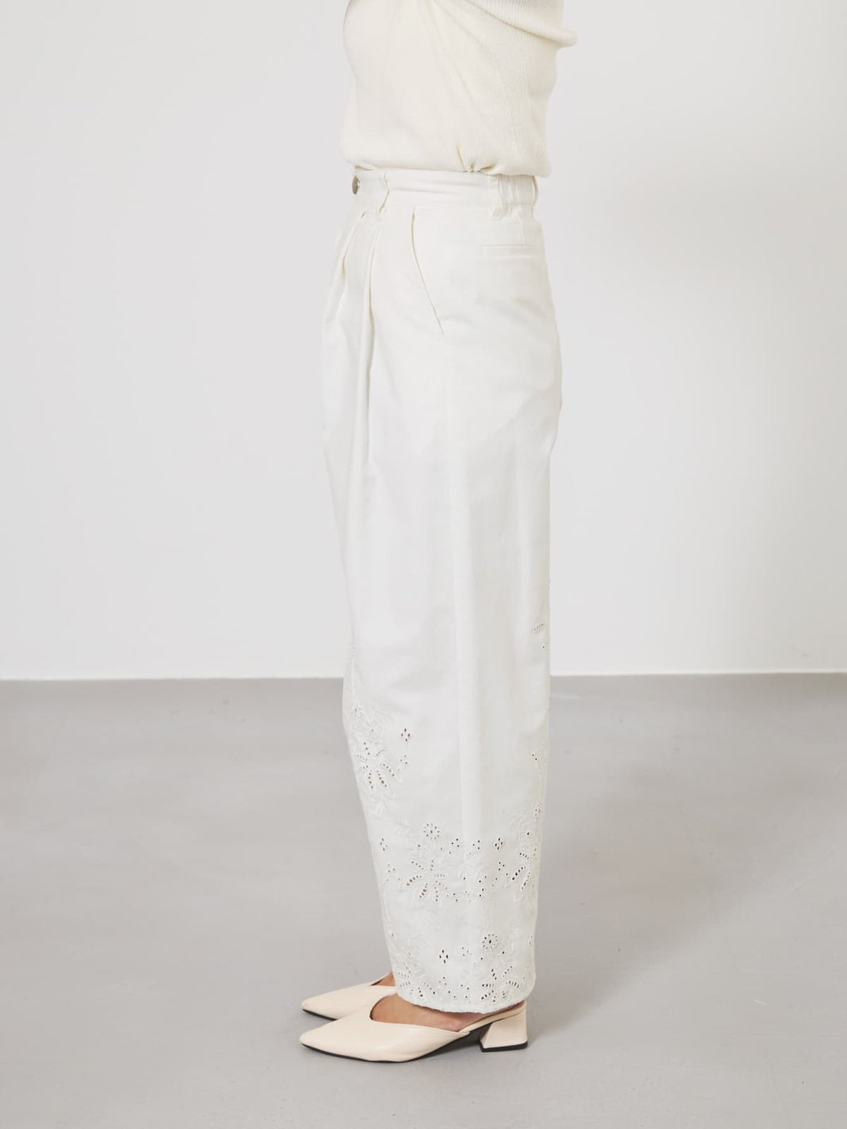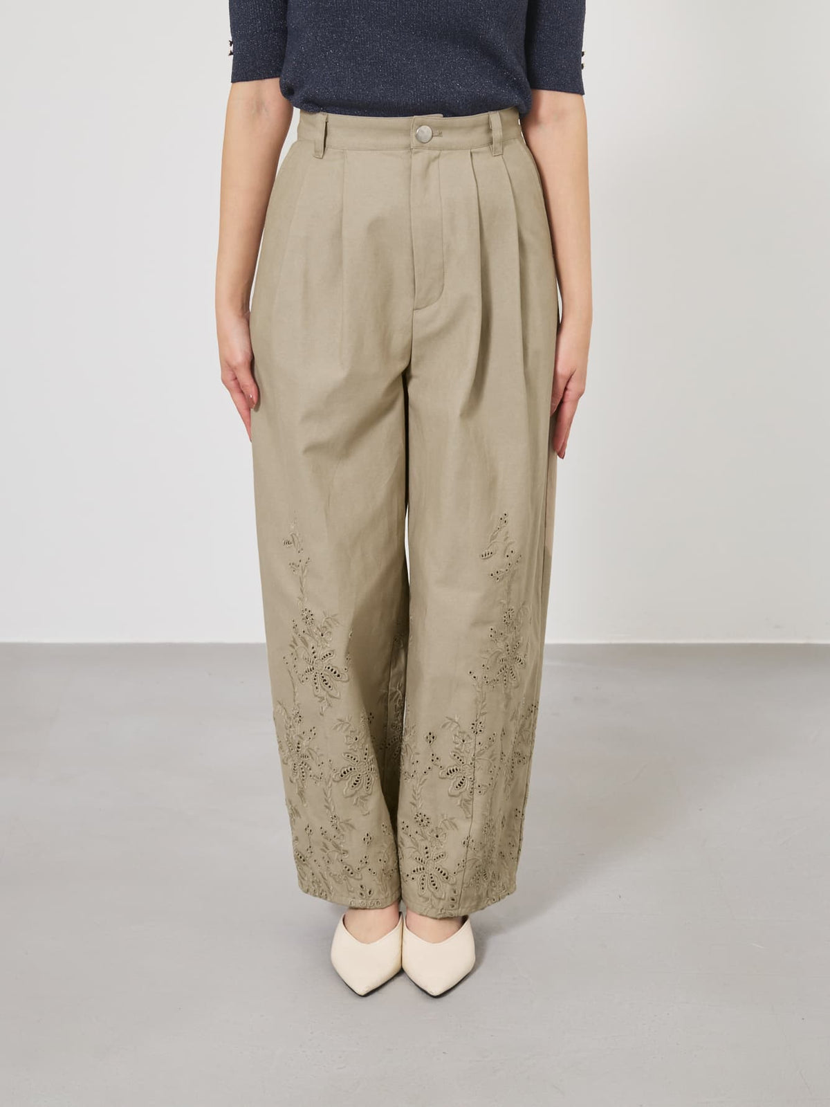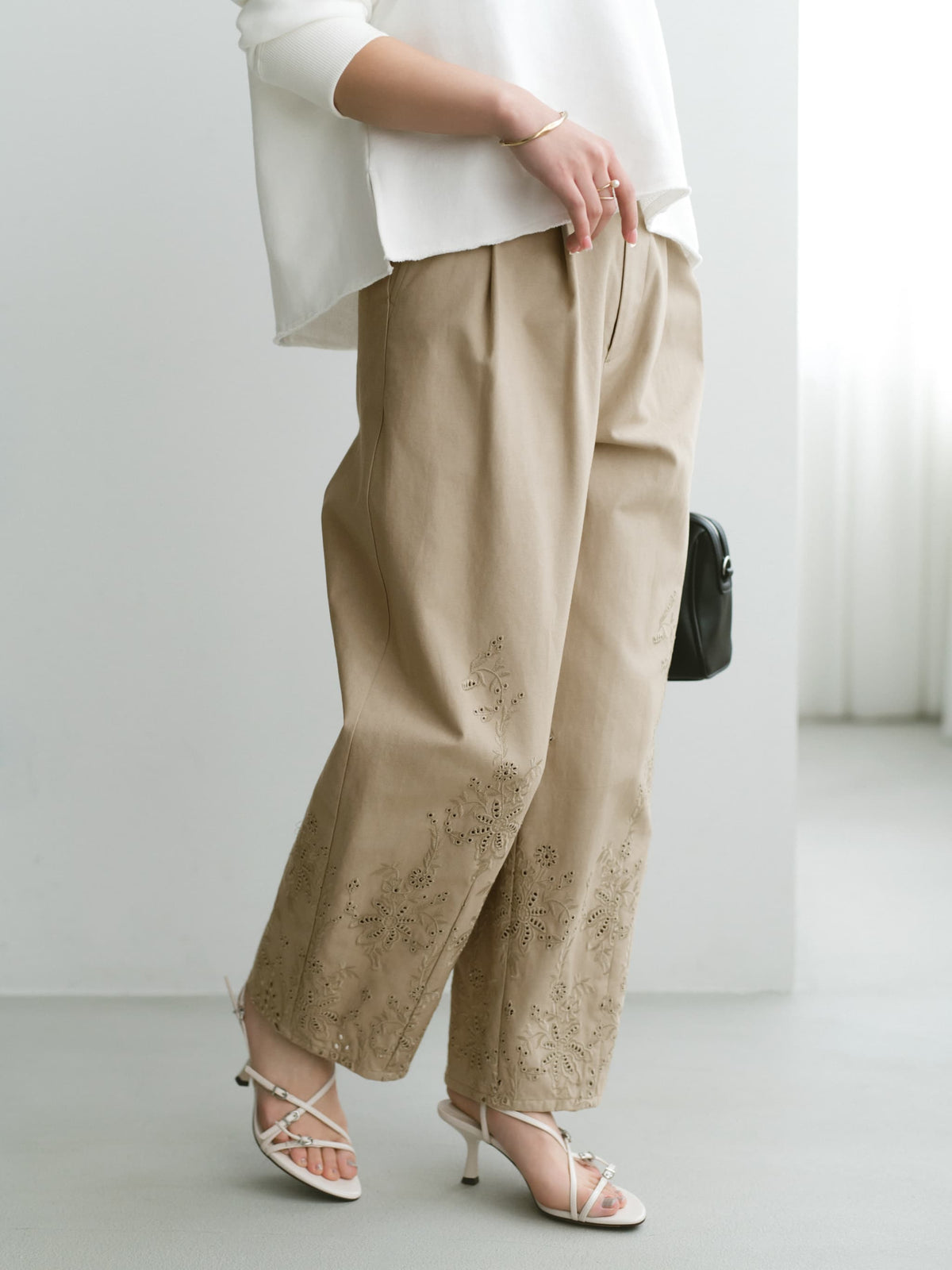 COHINAオリジナルの繊細な刺繍を裾全面にあしらった、存在感のあるカーブタックパンツ。