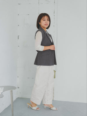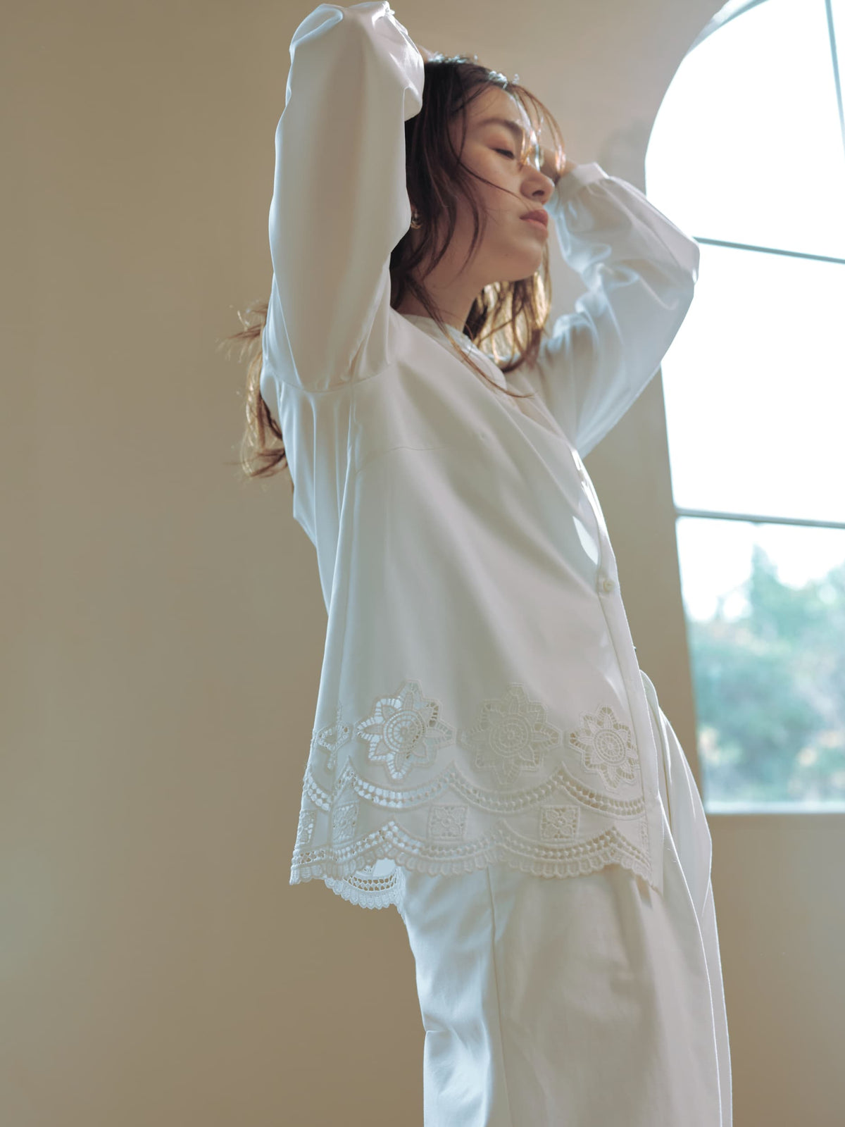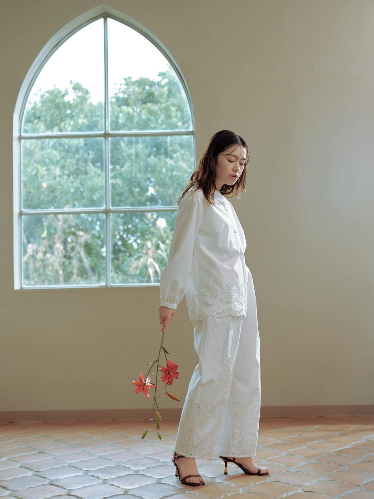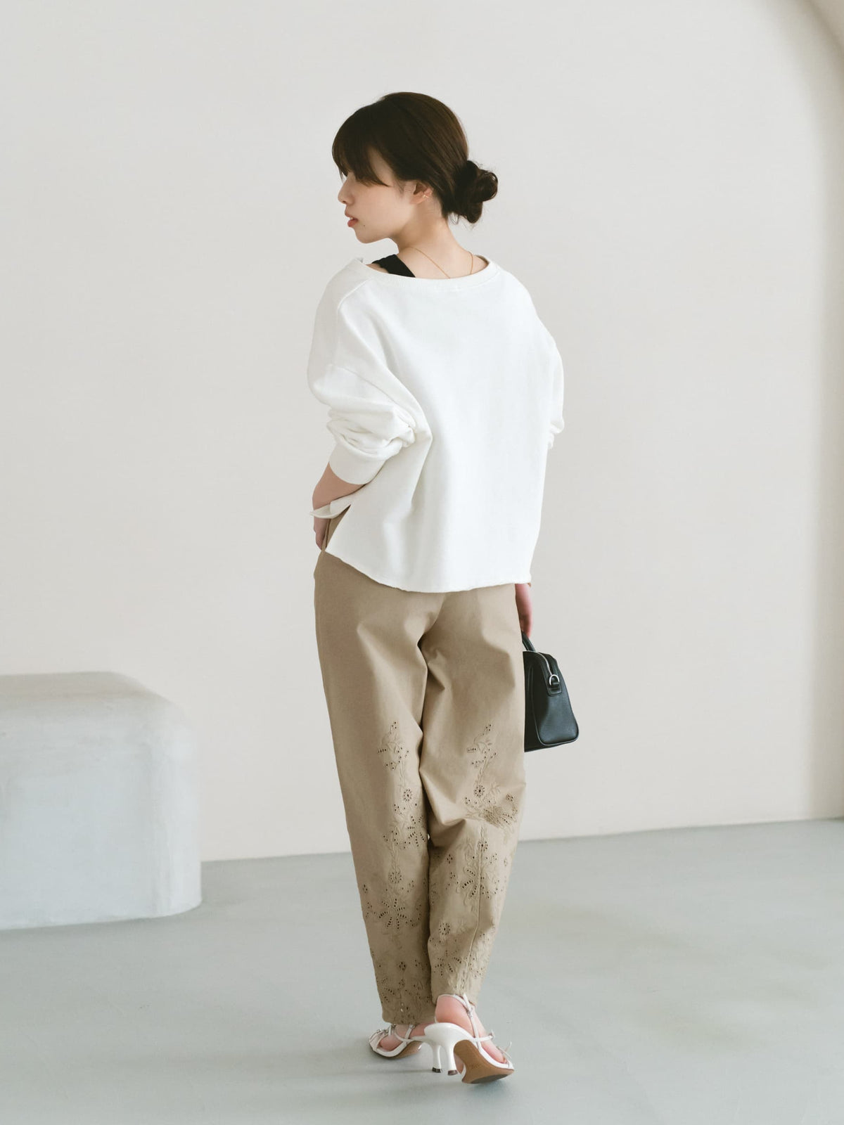 COHINAオリジナルの繊細な刺繍を裾全面にあしらった、存在感のあるカーブタックパンツ。