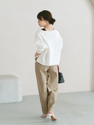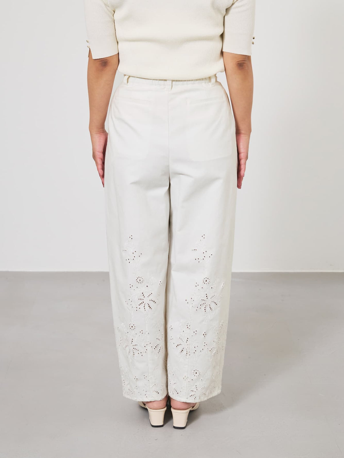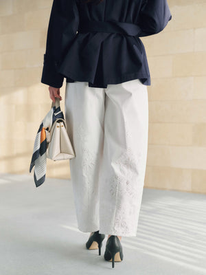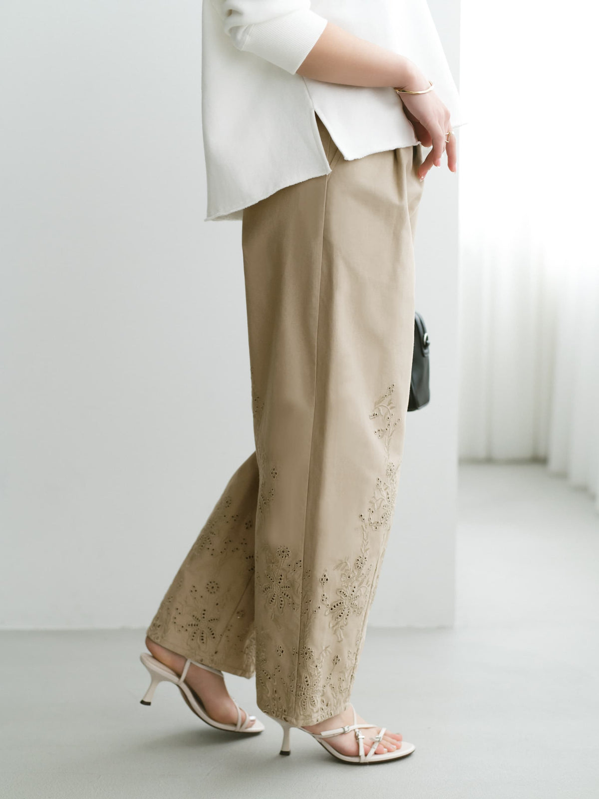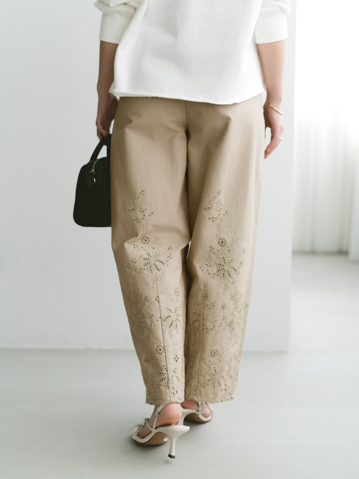 華やかな刺繍が映える、洗練カーブシルエットパンツ