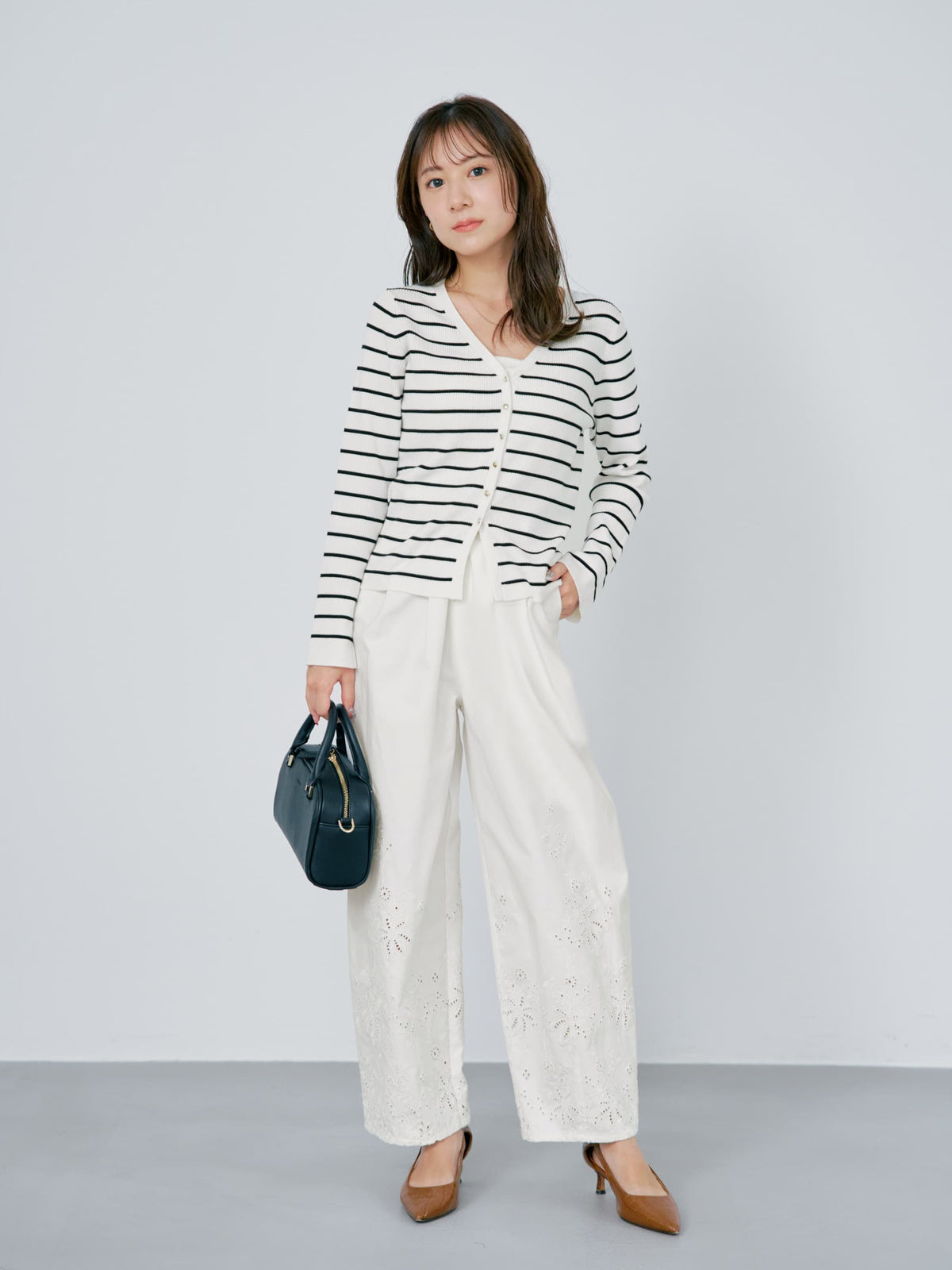 ブラウスやジャケットを合わせて、オフィスにも対応できるきれいめ大人スタイルに。