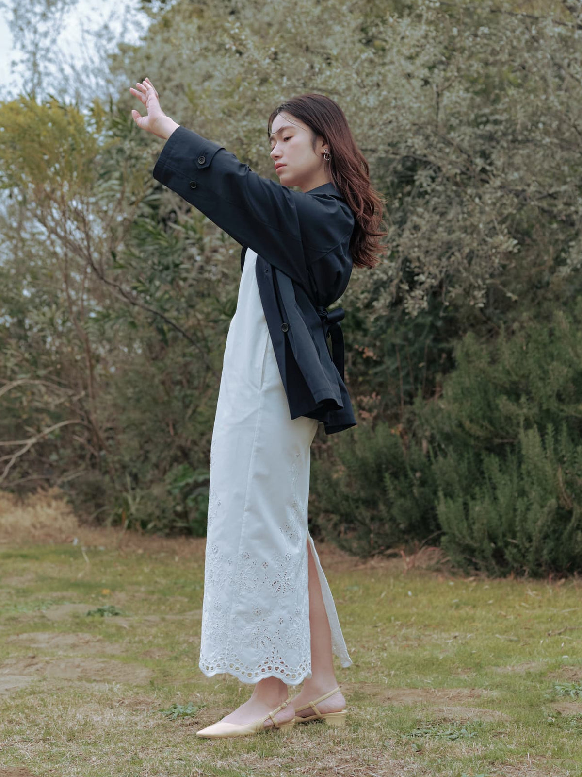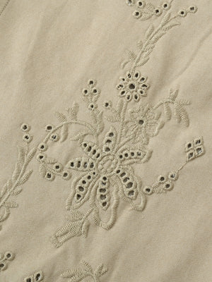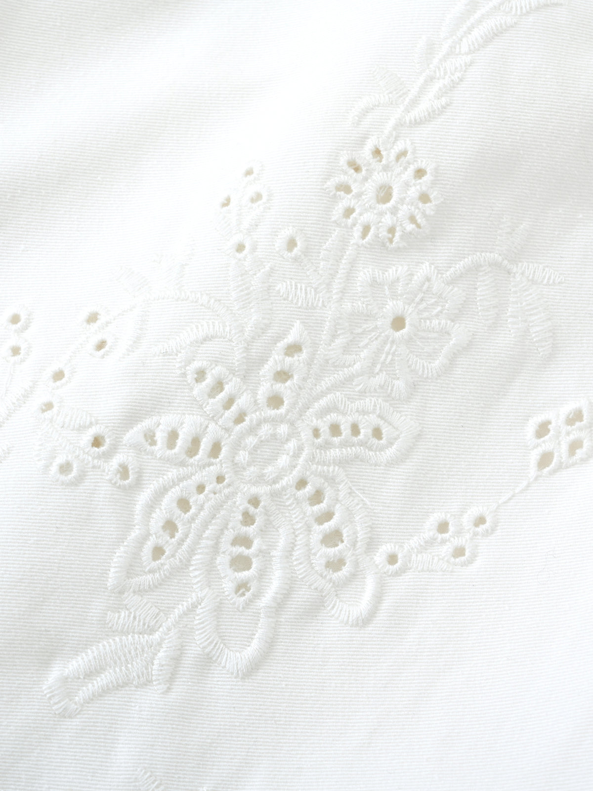 ナチュラルな風合いの生地に、COHINAオリジナル刺繍を施した特別感のある素材。刺繍の立体感がありながらも、主張しすぎない繊細な柄行きで上品な印象に。