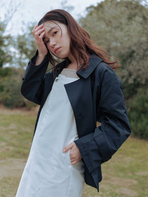 すとんと落ちるIラインシルエットが甘さを抑え、大人っぽく洗練された印象に仕上げました。インナー次第で表情が変わり、ロングシーズン活躍する1着。