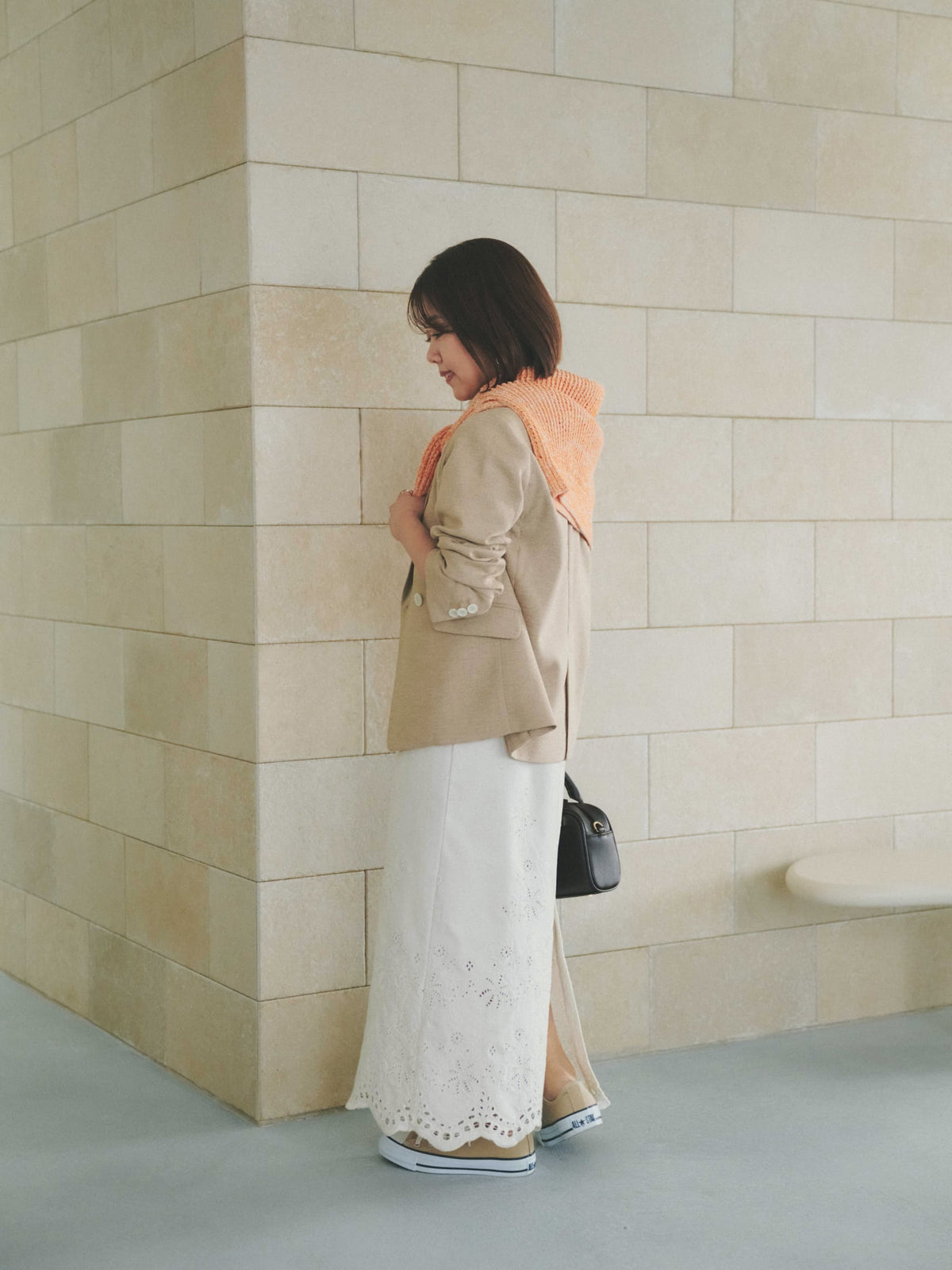 シアーインナーやリブニットを合わせて、やわらかな女性らしいフェミニンスタイルに。ブラウス合わせで、きちんと感のあるきれいめ大人コーデに。