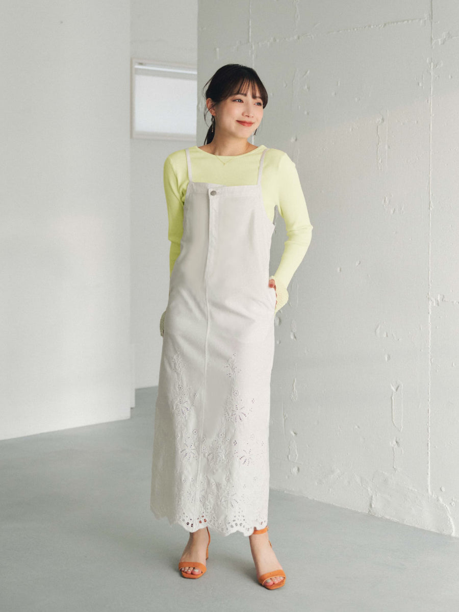着るだけで一気に春気分が高まるジャンパースカートは、繊細な刺繍が可愛すぎる♡身長148cmでふくらはぎが隠れる丈なので大人っぽくフルレングスで着用できます!