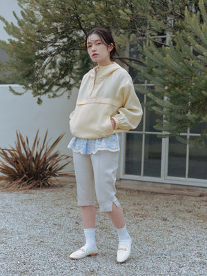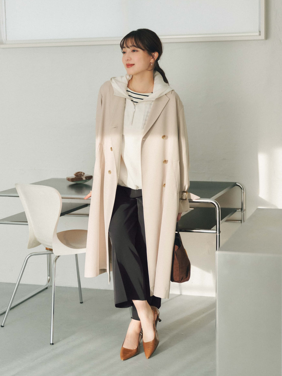 フードを2枚仕立てにすることで立体感を出し、小柄な方でも大きすぎないようバランスを調整しました。裾はドロストデザインでシルエットの変化を楽しめます。