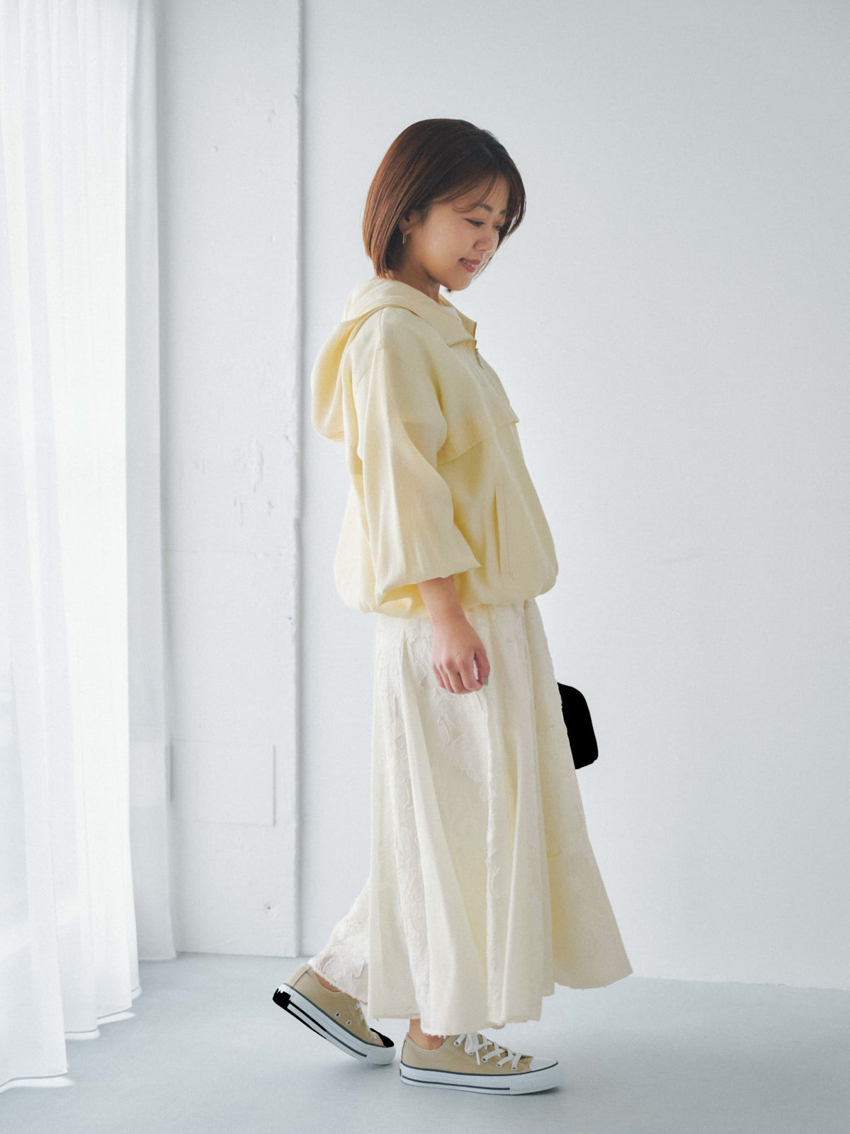 シアー感と光沢感があり、軽さと表情のある柔らかい素材を使用することにより、スポーティーなアイテムもグッと女性らしい印象に。