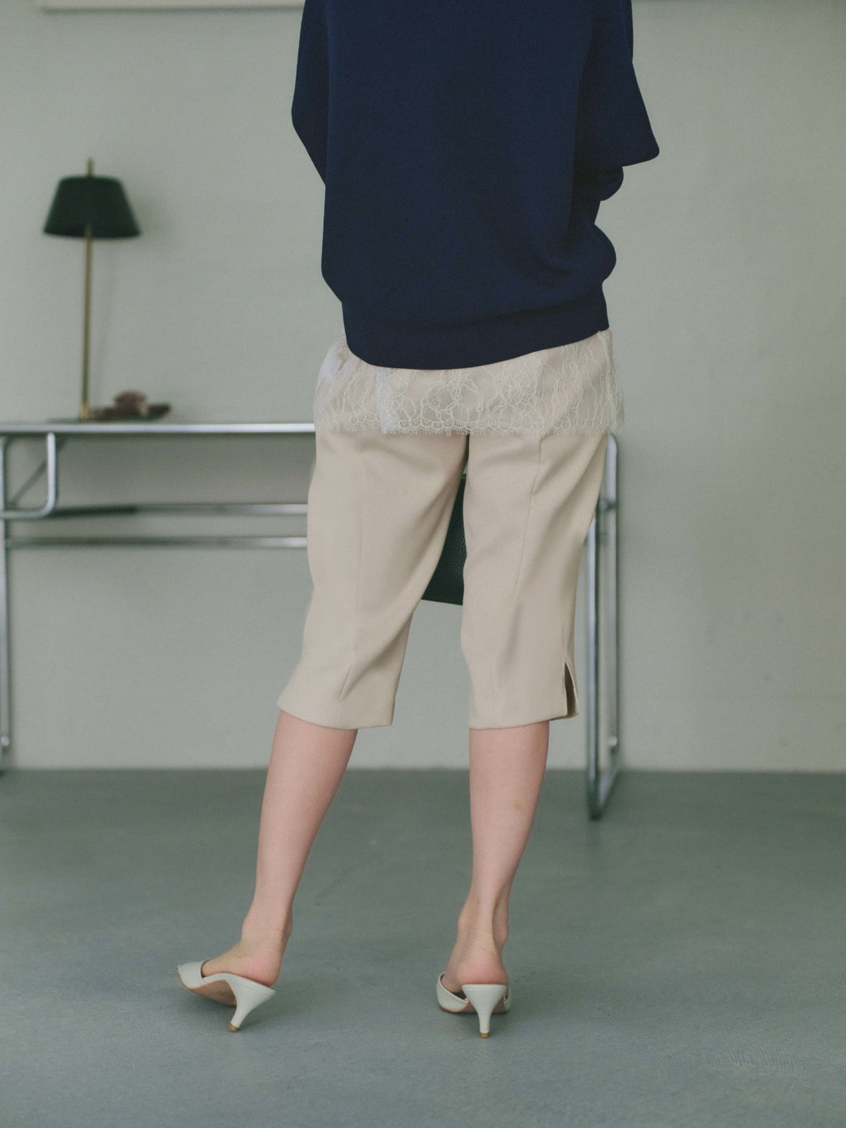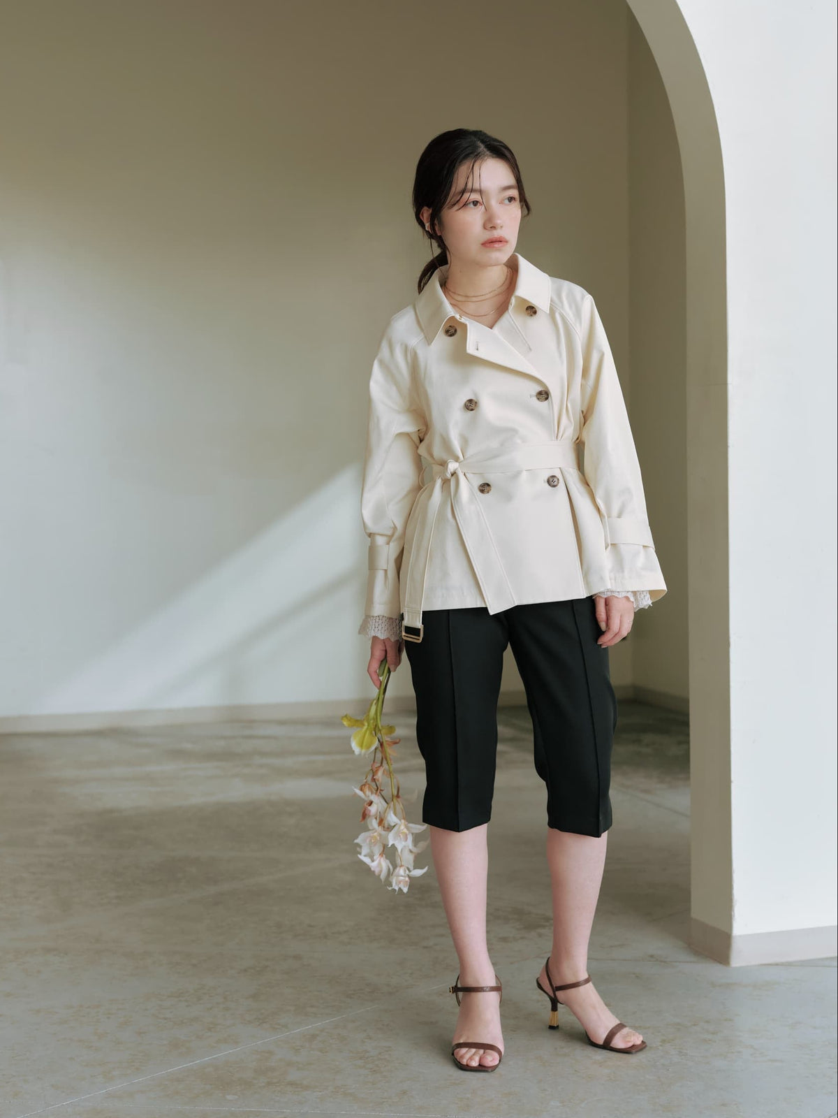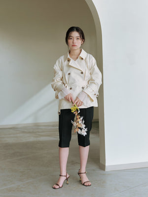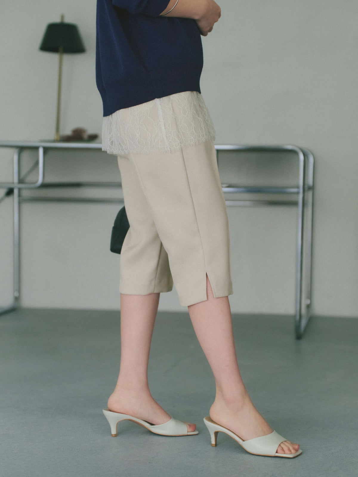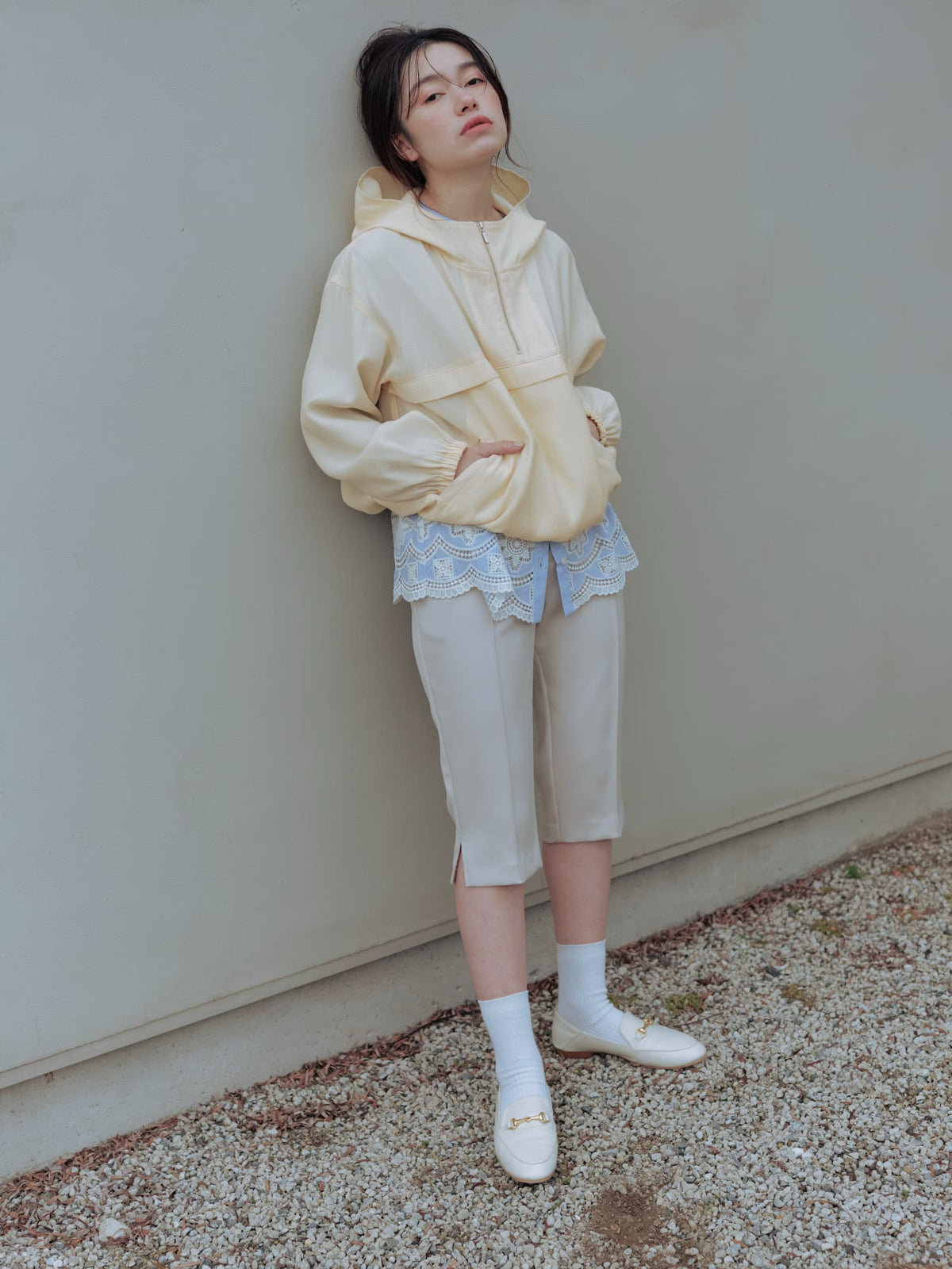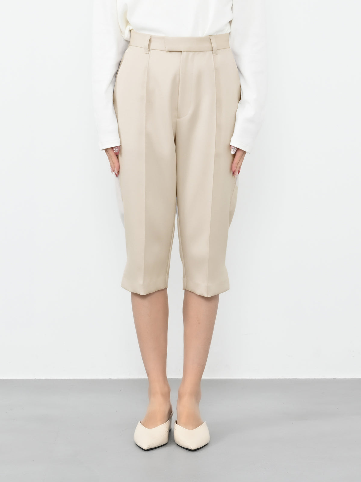 軽やかな足元を演出する6分丈のパンツは、オーバーシルエットのトップスと合わせることで、メリハリのあるスタイリングが完成します。