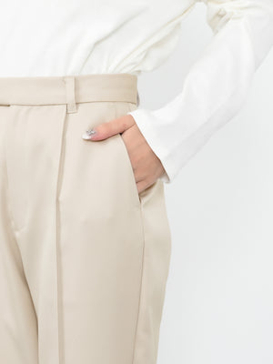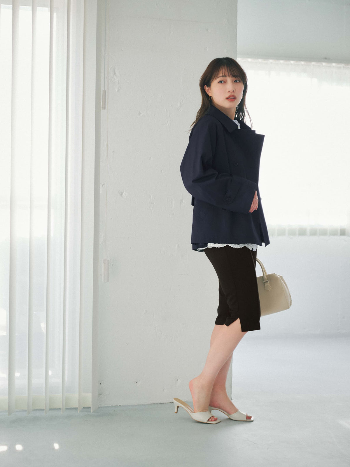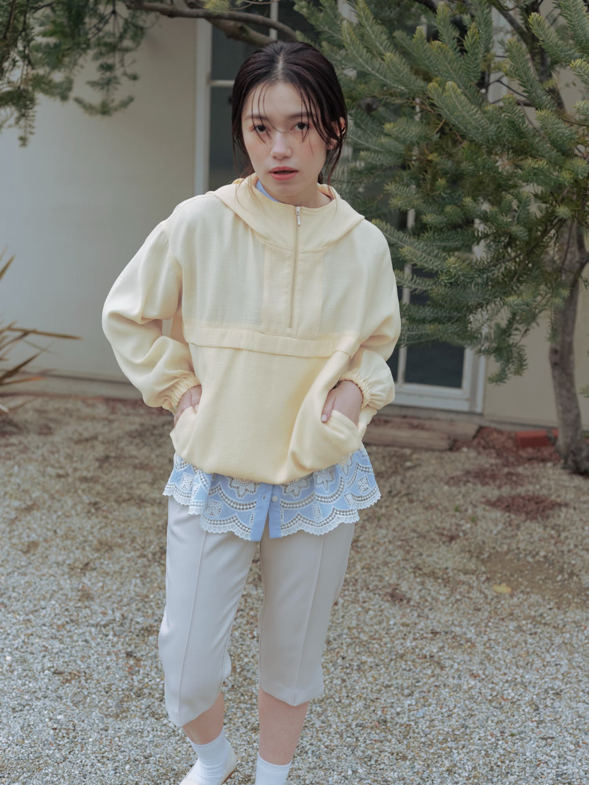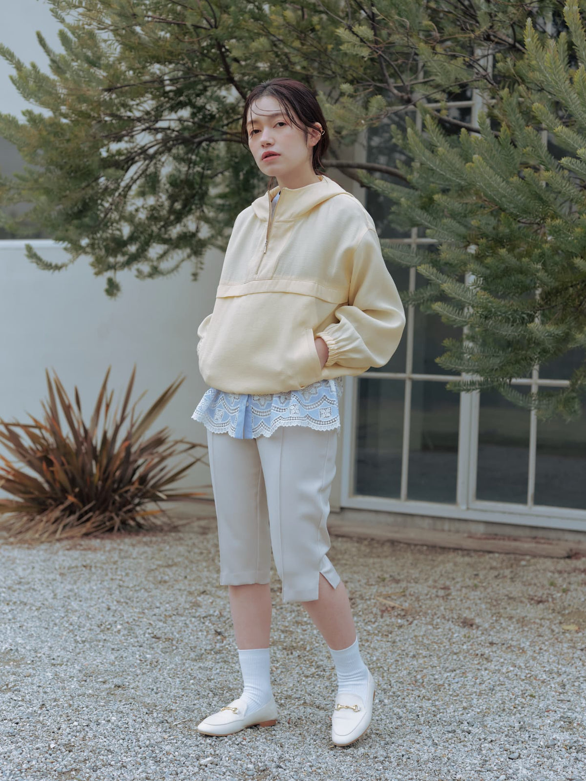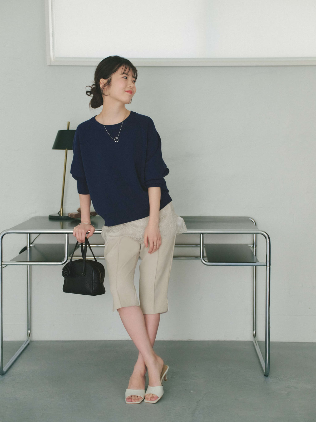 軽やかな足元を演出する6分丈のパンツは、オーバーシルエットのトップスと合わせることで、メリハリのあるスタイリングが完成します。