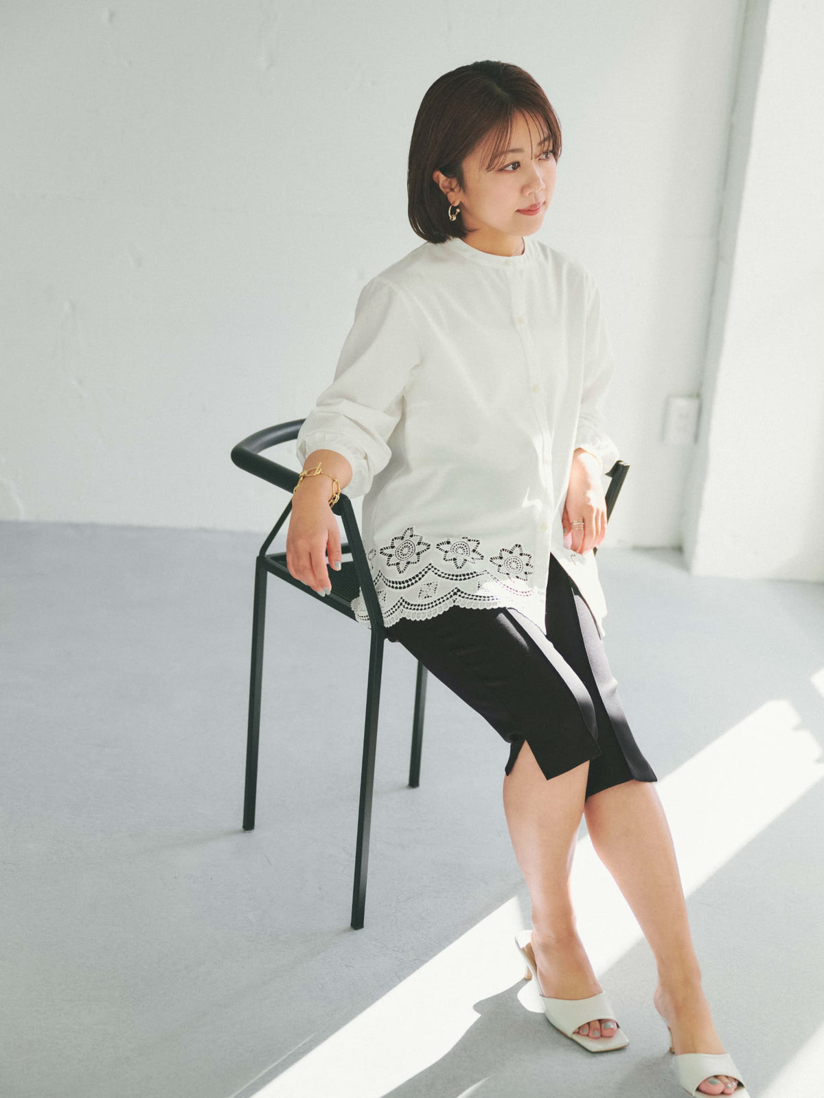 刺繍シャツやレースアイテムなどフェミニンな合わせも好相性◎