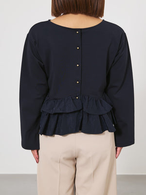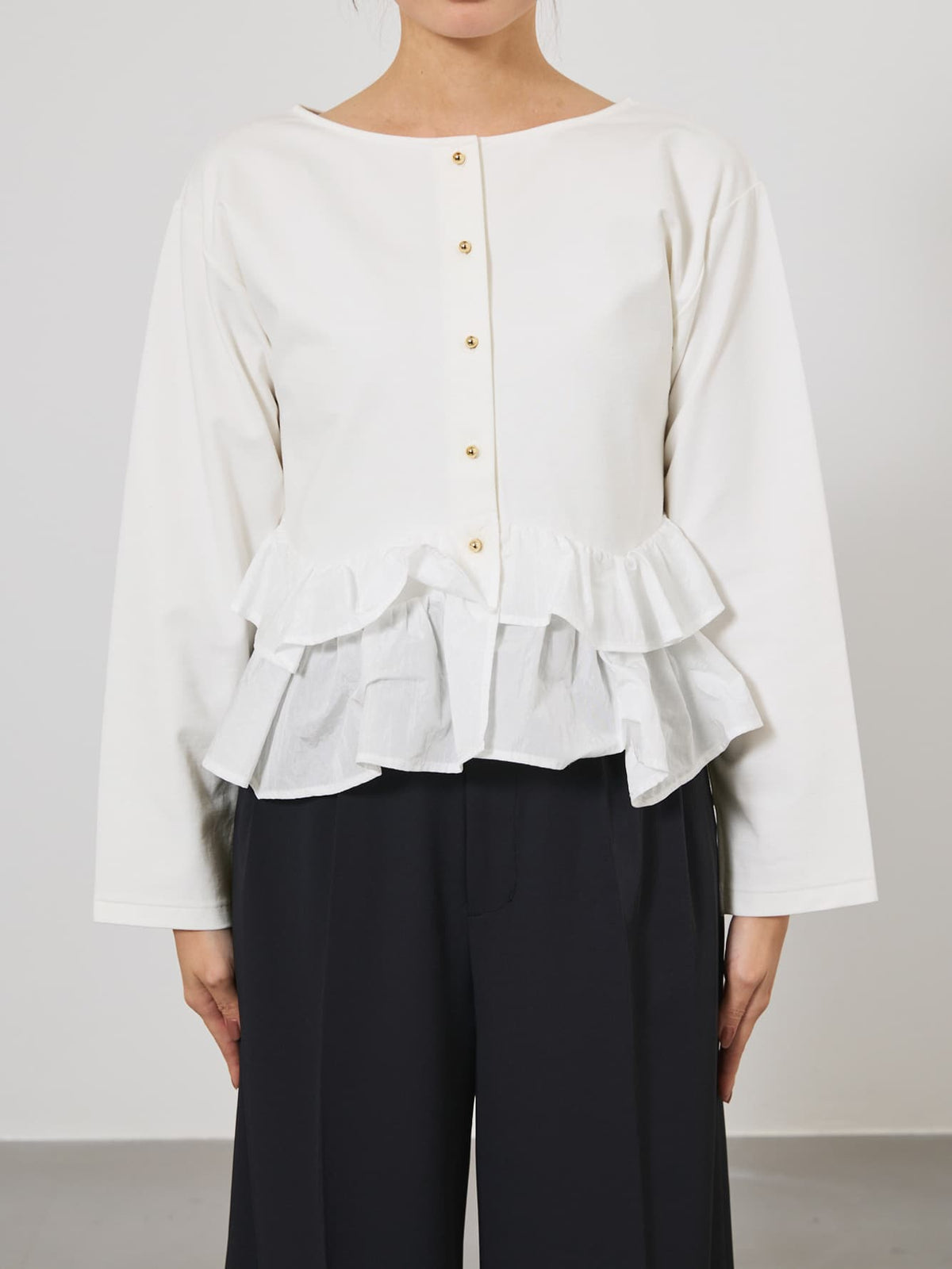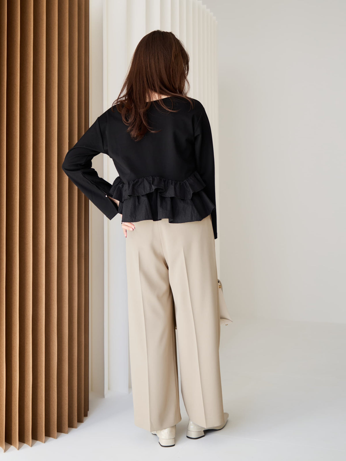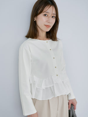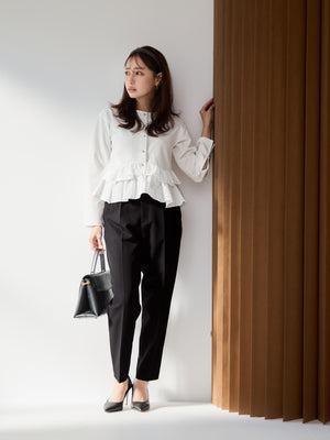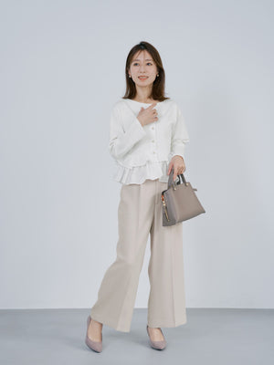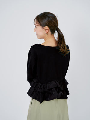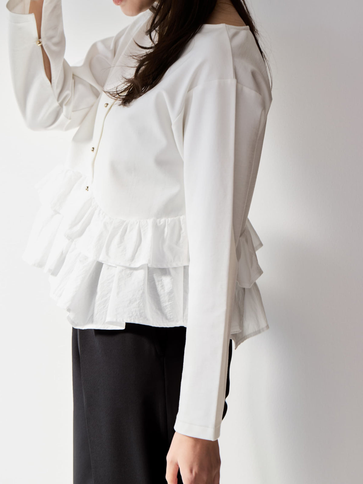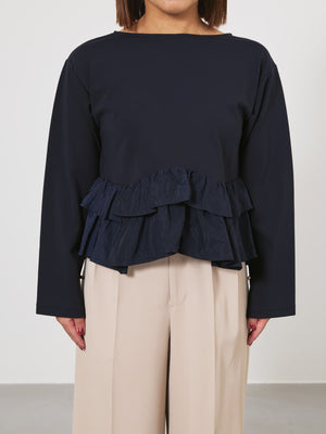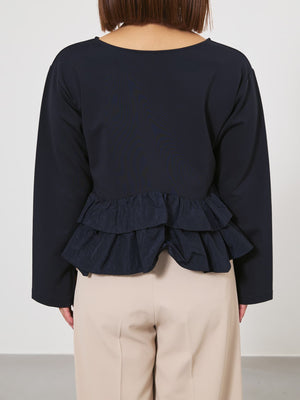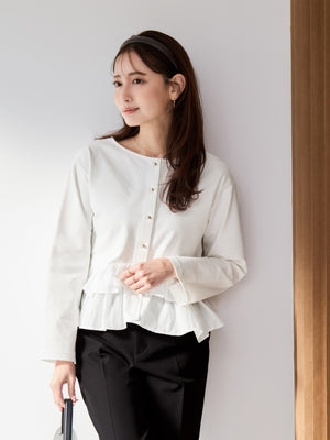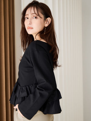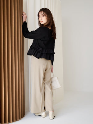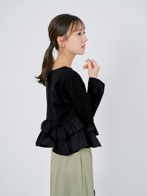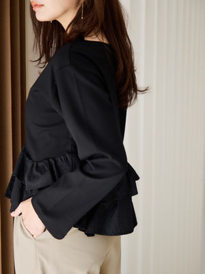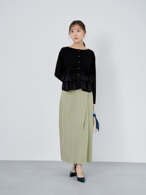 異素材でブロッキングされたティアードヘムデザインが印象的。動くたびにふわりと揺れるペプラムシルエットが、自然とウエスト位置を高く見せ、スタイルアップを叶えます。