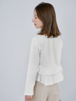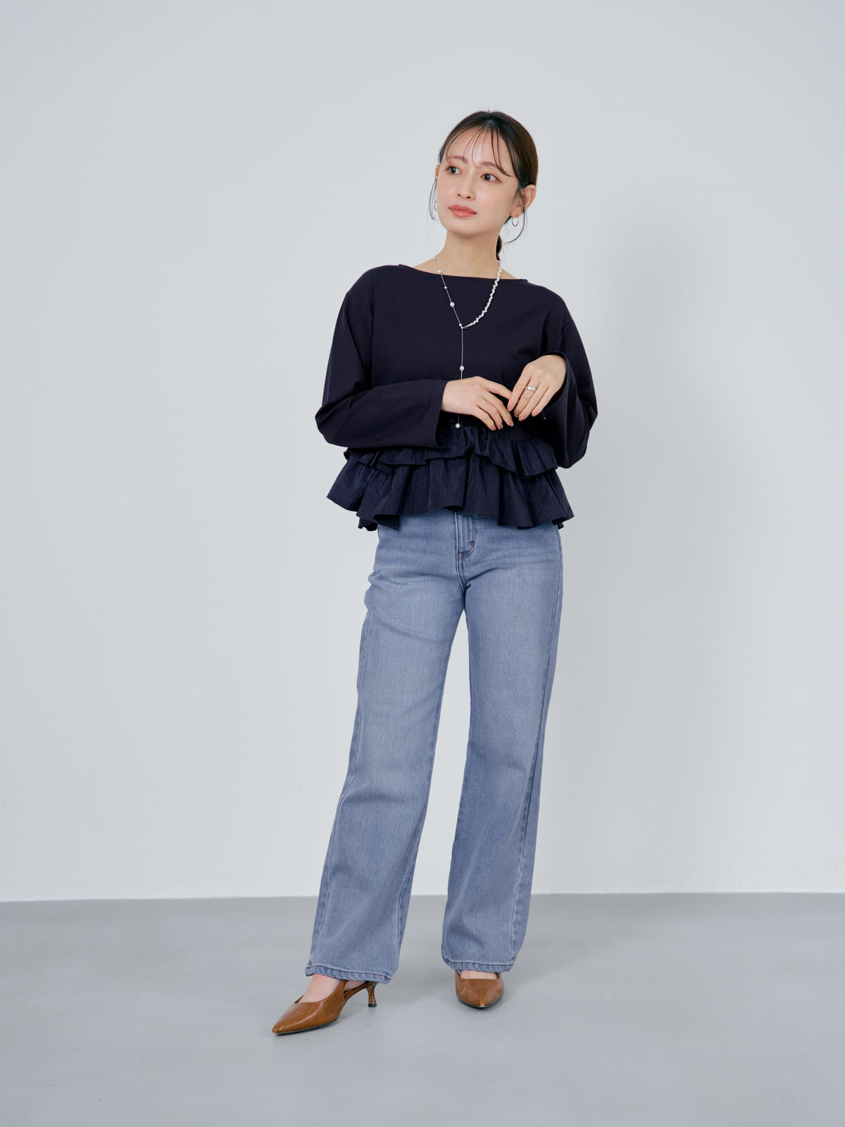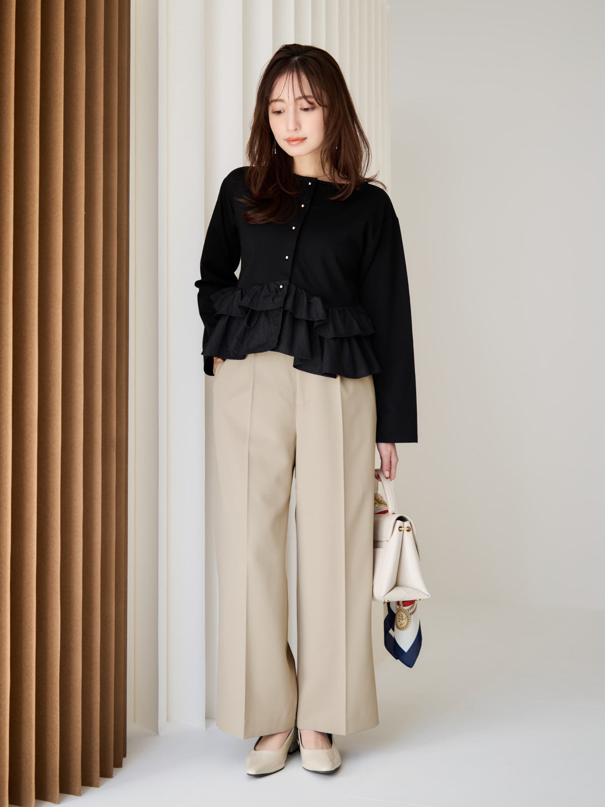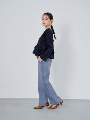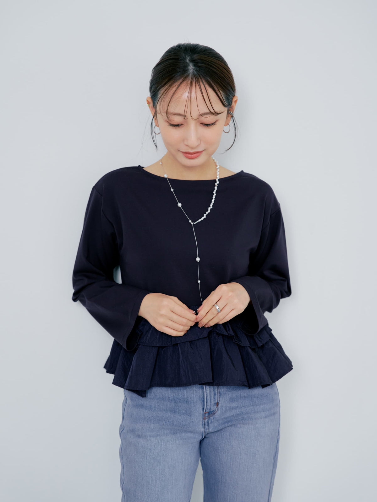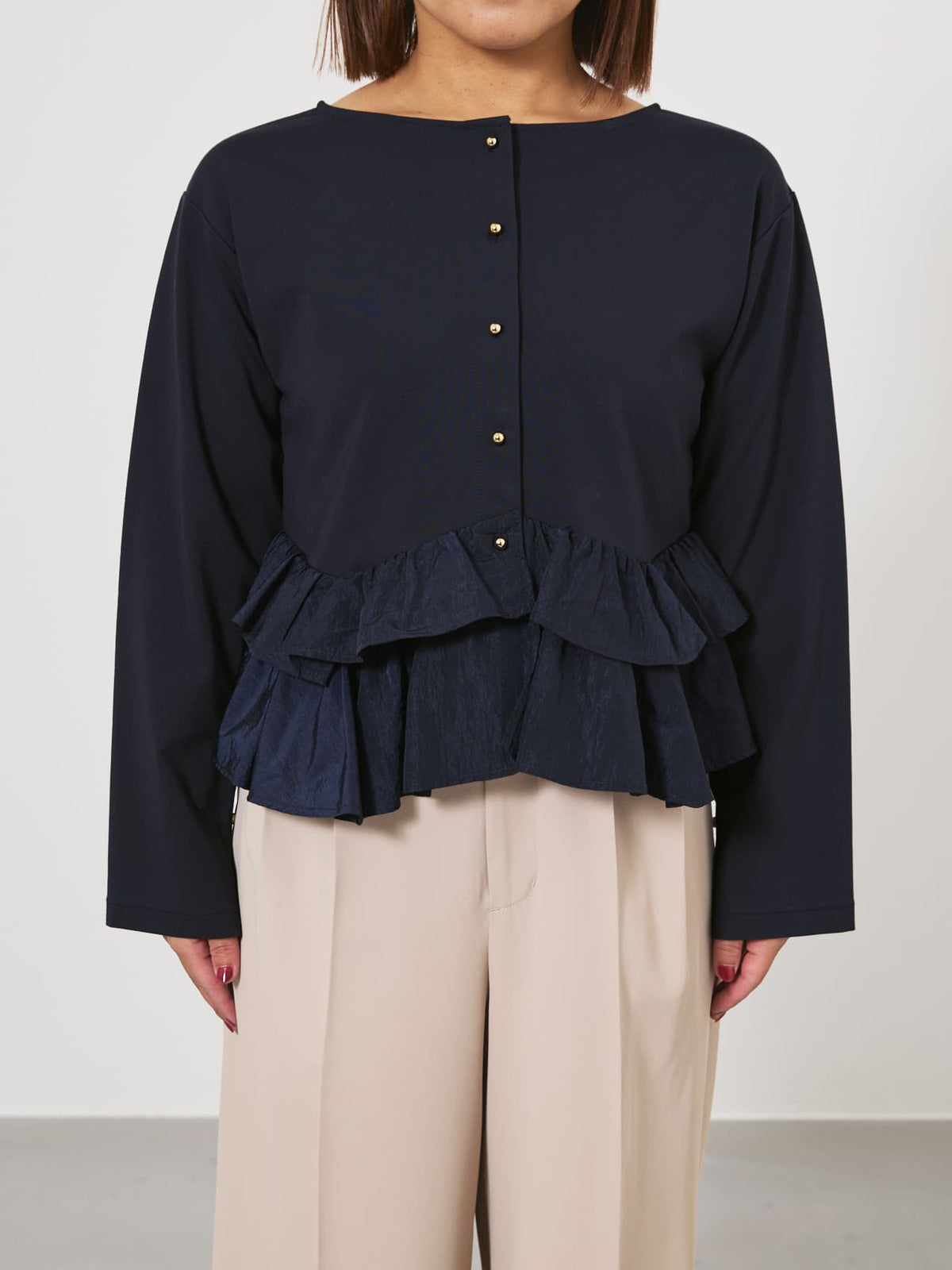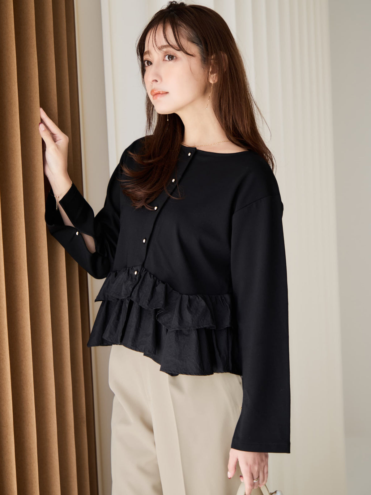 異素材でブロッキングされたティアードヘムデザインが印象的。動くたびにふわりと揺れるペプラムシルエットが、自然とウエスト位置を高く見せ、スタイルアップを叶えます。