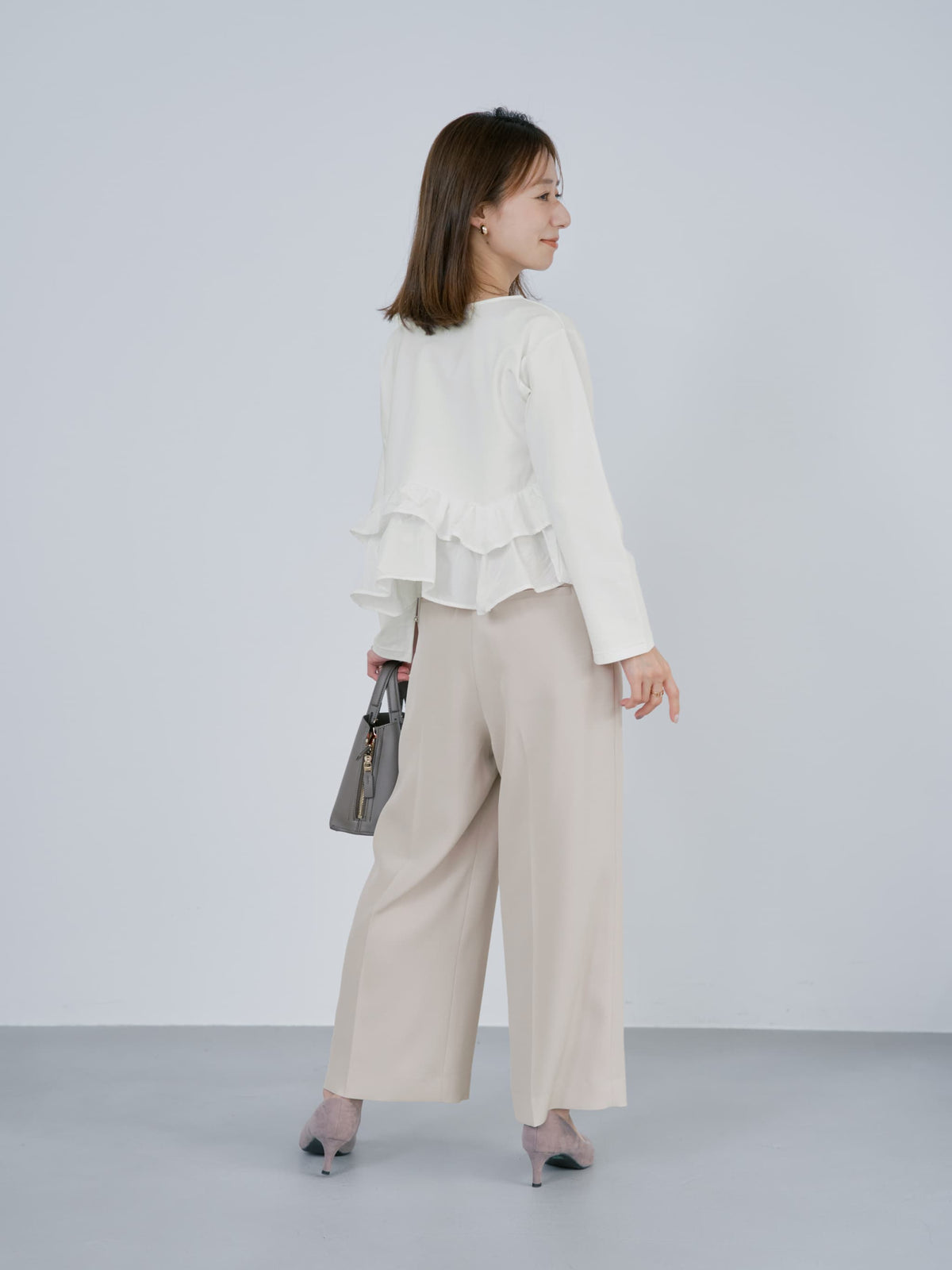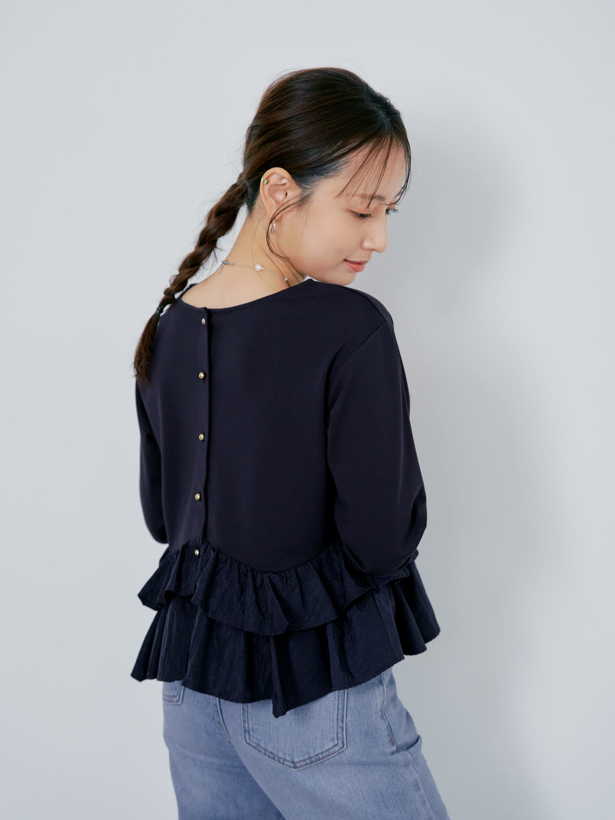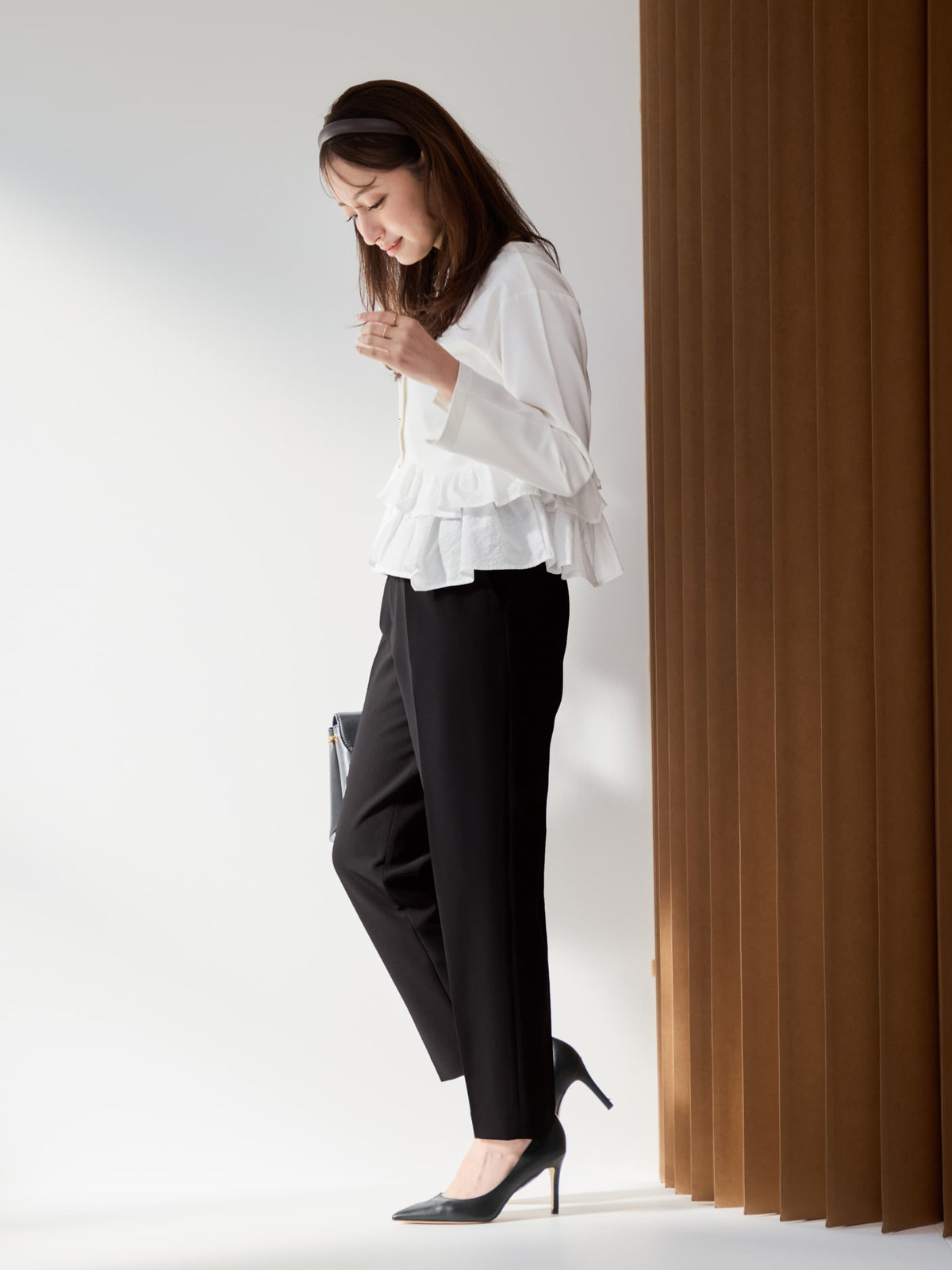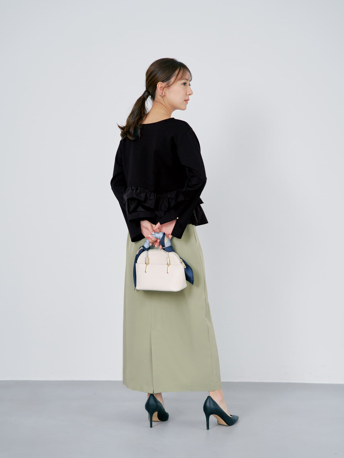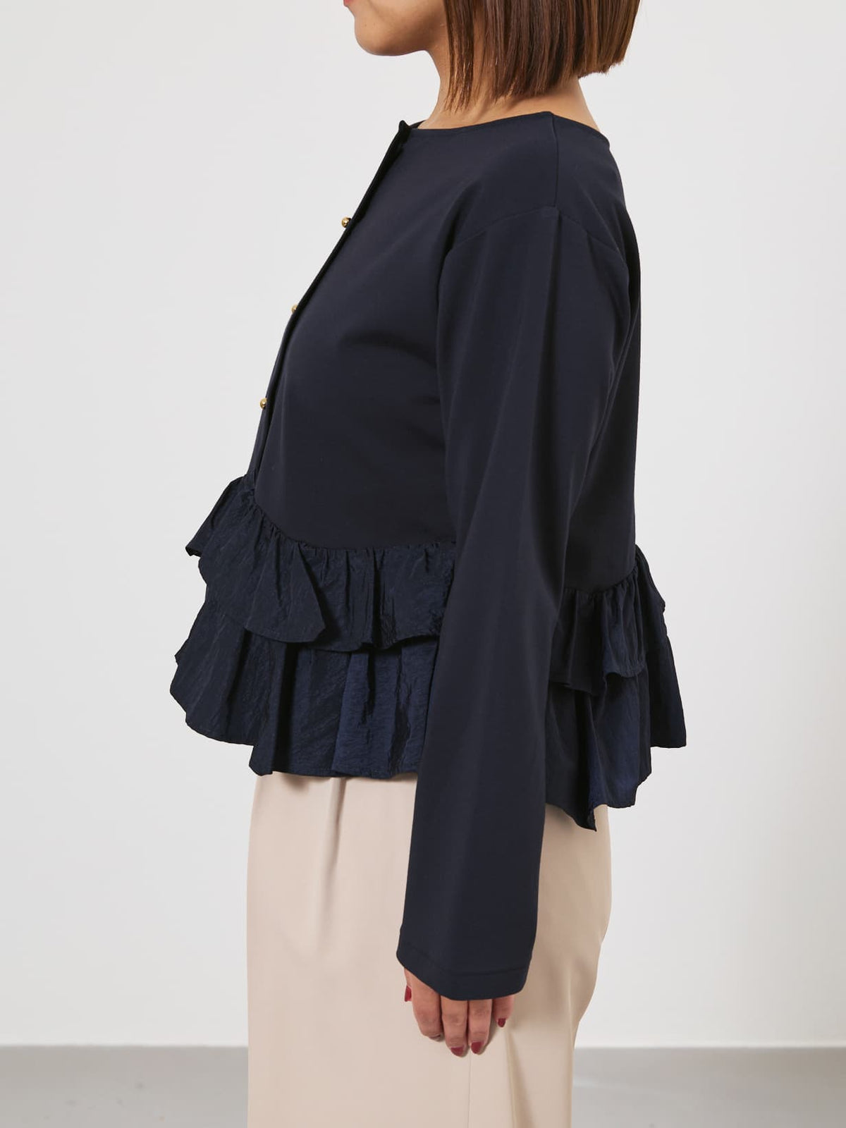 異素材でブロッキングされたティアードヘムデザインが印象的。動くたびにふわりと揺れるペプラムシルエットが、自然とウエスト位置を高く見せ、スタイルアップを叶えます。
