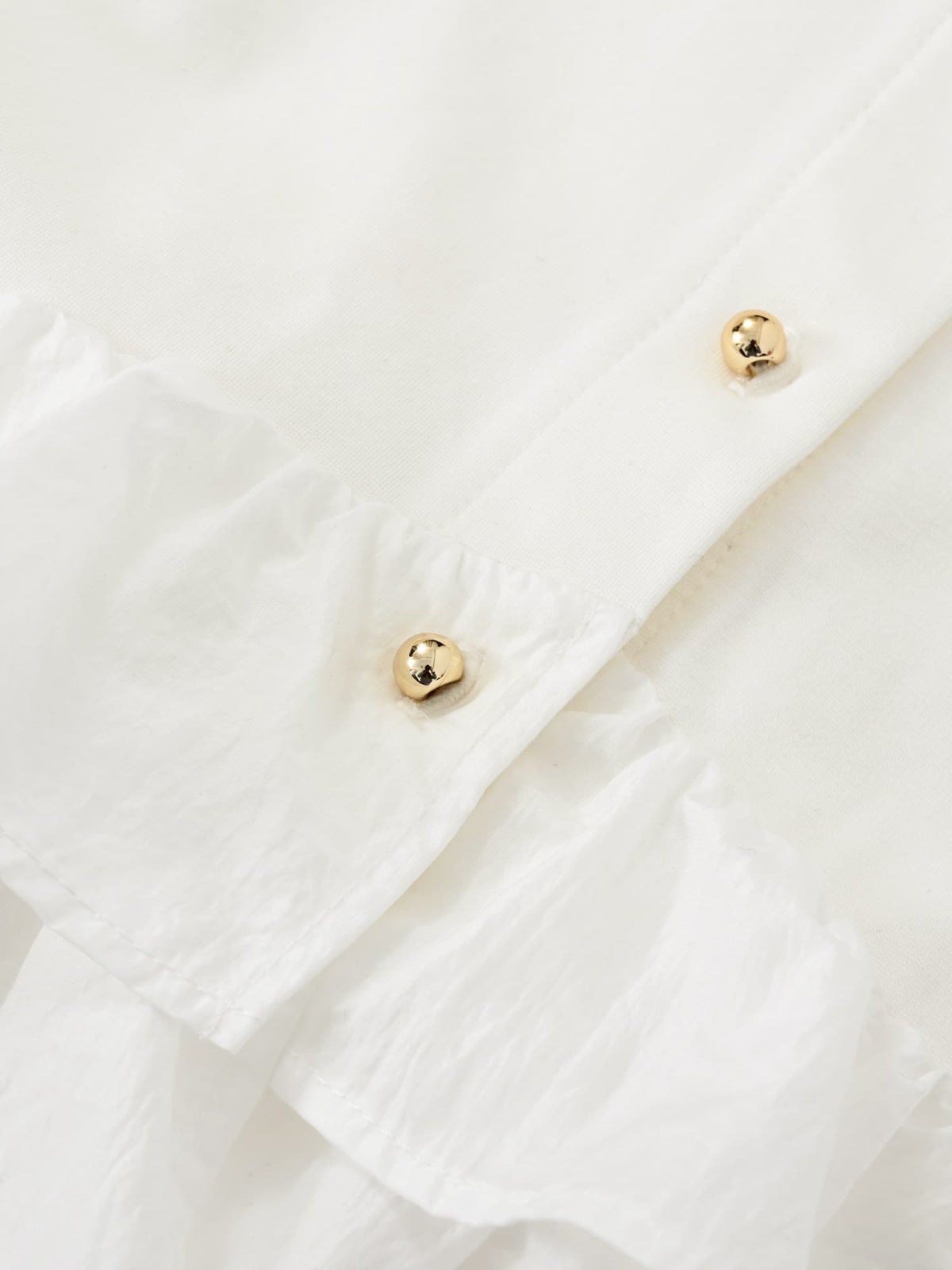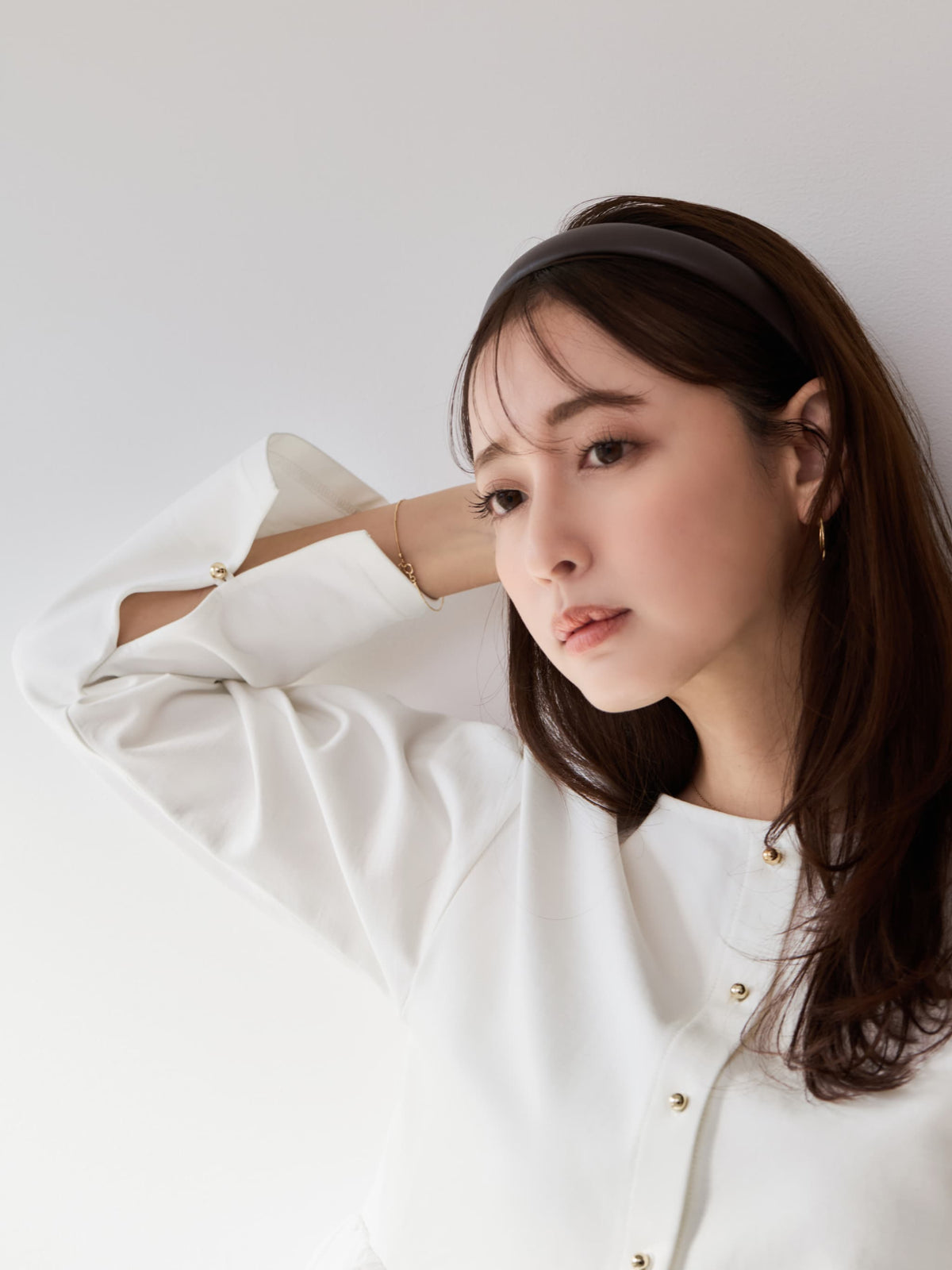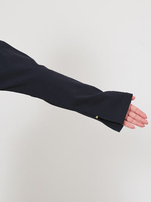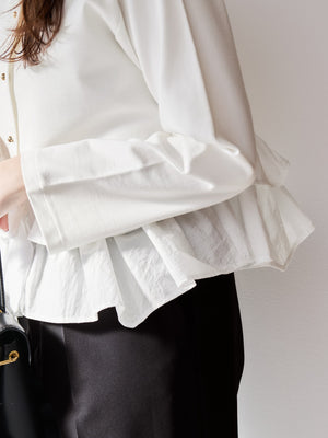 フロントにはリトルゴールドボタンをあしらい、さりげない上品さをプラス。袖口にはスリットデザインを施し、手元まで抜け感のある印象に仕上げました。