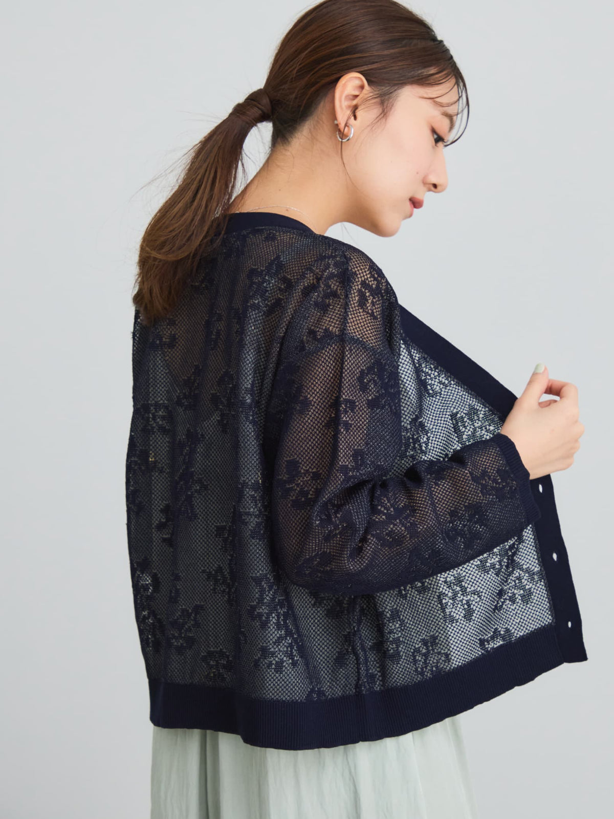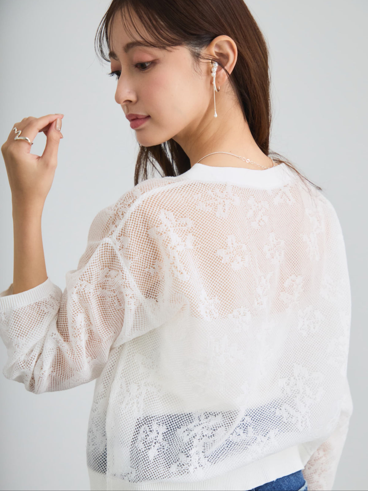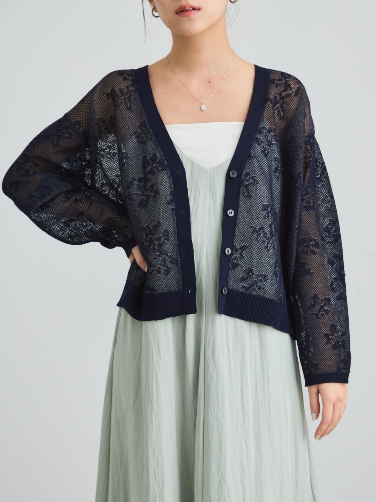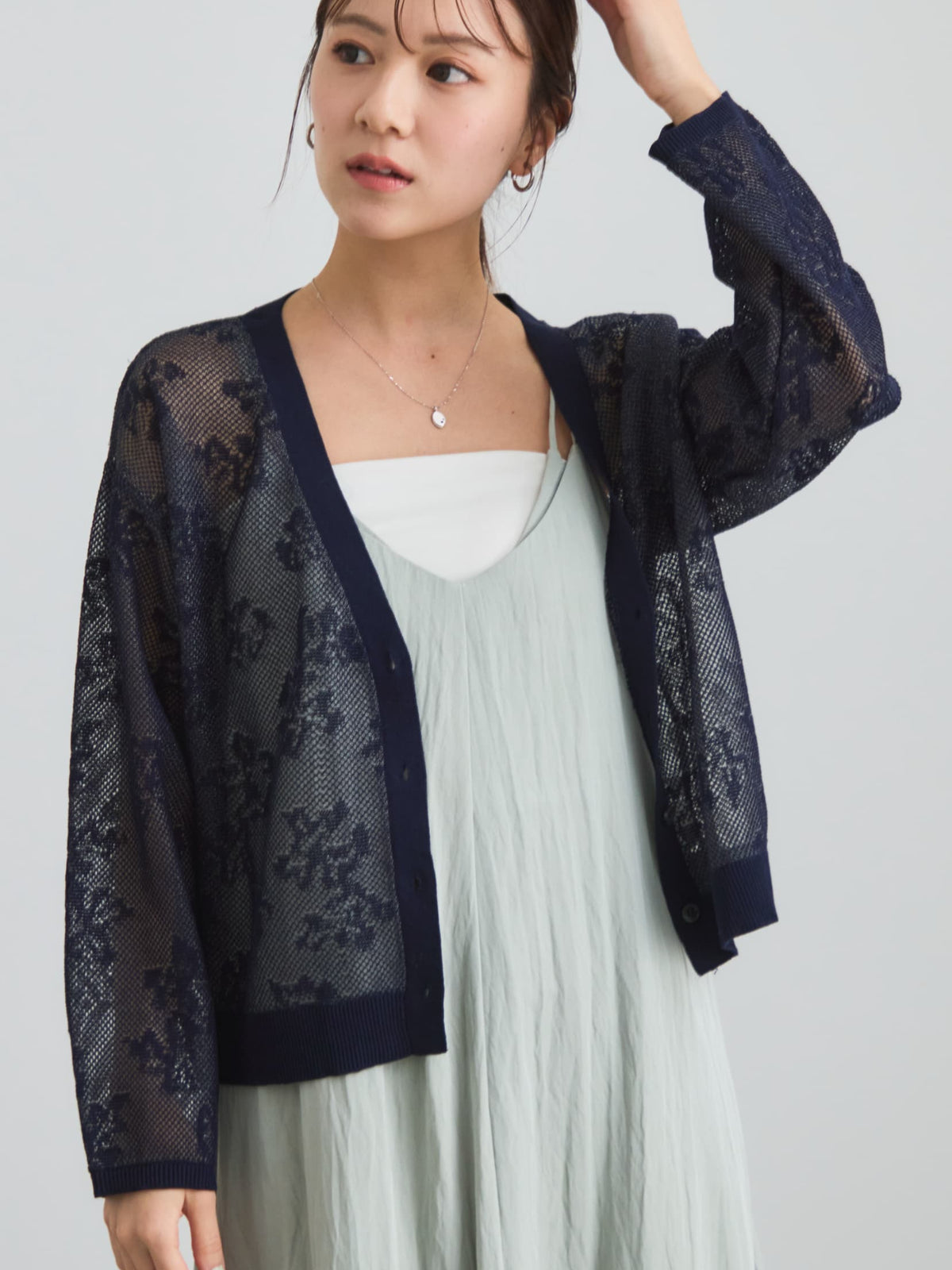繊細なボタニカル柄がふわりと浮かび上がる、軽やかなシアーカーディガンが登場。