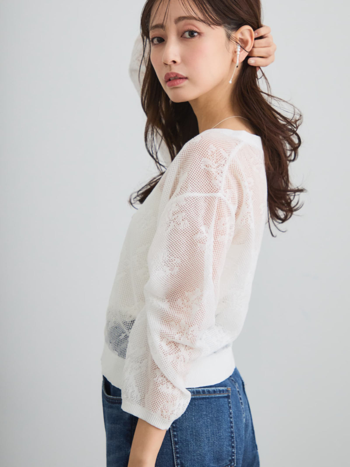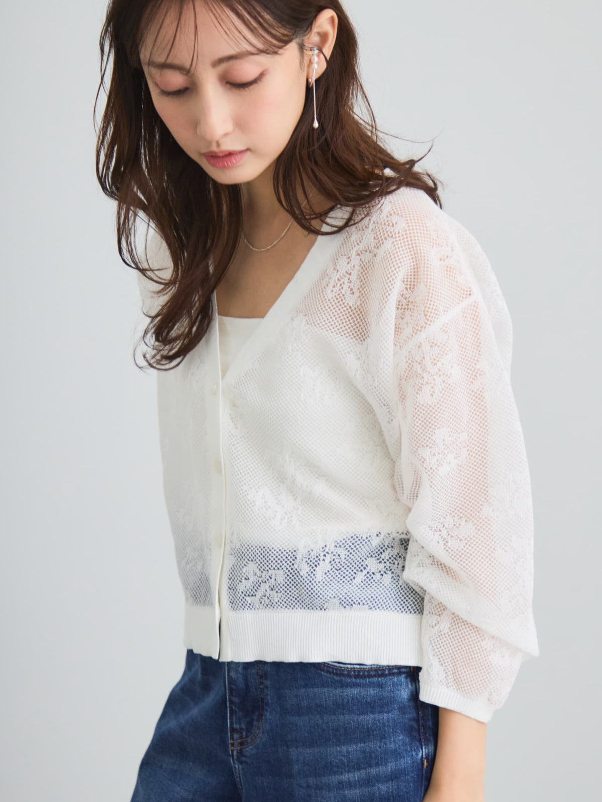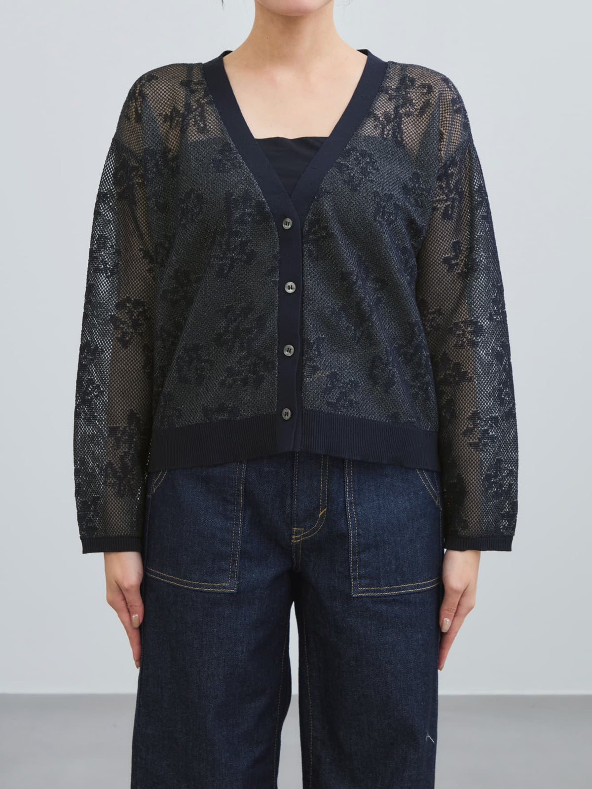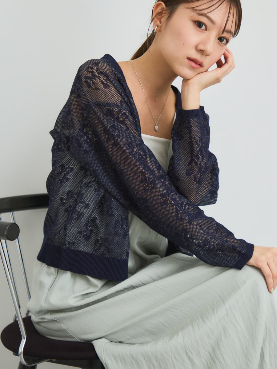繊細なボタニカル柄がふわりと浮かび上がる、軽やかなシアーカーディガンが登場。