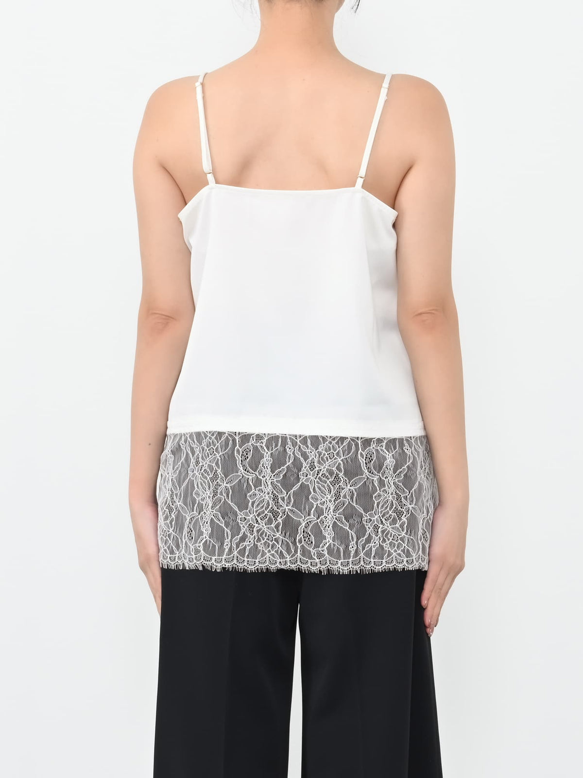 旬なレイヤードスタイルを楽しめる、レースドッキングのキャミソール。裾にあしらった繊細なレースは、着丈感や分量感にこだわり、小柄さんにぴったりなバランスに仕上げました。