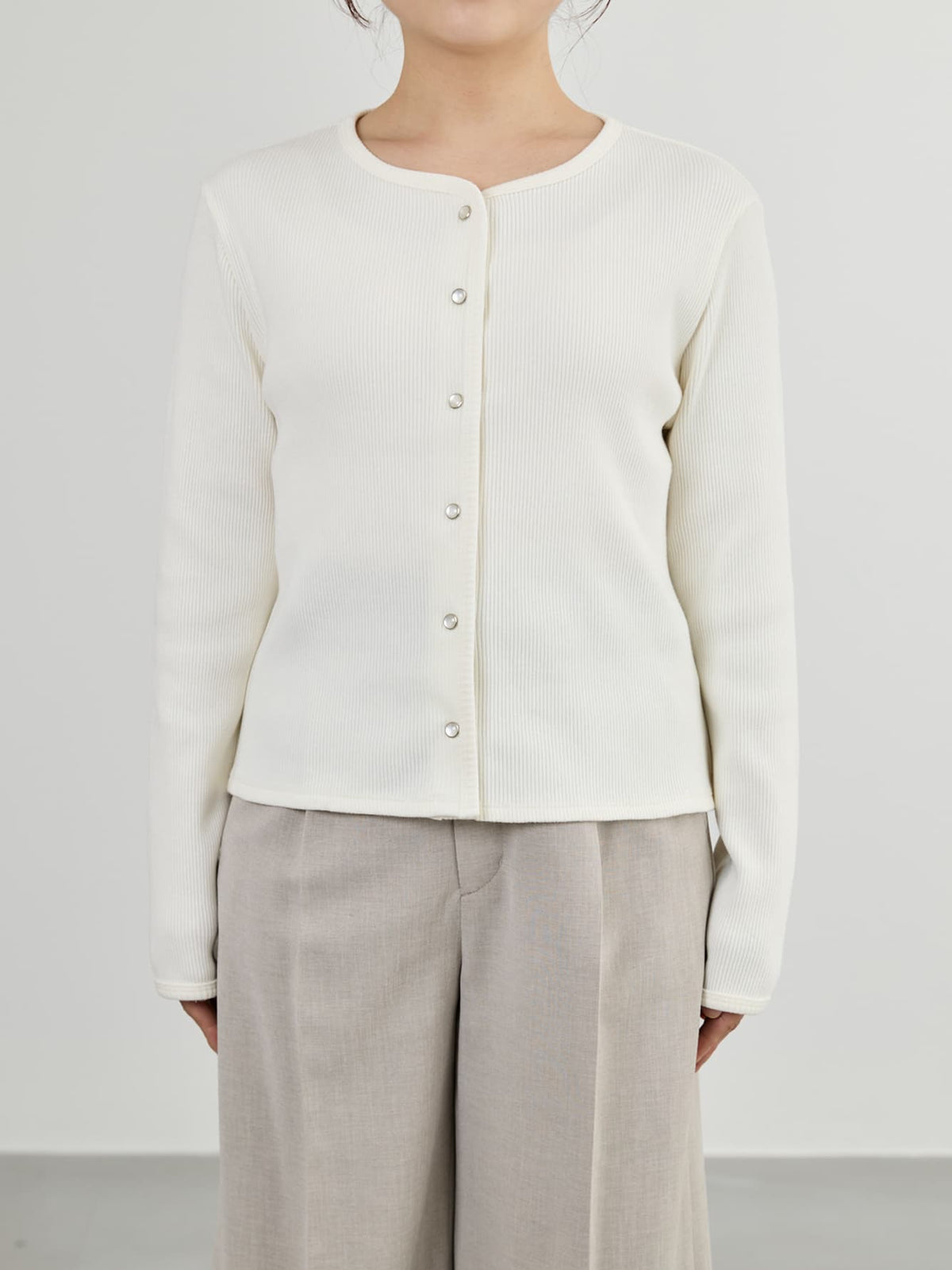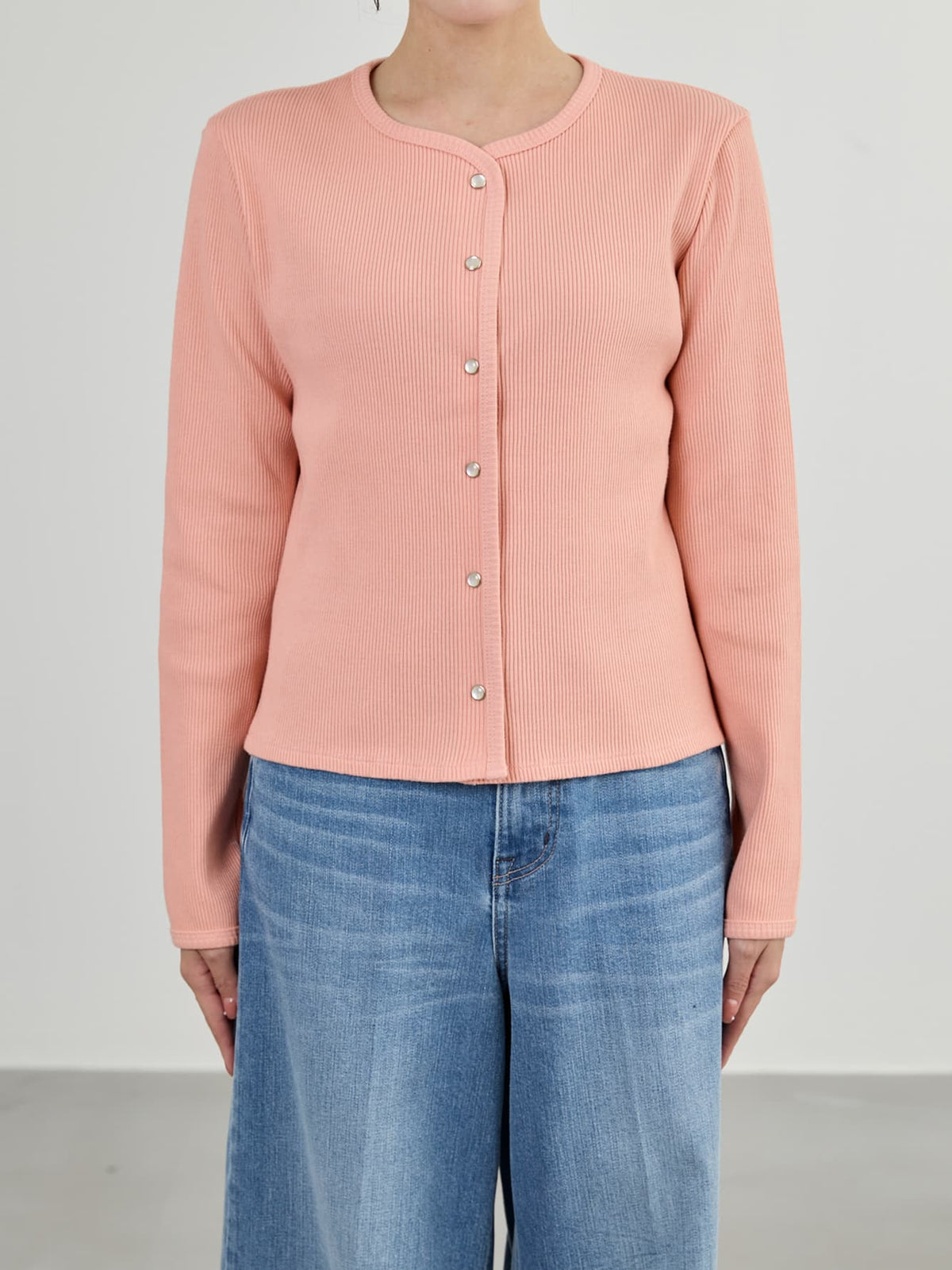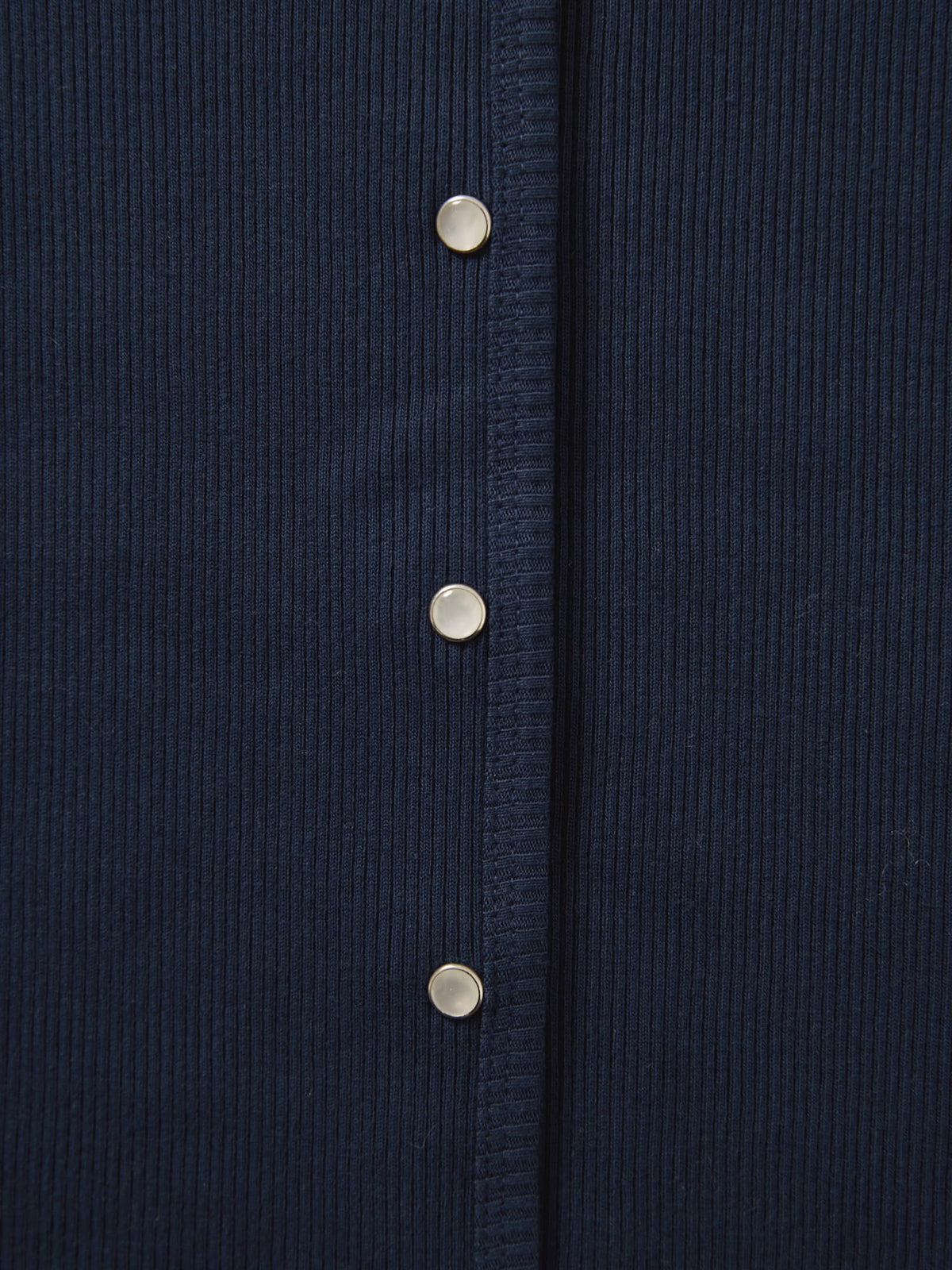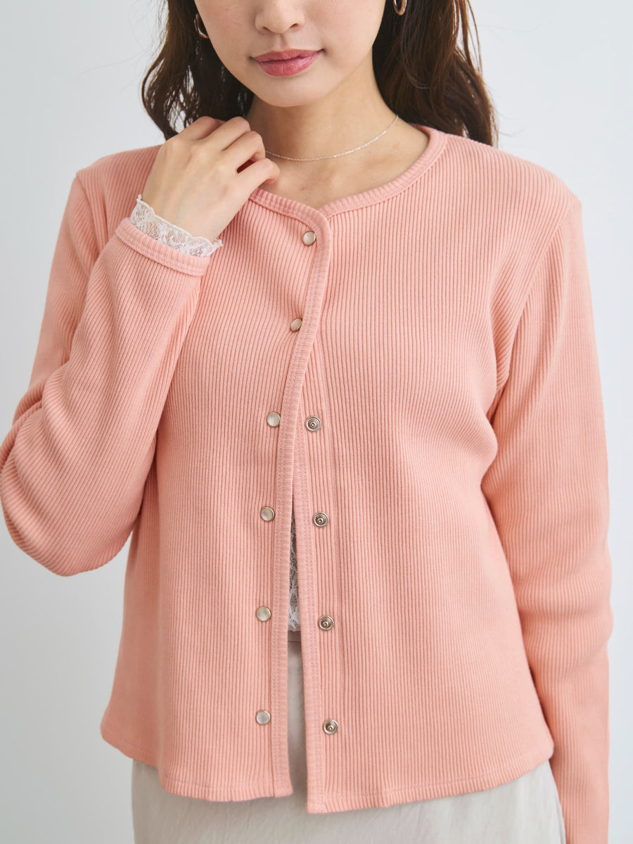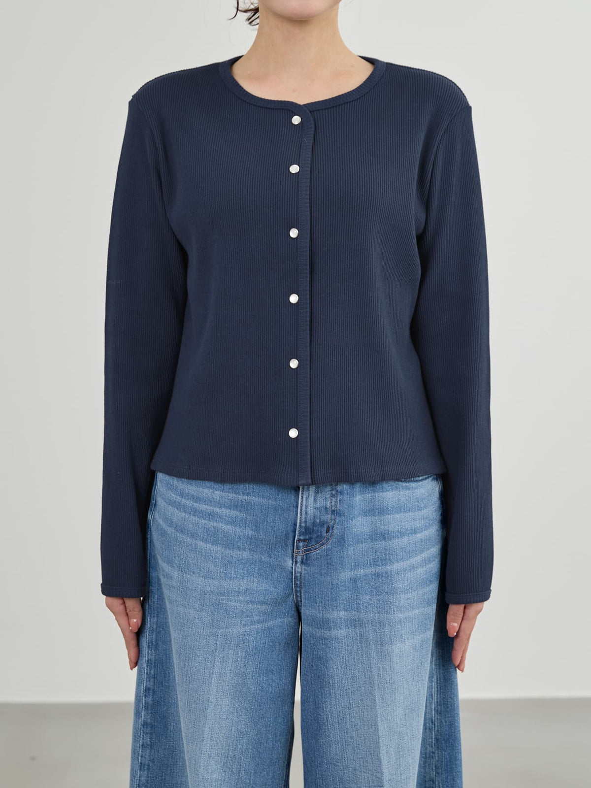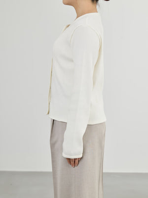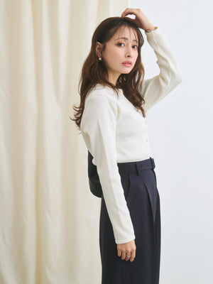 身体に馴染むコンパクトなサイズバランスと細かなリブが縦のラインをきれいに見せてくれ、すっきりとしたシルエットに。さりげなく丸みを帯びたネックラインは優しげな印象を演出します。パールのドットボタンがフェミニンなアクセントをプラス。