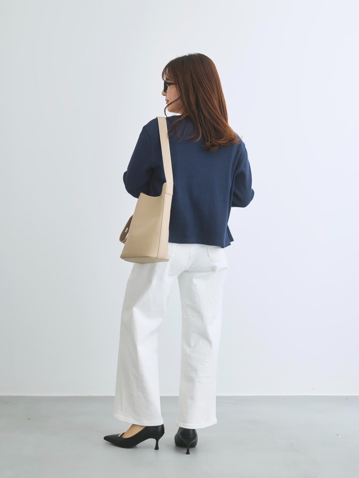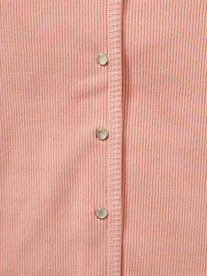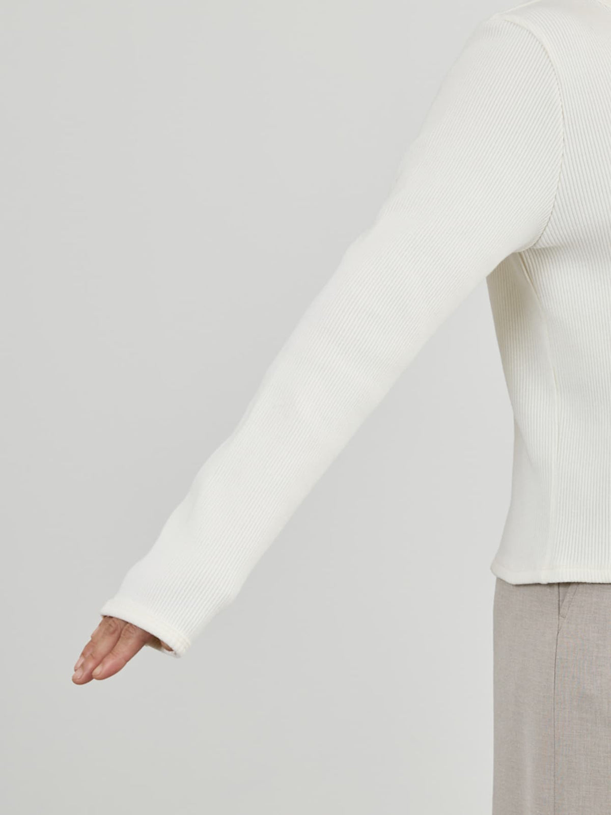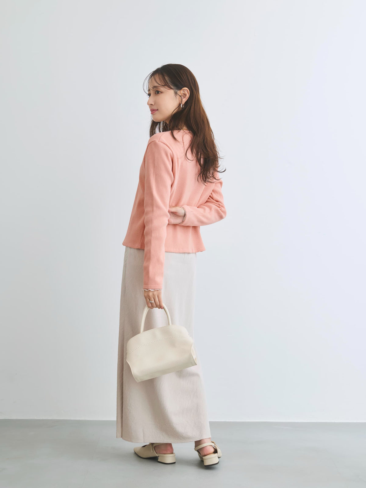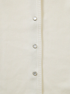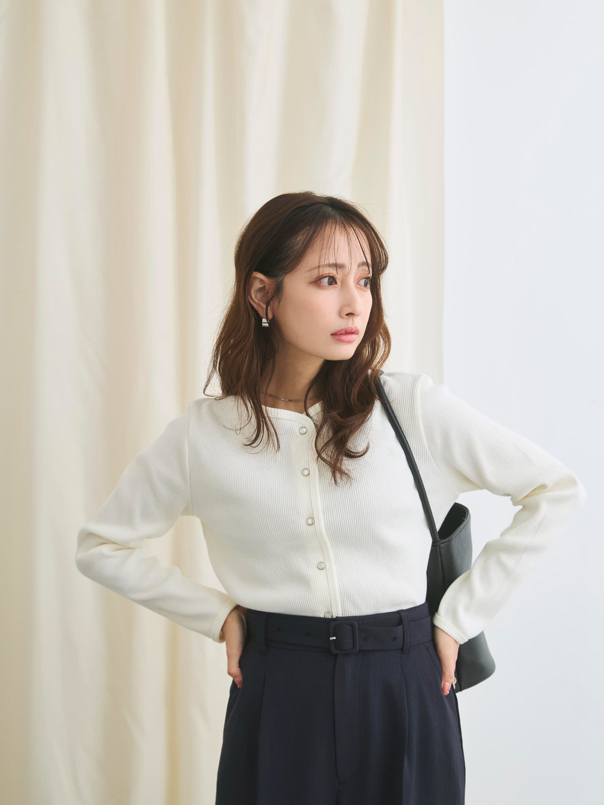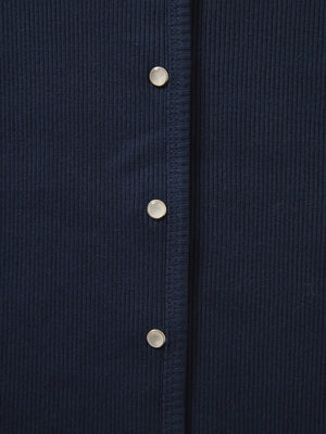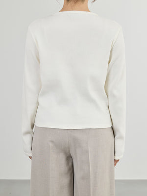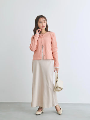 身体に馴染むコンパクトなサイズバランスと細かなリブが縦のラインをきれいに見せてくれ、すっきりとしたシルエットに。さりげなく丸みを帯びたネックラインは優しげな印象を演出します。パールのドットボタンがフェミニンなアクセントをプラス。