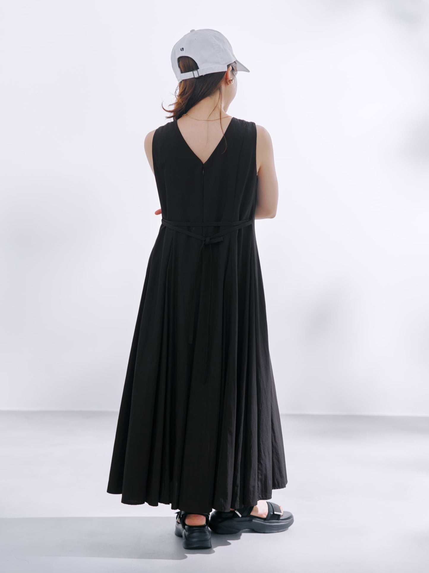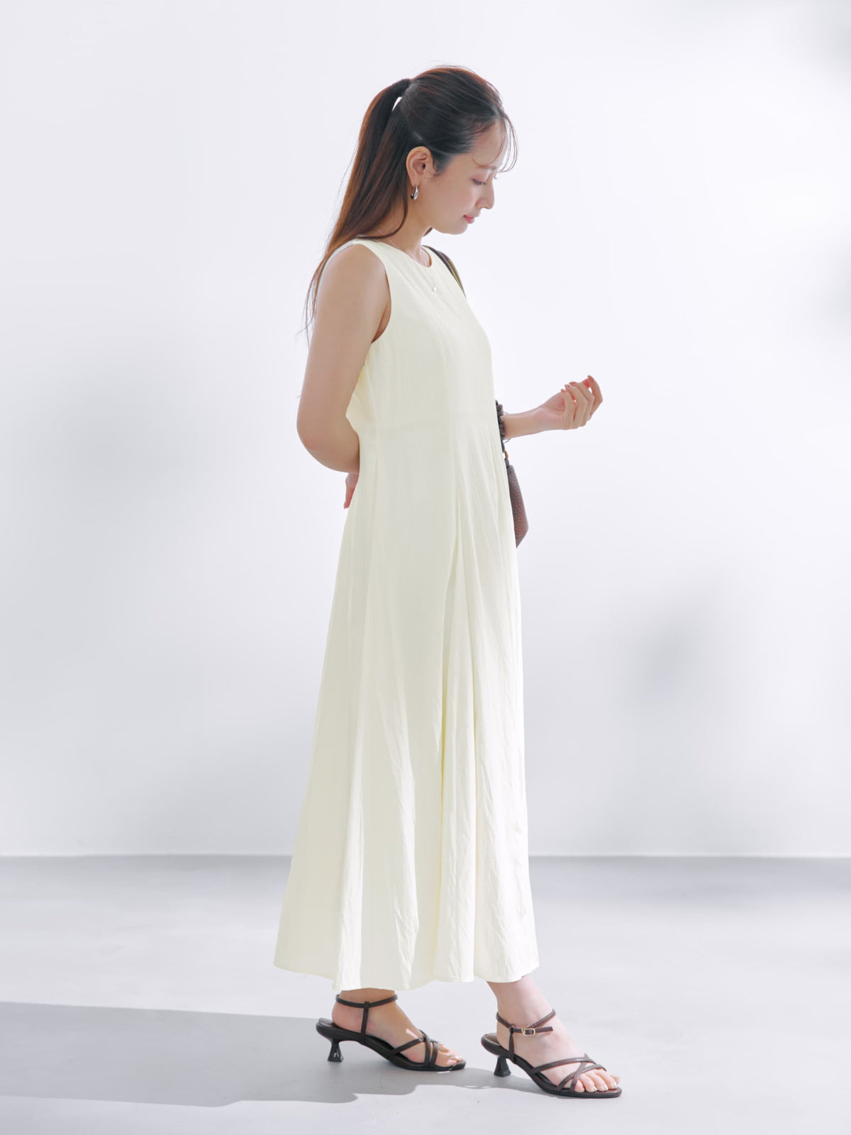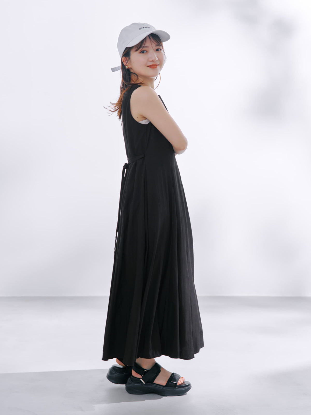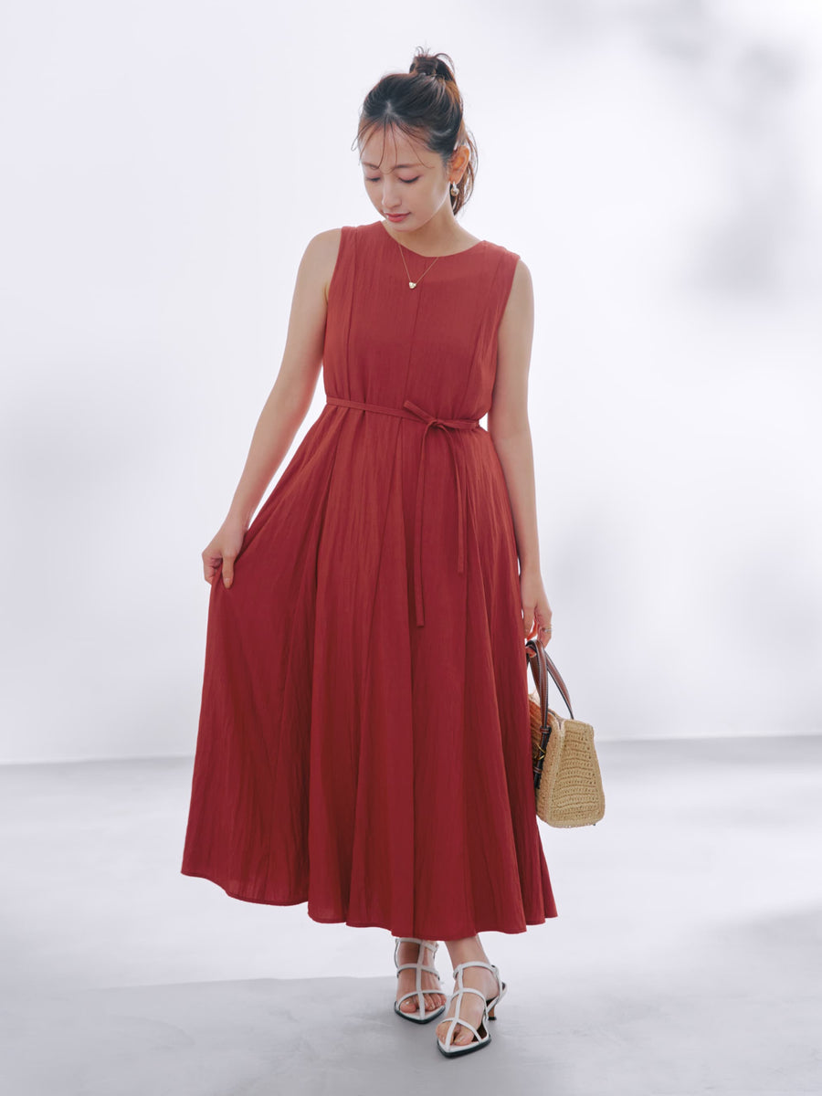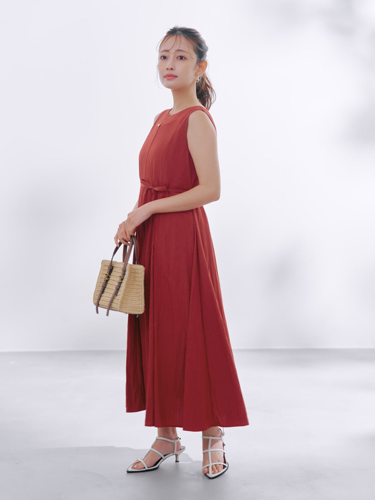 付属のリボンをつけているので、ウエストマークも。リボンを後ろで結ぶとよりすっきりとしたシルエットに。暖かい季節も涼しく乗り切れるノースリーブで、カーディガンやシャツなど羽織りやすいのもポイントです。