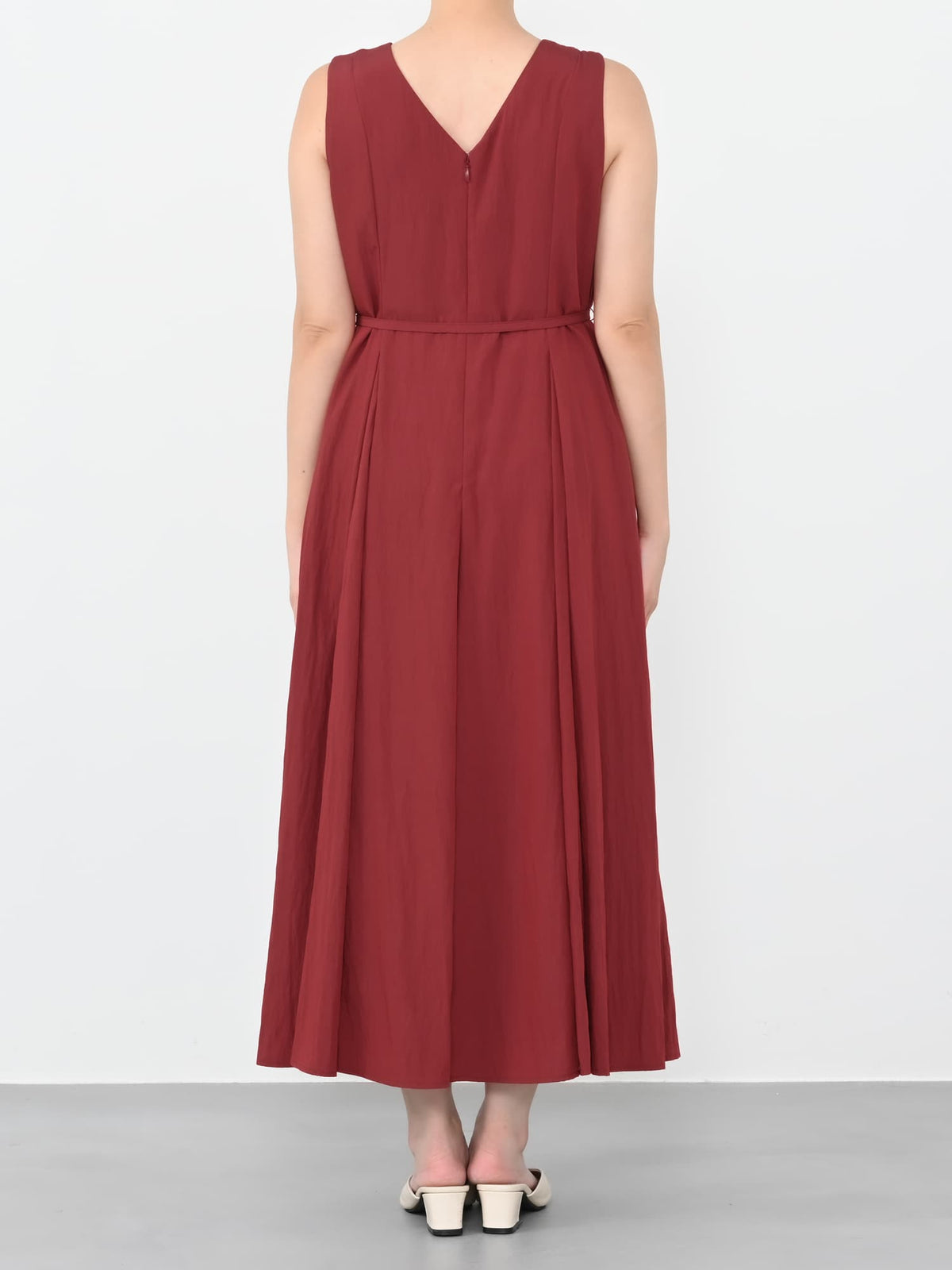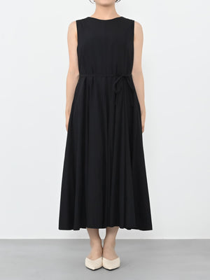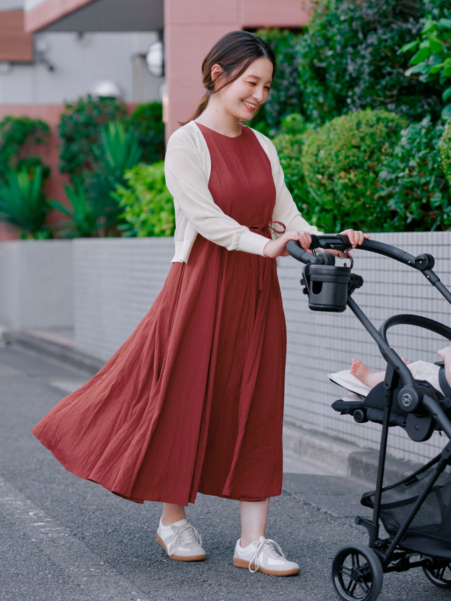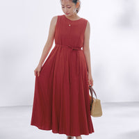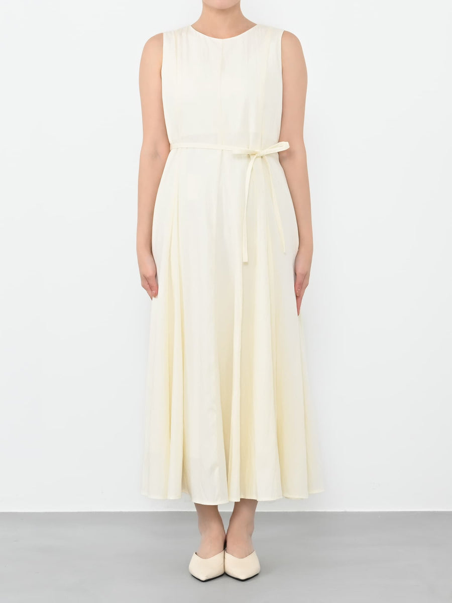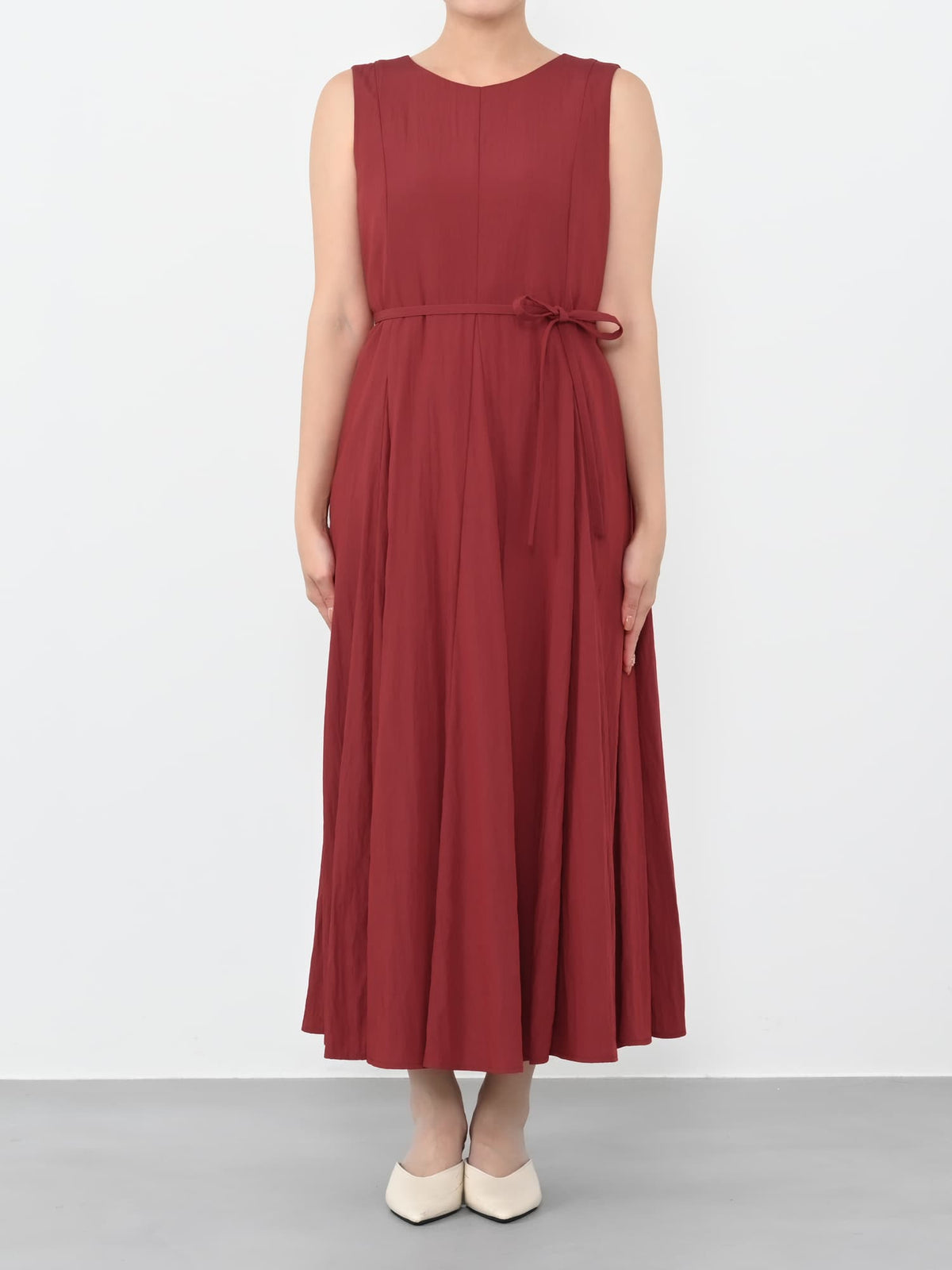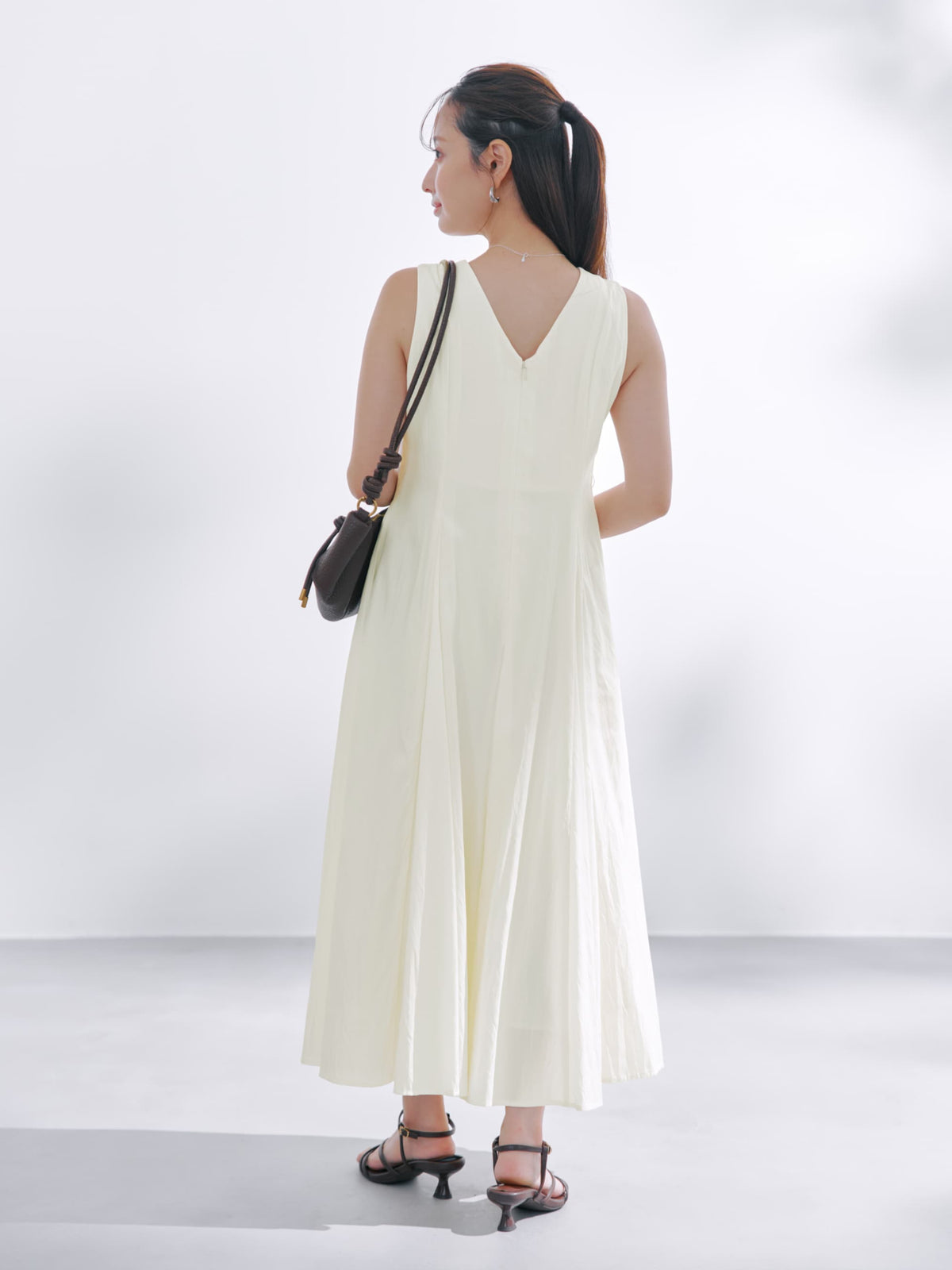付属のリボンをつけているので、ウエストマークも。リボンを後ろで結ぶとよりすっきりとしたシルエットに。暖かい季節も涼しく乗り切れるノースリーブで、カーディガンやシャツなど羽織りやすいのもポイントです。